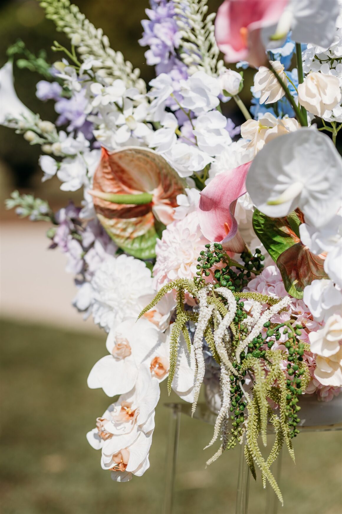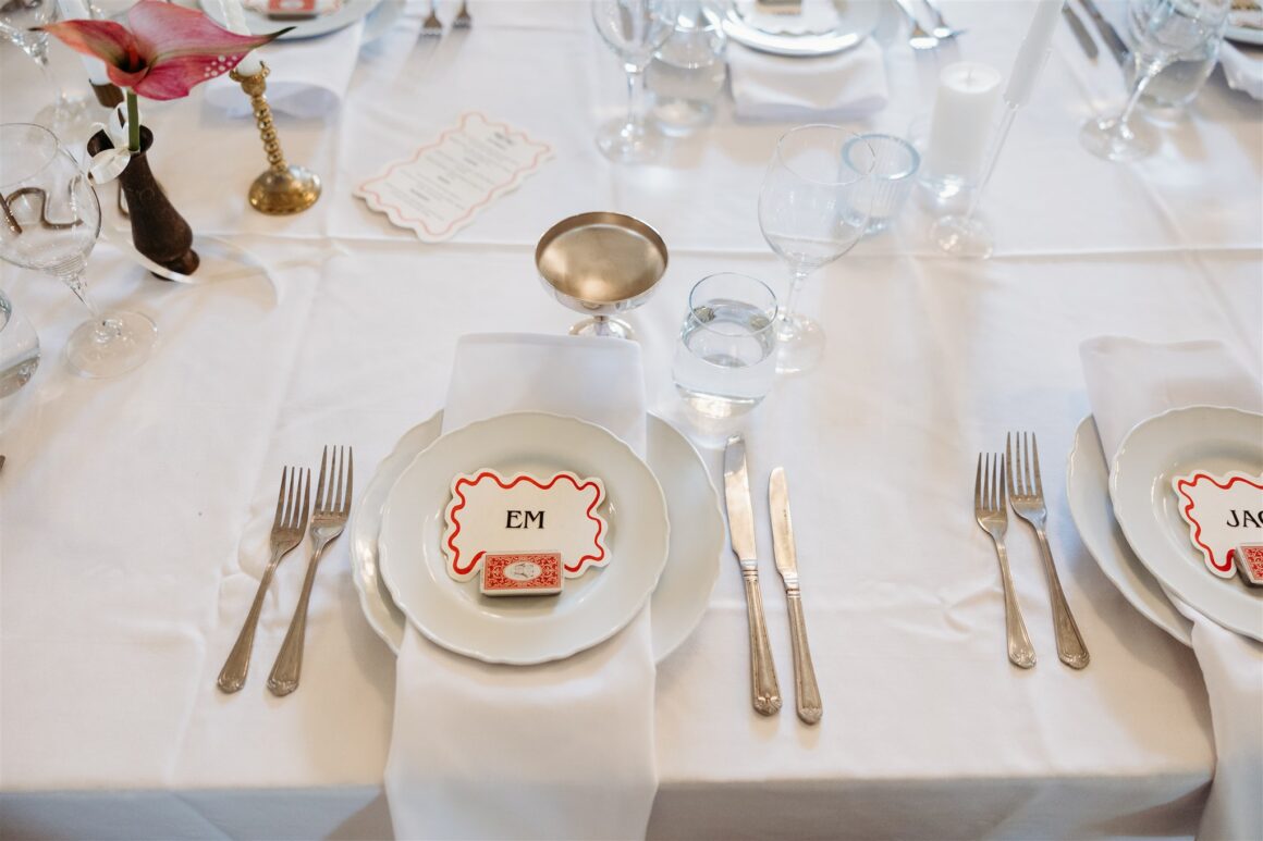 In addition to heartfelt snaps by Acacia + Grace Photography, scroll on for more deets on the couple’s table decor (feat. faux florals from Sonder + Stone Boutique), the bride’s elegant-yet-unconventional two-piece, and the groom’s great experience getting dressed with Joe Black.