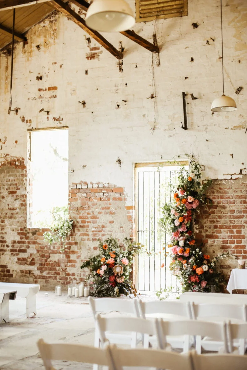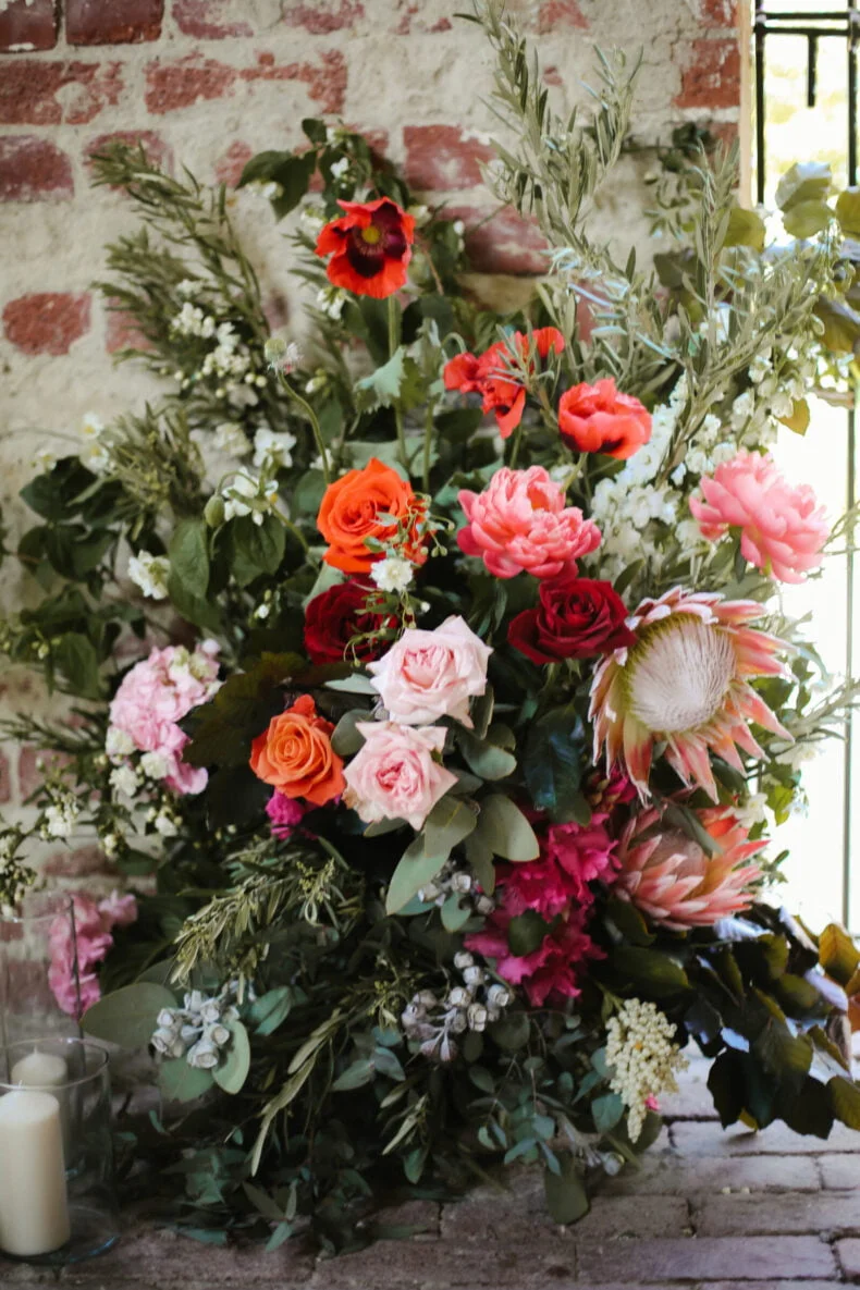 FAVOURITE DETAILS “Roses always hold a special place in my heart as they remind me of my Mum and how she loved spending time in the garden. One of the reasons we chose to be married on the cup weekend of November was because we were told the Butter Factory garden would ‘be really popping!’ Ame [Raven & The Rose] did an incredible job nailing the ‘gathered from the garden’ brief by incorporating some of Dad’s beautiful garden red roses from home into our bouquets and adding the most beautiful roses and bold peonies (my Mum’s and Pa’s favourite flower too) to our special bouquets, arrangements and wedding cake. This bright, peachy spring theme carried throughout to our signage, invites and table settings which featured vintage botanical imagery of peonies, roses and proteas as designed by my talented friend Kate.”