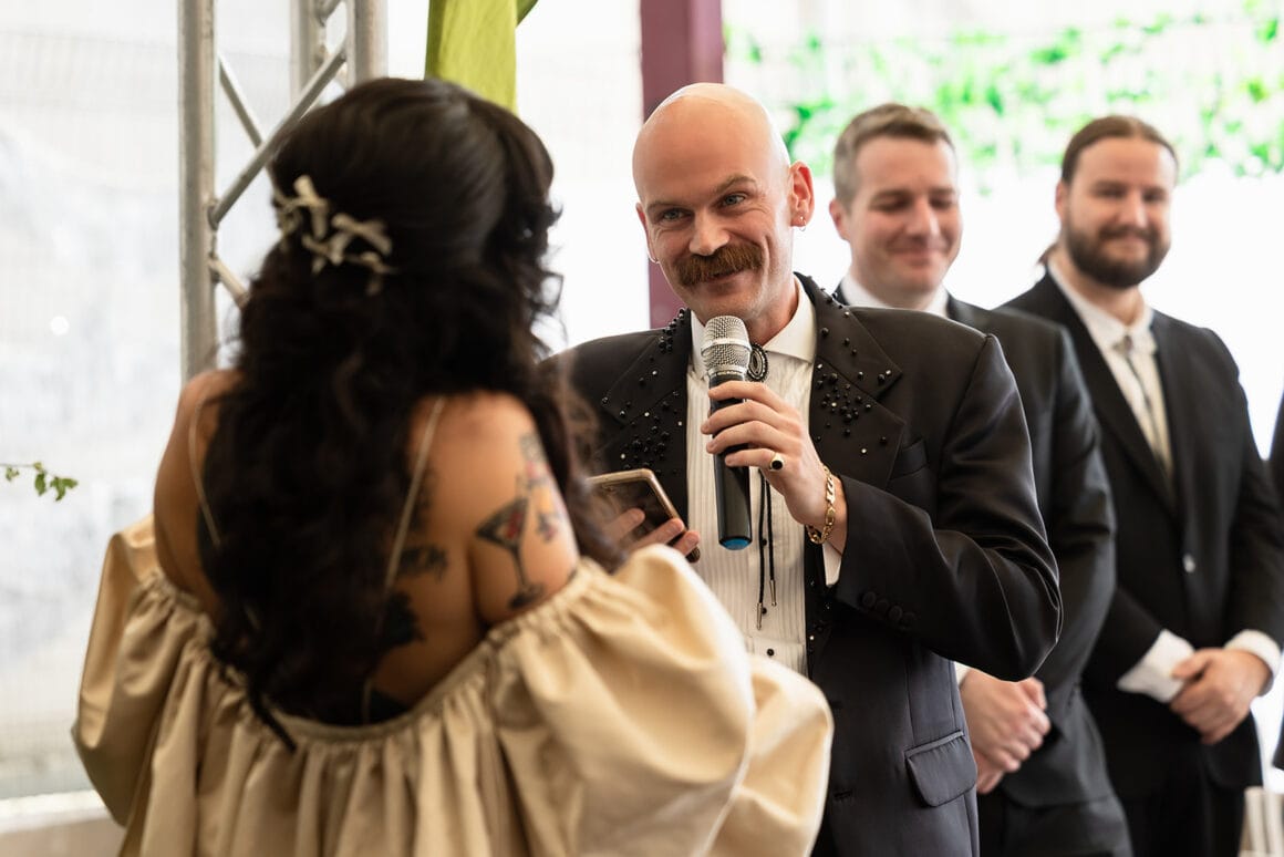 “I don’t know how I could pick one… I think maybe that first moment of coming out and seeing everyone there and Alex waiting for me. That gives me so much joy as just that image in my head. Also Alex’s vows. He isn’t big on the words but his vows were incredible. We actually had a rule about no phones out. But my mother being my mother, ignored it and did a sneaky one and filmed his vows, and I am so glad she did. I watch them all the time.”