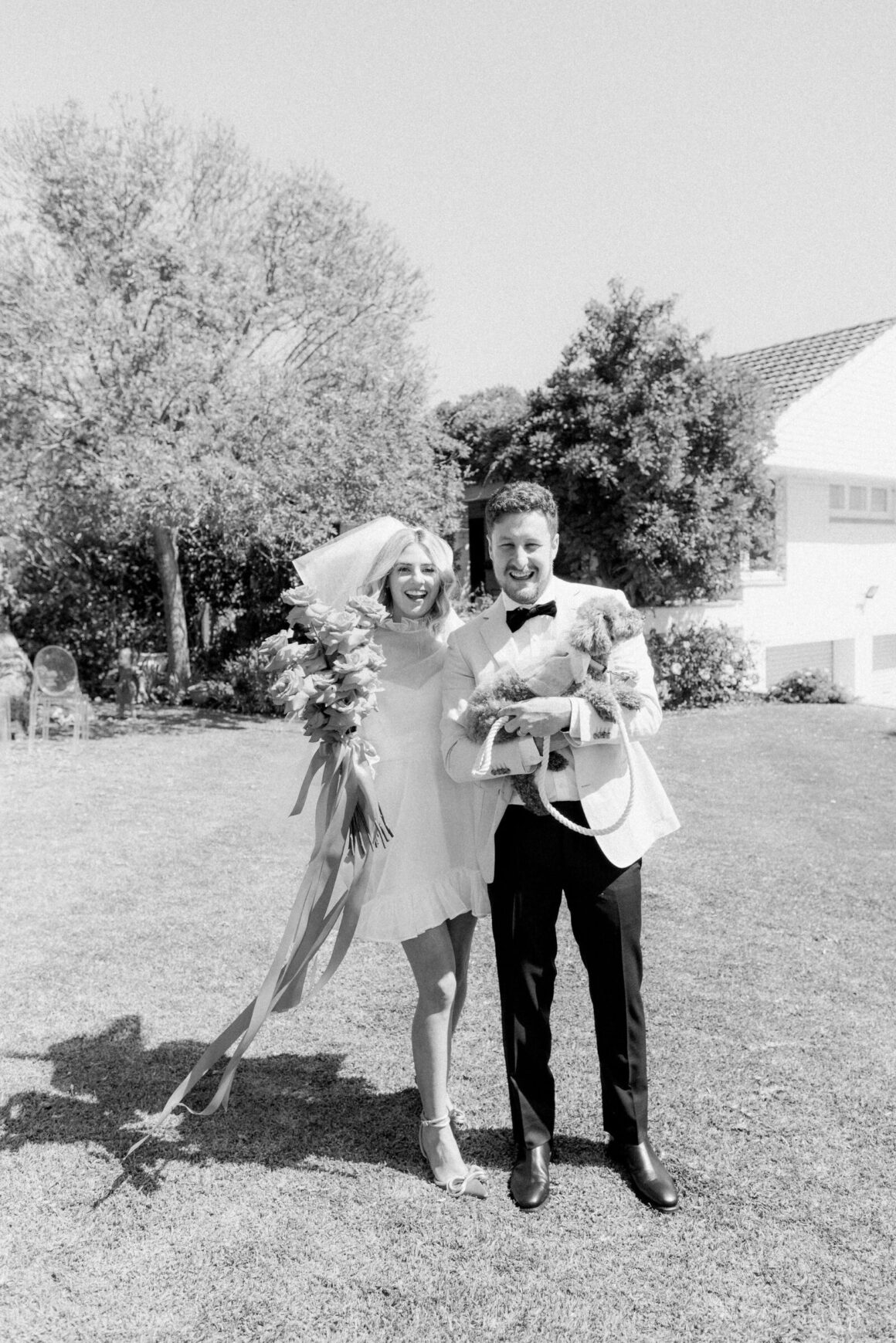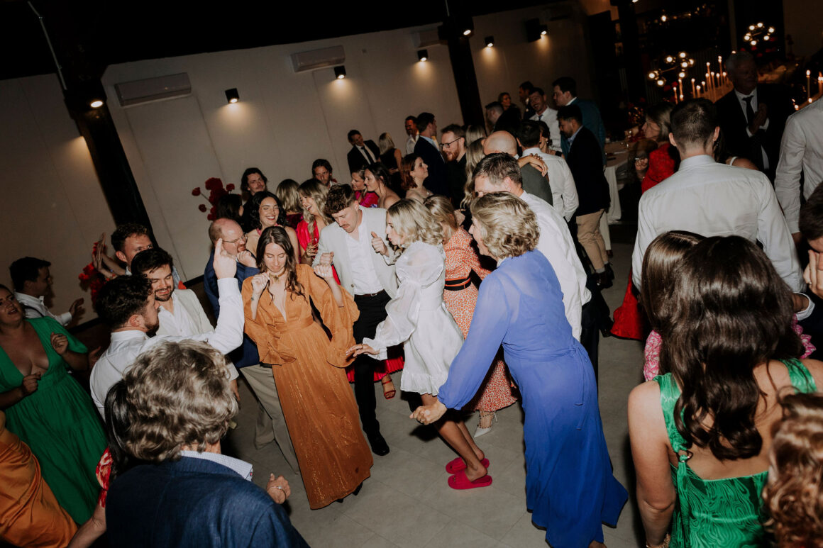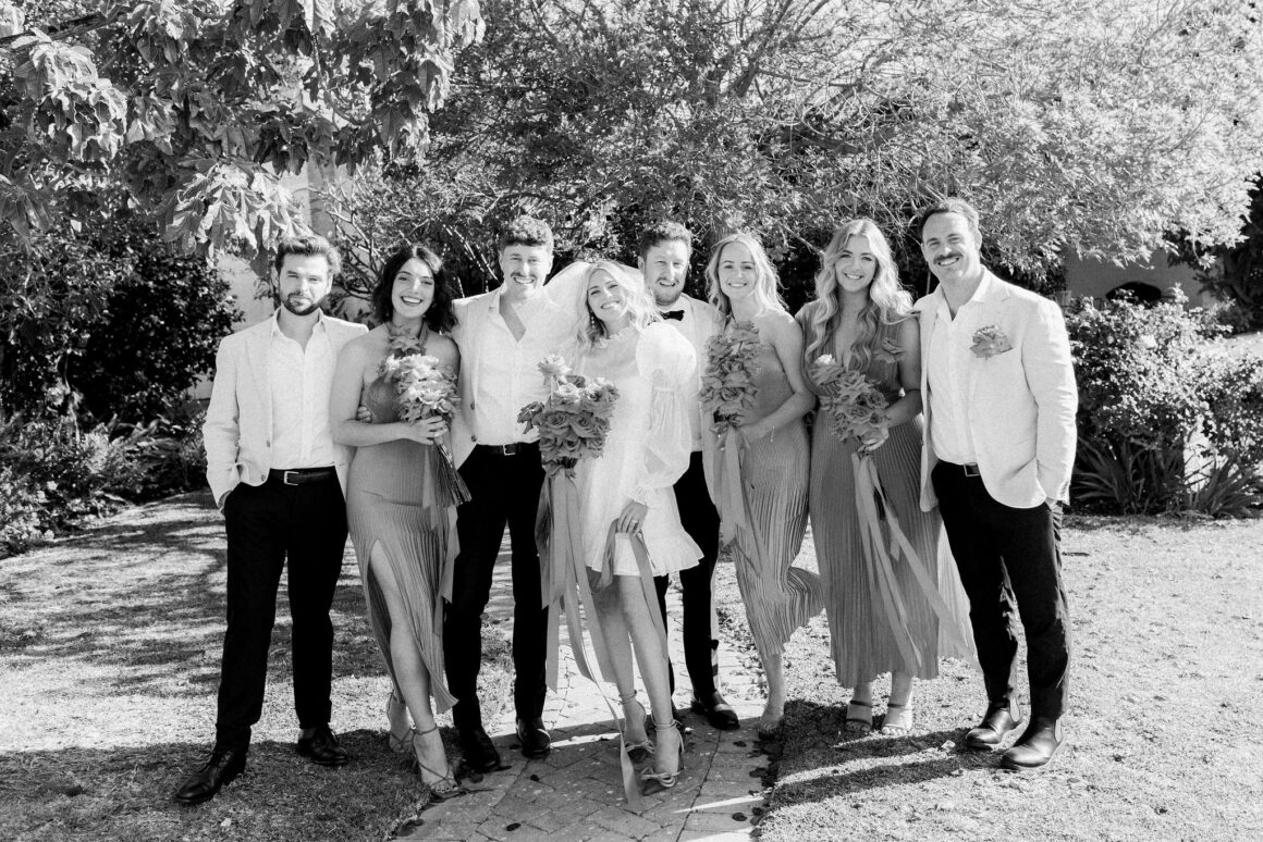 “It’s so hard to choose our favourite details from our day, it was jam-packed with entertainment, colour and of course our nearest and dearest. But our top highlights would have to be Mark Turner, the saxophonist, sneaking onto the dancefloor playing ‘Fireball’ by Pitbull whilst the waitstaff brought out trays of fireball shots. Mcdonalds cheeseburgers being delivered at 11pm for a late night snack (always a must). But the most special moment would have to be getting married in the beautiful front garden of our home in Dalkeith, once my grandmother’s home, who spent countless hours (if not days, months, years) on the beautiful garden. We invited our whole bridal/groom party to get ready together, which created such a relaxed atmosphere which we loved. We also had a private ceremony with our bridal party and immediate family, to spend time with all of them before we jetted off to our reception party at 3six5 Event Space.”