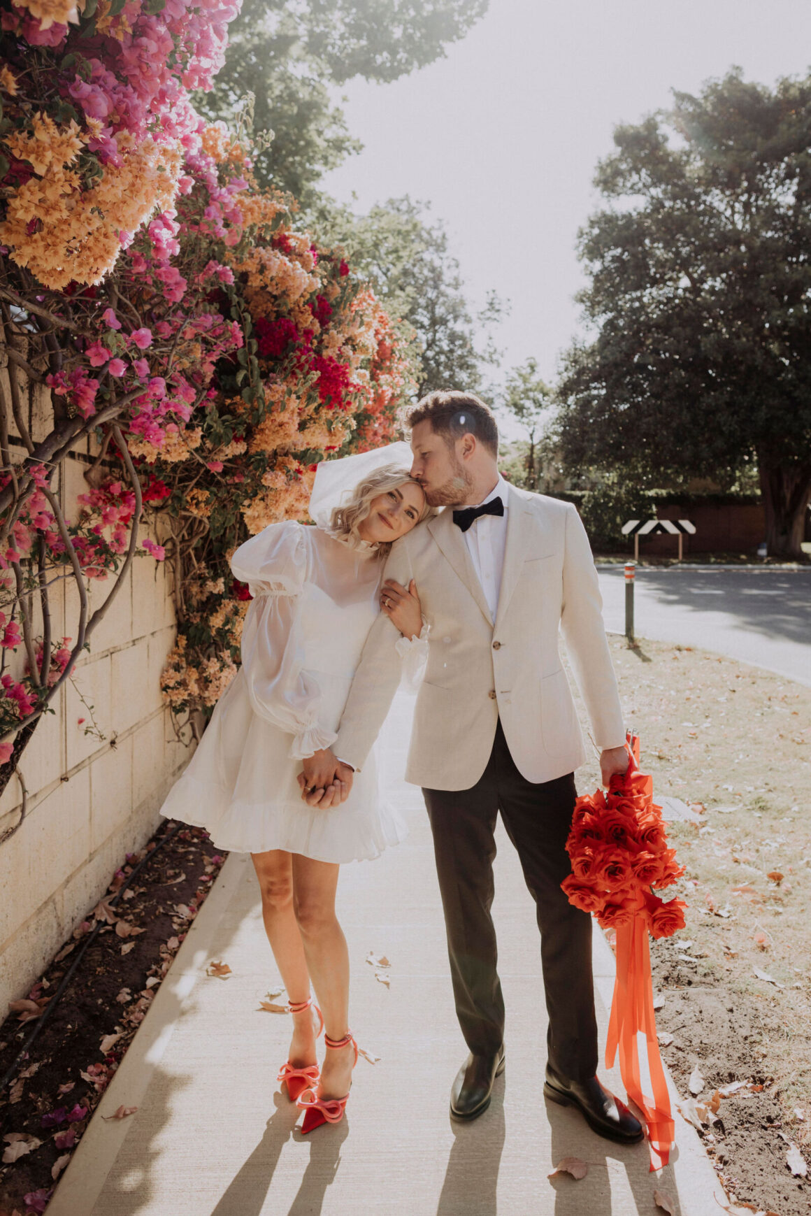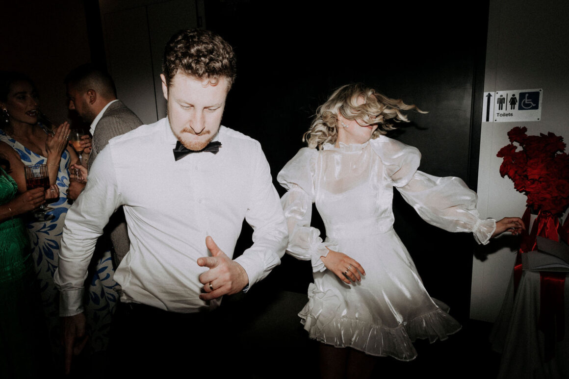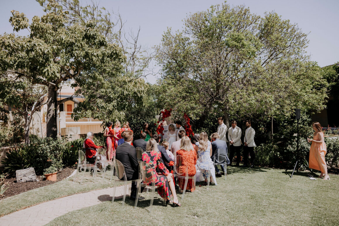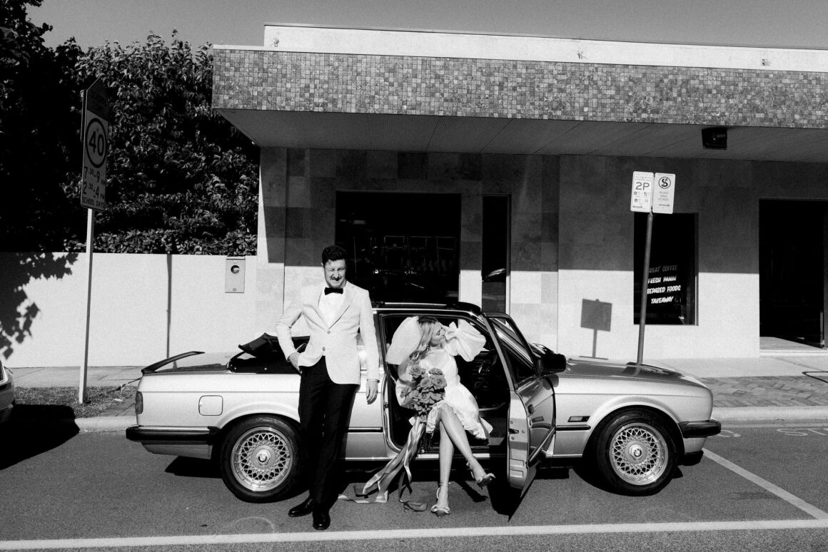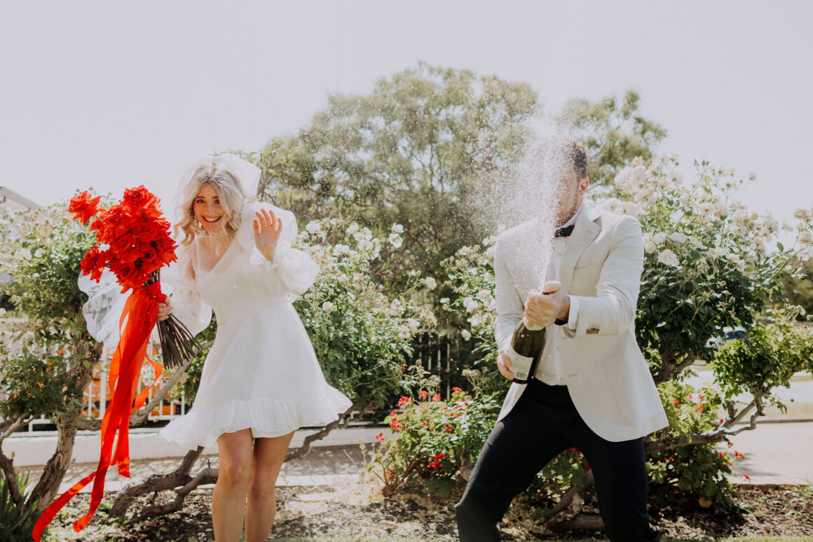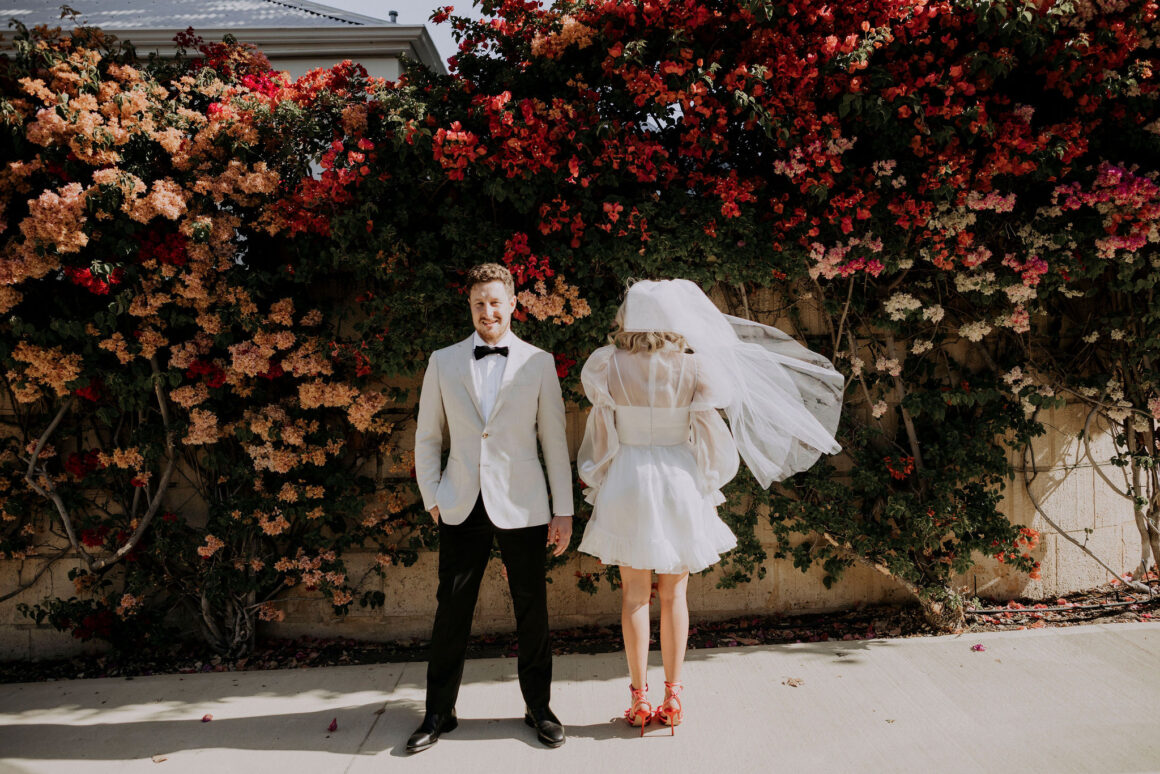 This bride (wearing a mini lovingly made by her friend) and groom (in M.J. Bale) got hitched in the front garden of their West Perth home. Following these intimate ‘I do’s, the revelry continued at 3six5 Event Space—a night featuring fireball shots, late-night Maccas and plenty of entertainment.