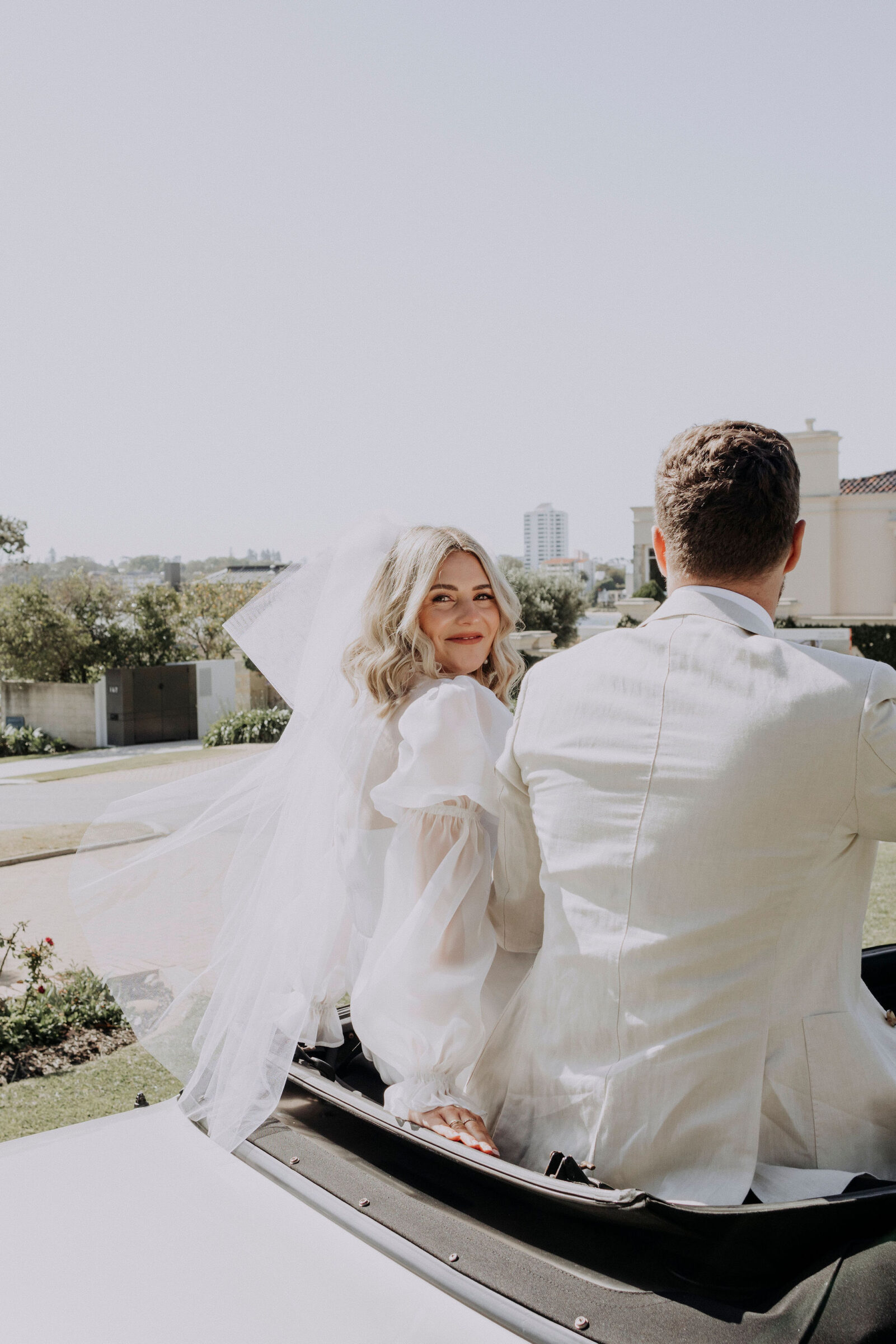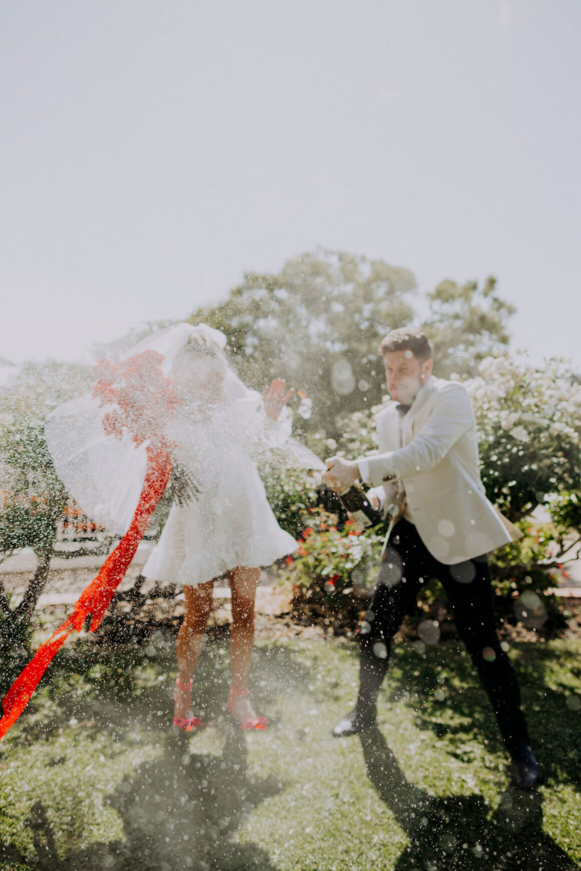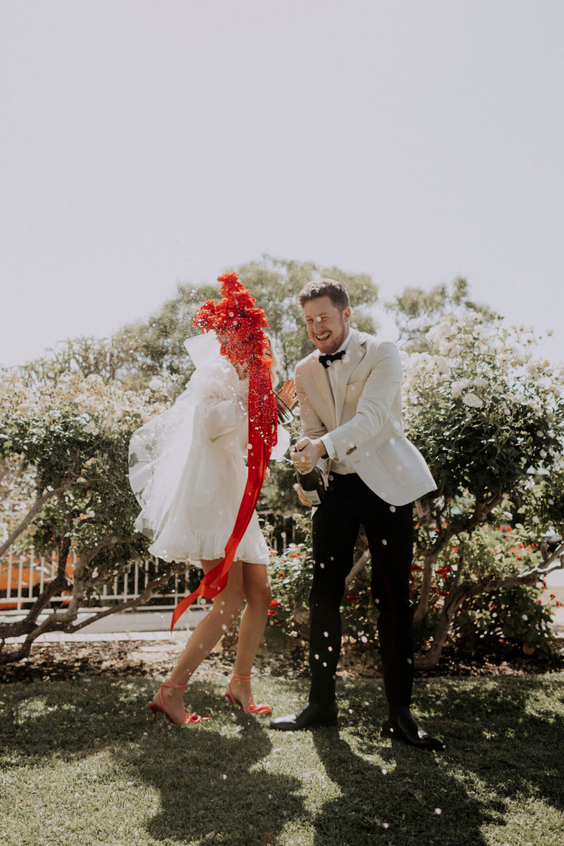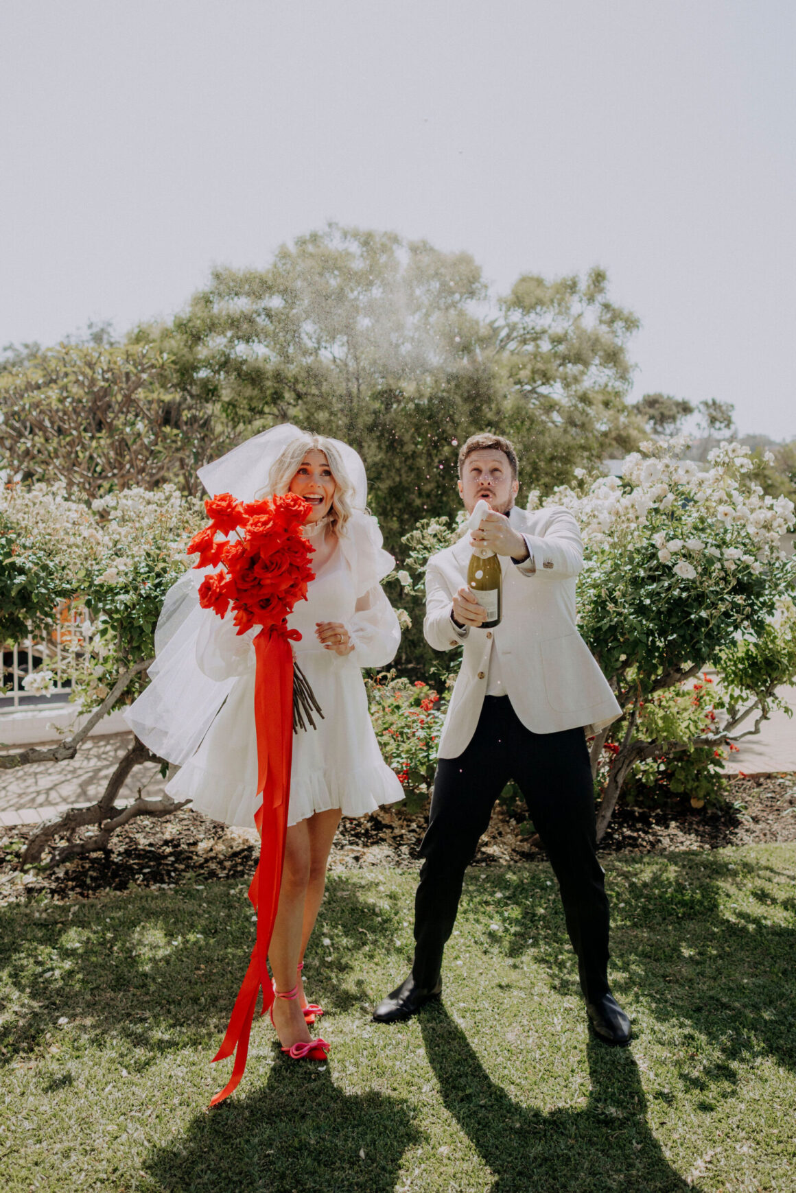 This bride (wearing a mini lovingly made by her friend) and groom (in M.J. Bale) got hitched in the front garden of their West Perth home. Following these intimate ‘I do’s, the revelry continued at 3six5 Event Space—a night featuring fireball shots, late-night Maccas and plenty of entertainment.