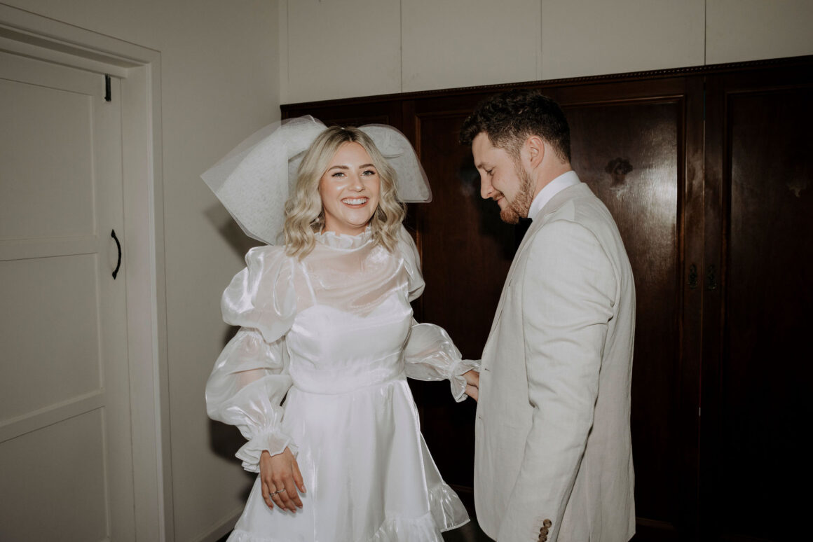 “My dress was made by my beautiful friend Erin Mirnevini, which made it that much more special! I had always envisaged a short/mini dress for my wedding, Erin created that and much more! The dress is a mix of lots of different styles that I love, which we then encapsulated to make my perfect dress. Puffy sleeves, hidden pockets, shimmering fabric for when the party began and even the thoughtful detail by Erin for my something blue of L+G hand stitched in blue hidden on the inside of my dress against my heart. It was all beyond perfect and SO comfortable.”
