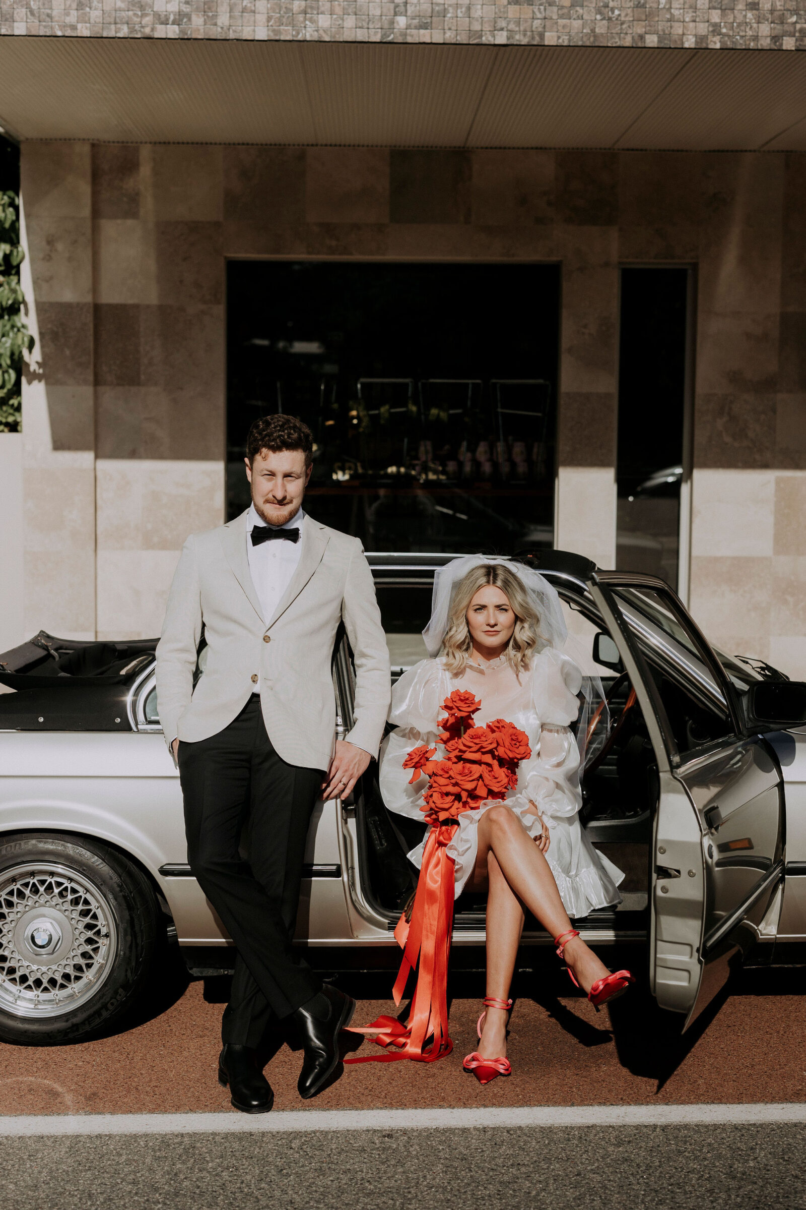 This bride (wearing a mini lovingly made by her friend) and groom (in M.J. Bale) got hitched in the front garden of their West Perth home. Following these intimate ‘I do’s, the revelry continued at 3six5 Event Space—a night featuring fireball shots, late-night Maccas and plenty of entertainment.
