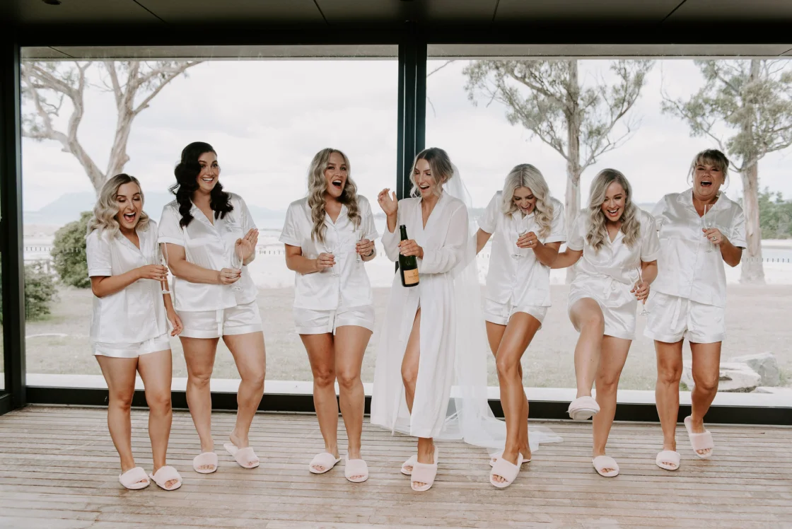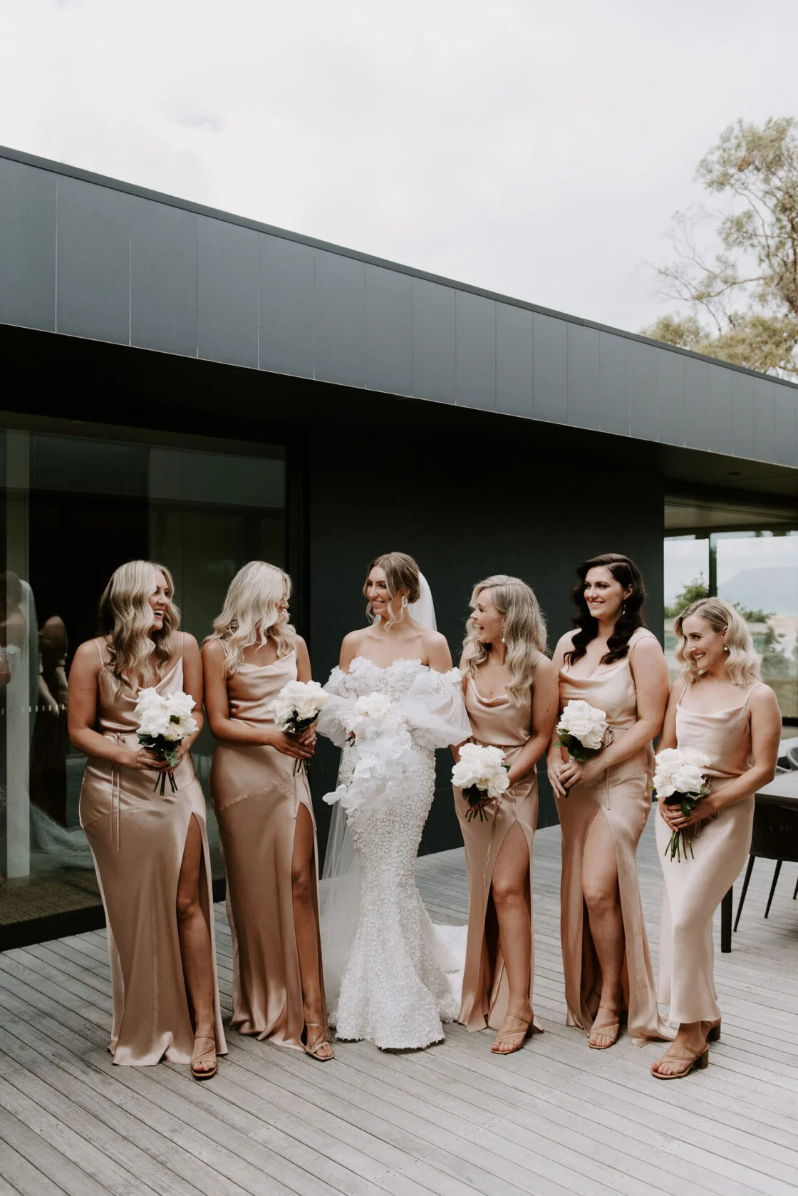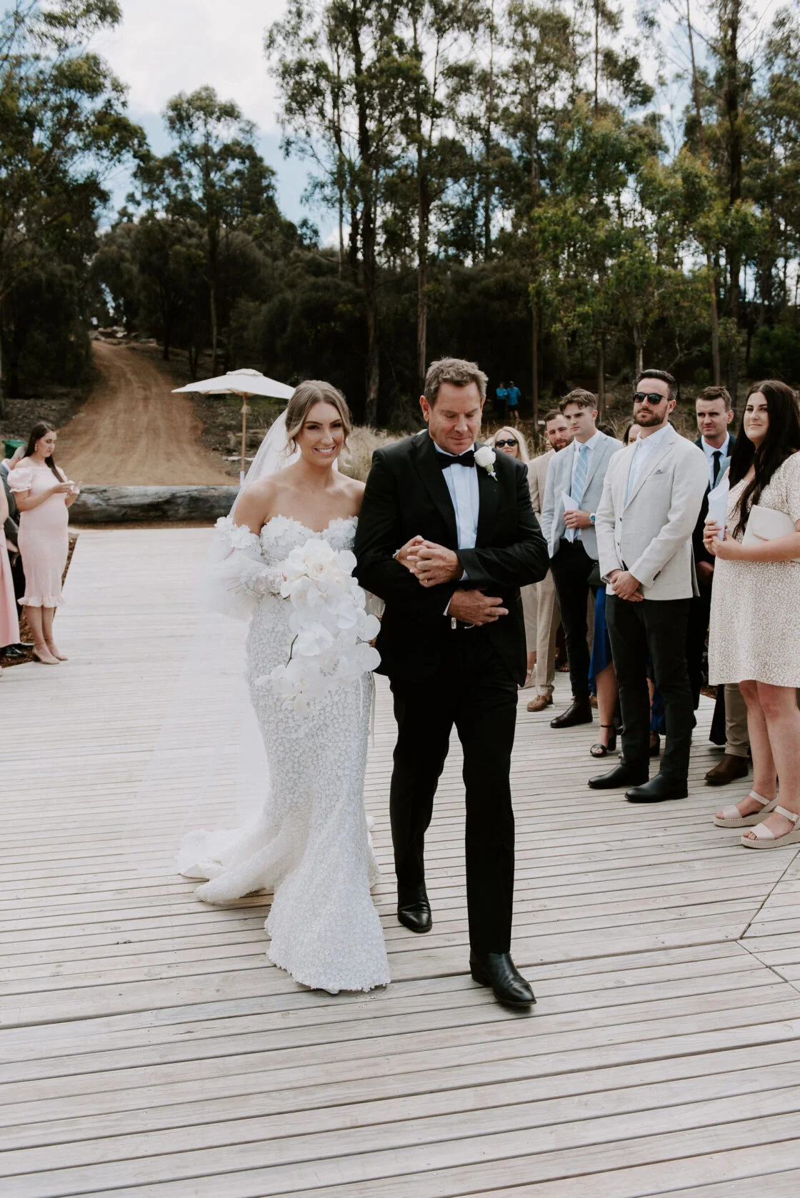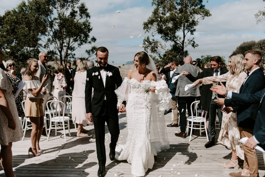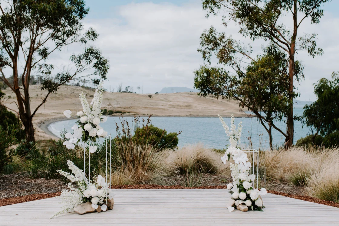 CONTRIBUTING VENDORS Photographer Sophie Sullivan Photography Cinematographer Light Noise Films Florist The Floral Criteria Stationery & Signage Lucy Gott Ceremony & Reception Spring Bay Mill Catering & Espresso Martinis Sabre Catering and Events Champagne Tower Joseph Burton Wines Beverages Spring Bay Mill Cake Honey Cake Co Hire Items BW Events (bentwood ceremony chairs), Artaud & Co (white flower stands) Entertainment Baker Boys Band Celebrant Simone Taylor Rings Claudia Jewellers THE BRIDE Gown Pallas Couture Veil Luxe Robes Dear Love Shoes Wittner Accessories Lolita’s Pearls (earrings), Dear Love (denim jacket) Hair Rebel at Heart Hair Boutique Makeup Liv Rodgers Skin Preparation Sanctum Medical Bridesmaid dresses Shona Joy Bridesmaid shoes Billini Bridesmaid gifts Sanctum Medical THE GROOM Suit Harrison & Miller Shirt & Bow Tie Les Lees Cufflinks Claudia Jewellers Shoes R.M.Williams Barber Monks & Co Groomsmen suits Les Lees