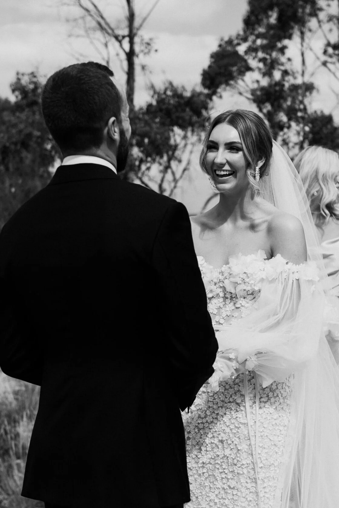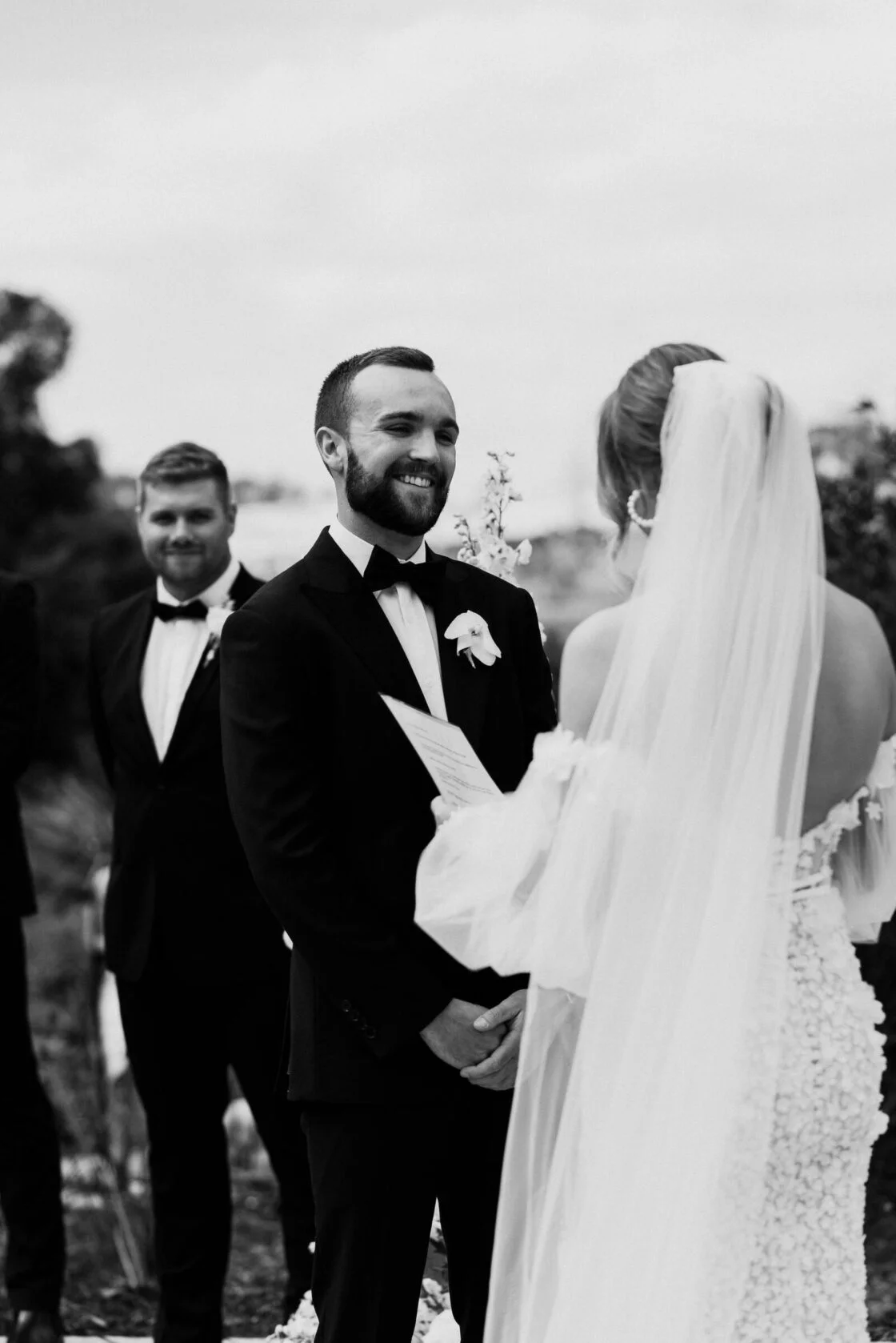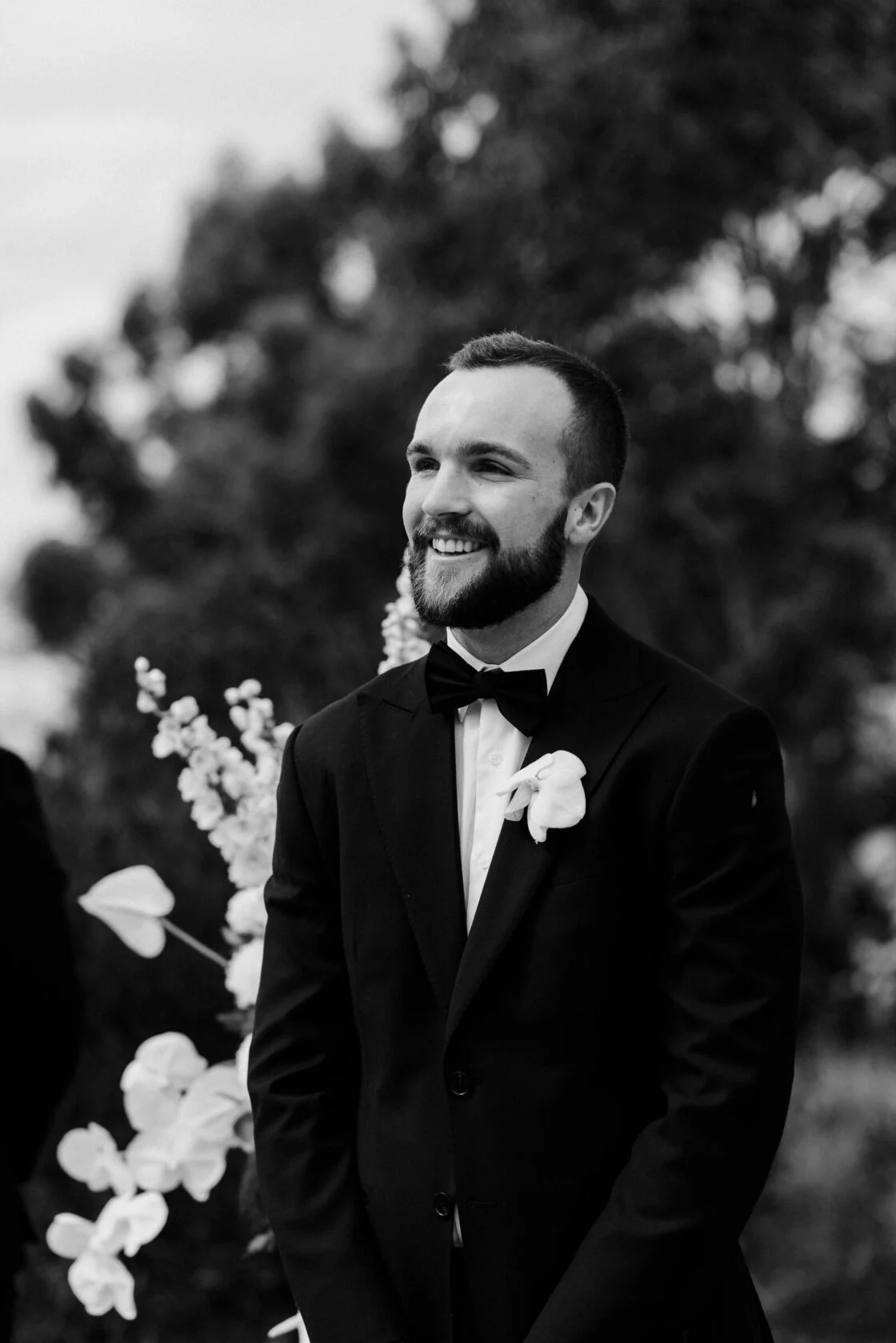 THE THEME “I wanted the day to be timeless and classic. The theme was black and white with an element of neutral tones. The florals were mostly white with some greenery and neutral tones to incorporate the beautiful surrounding of bushland contrasted with the ocean. We also asked our guests to dress for a sophisticated soiree in subtle tones.”