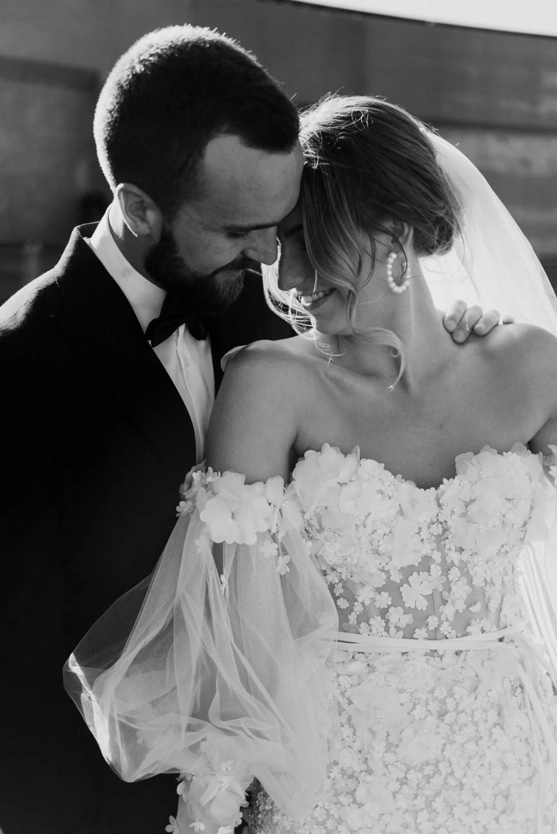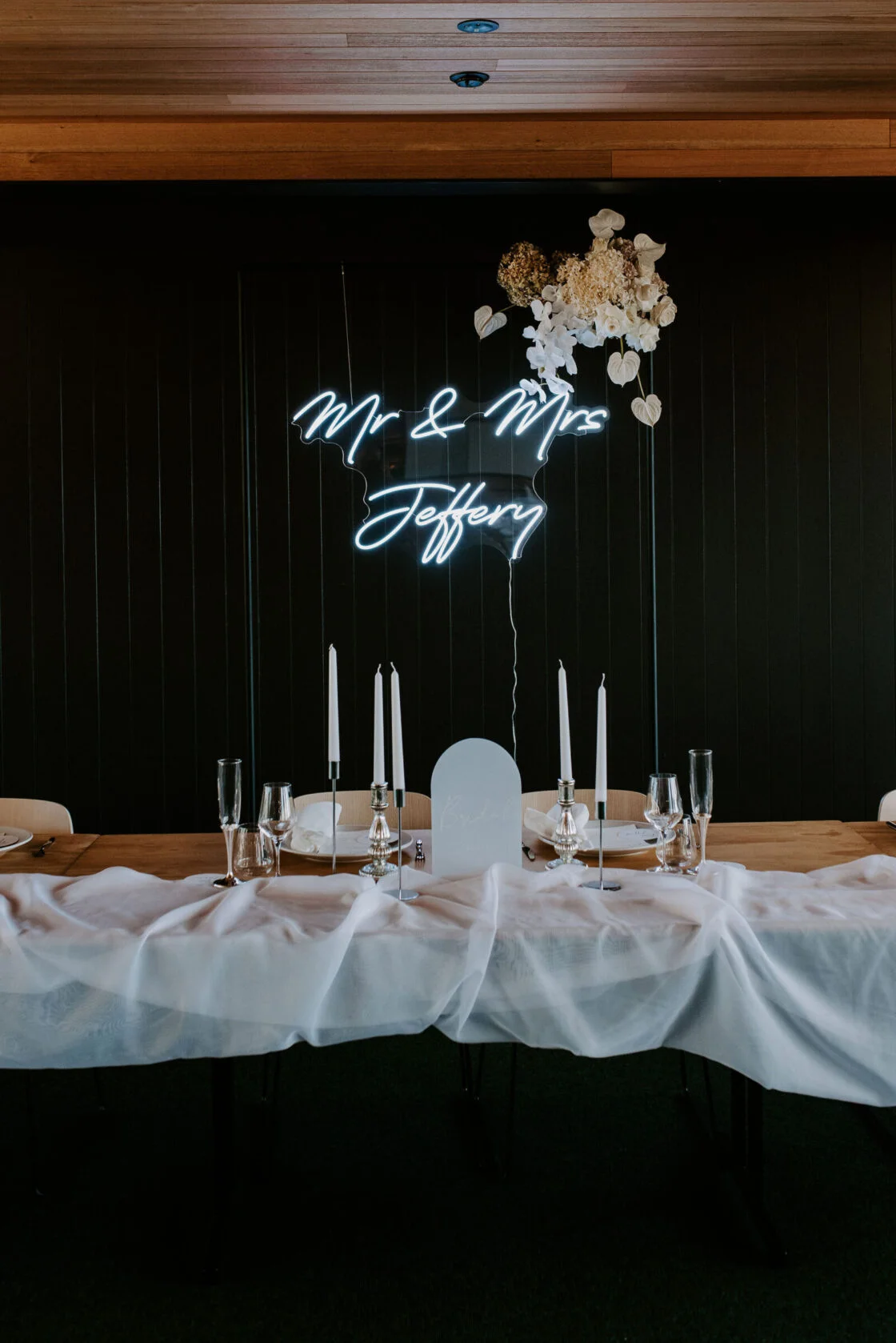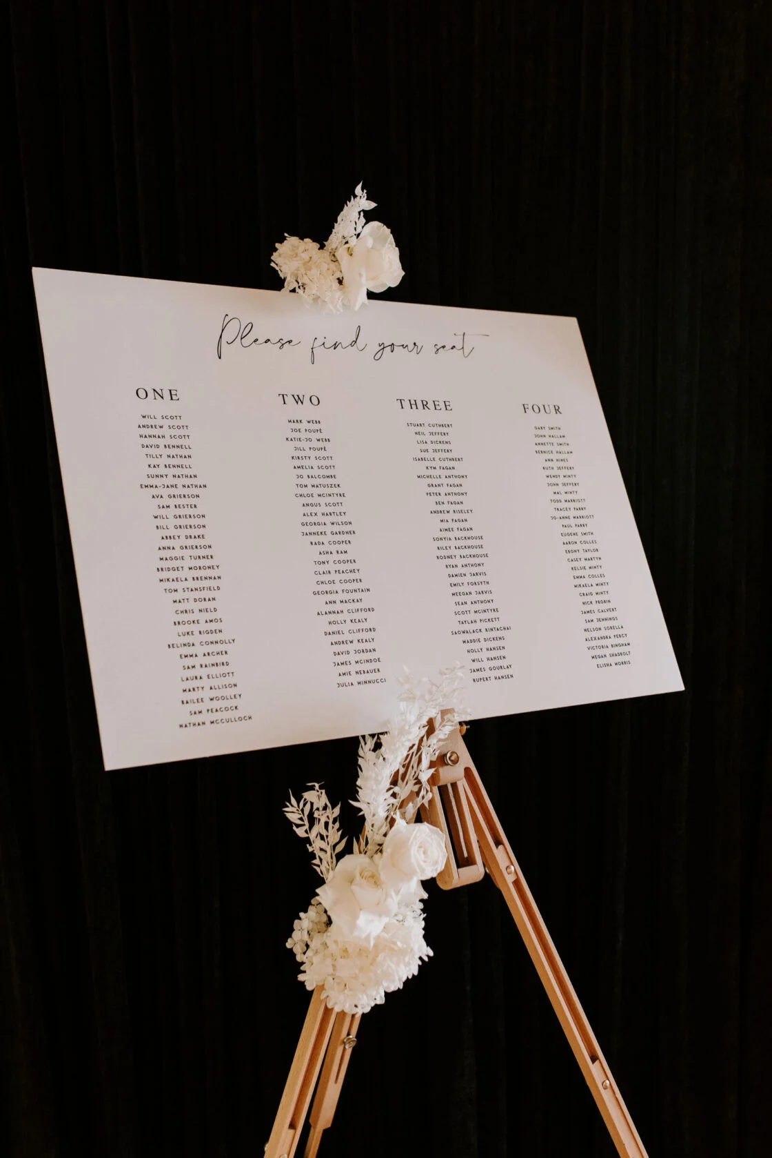 THE THEME “I wanted the day to be timeless and classic. The theme was black and white with an element of neutral tones. The florals were mostly white with some greenery and neutral tones to incorporate the beautiful surrounding of bushland contrasted with the ocean. We also asked our guests to dress for a sophisticated soiree in subtle tones.”