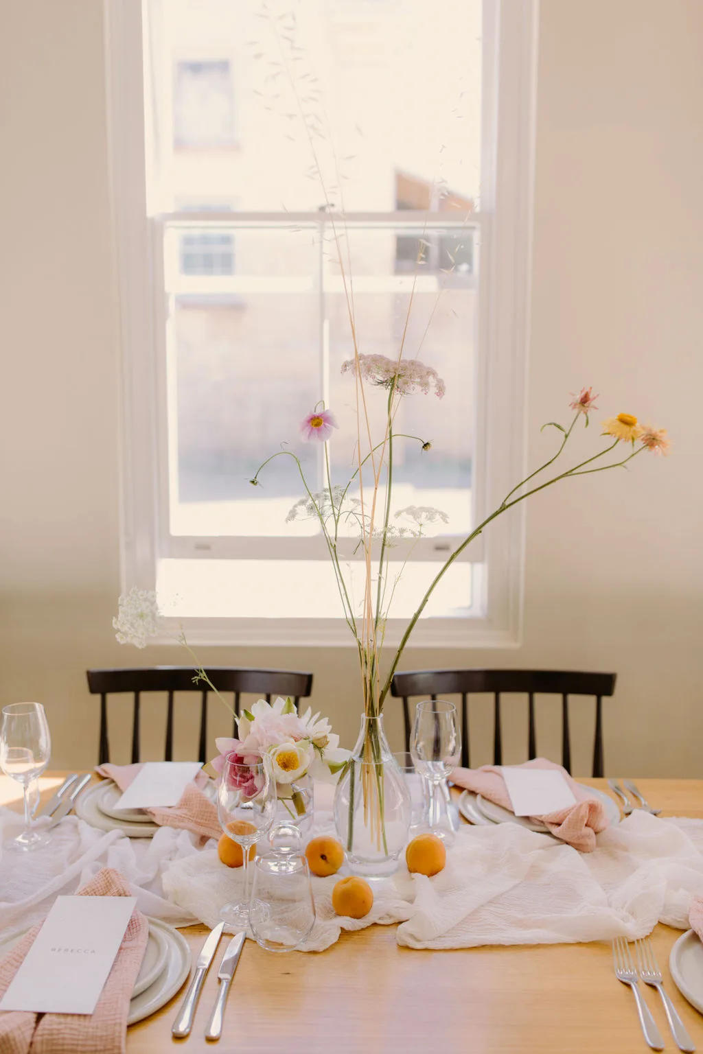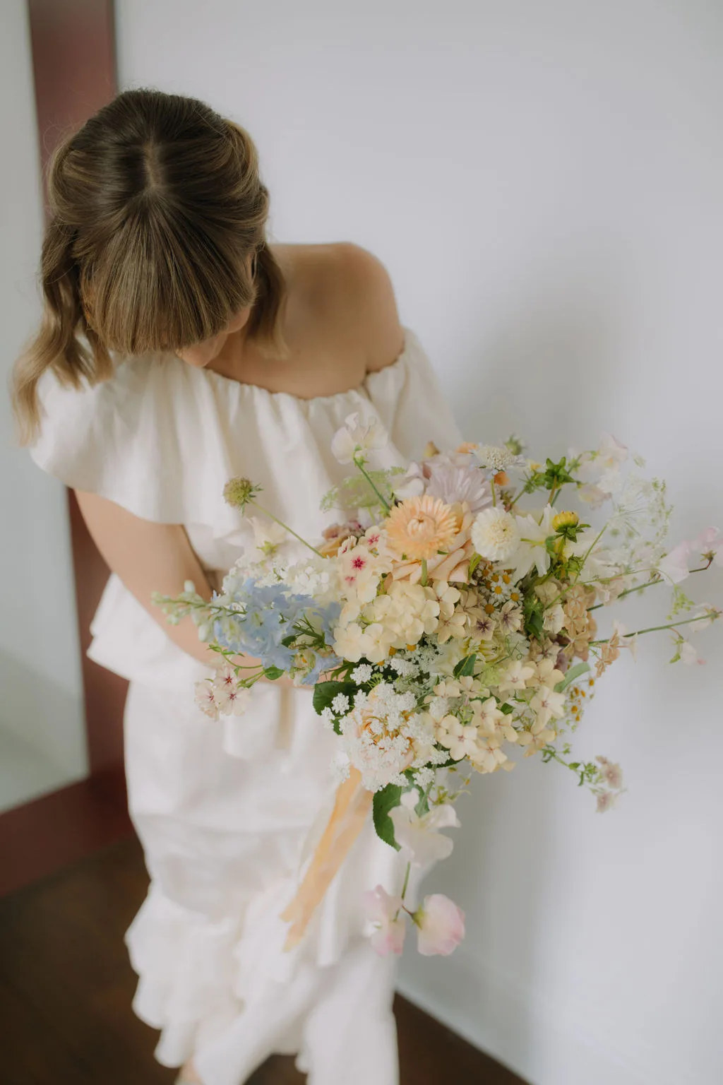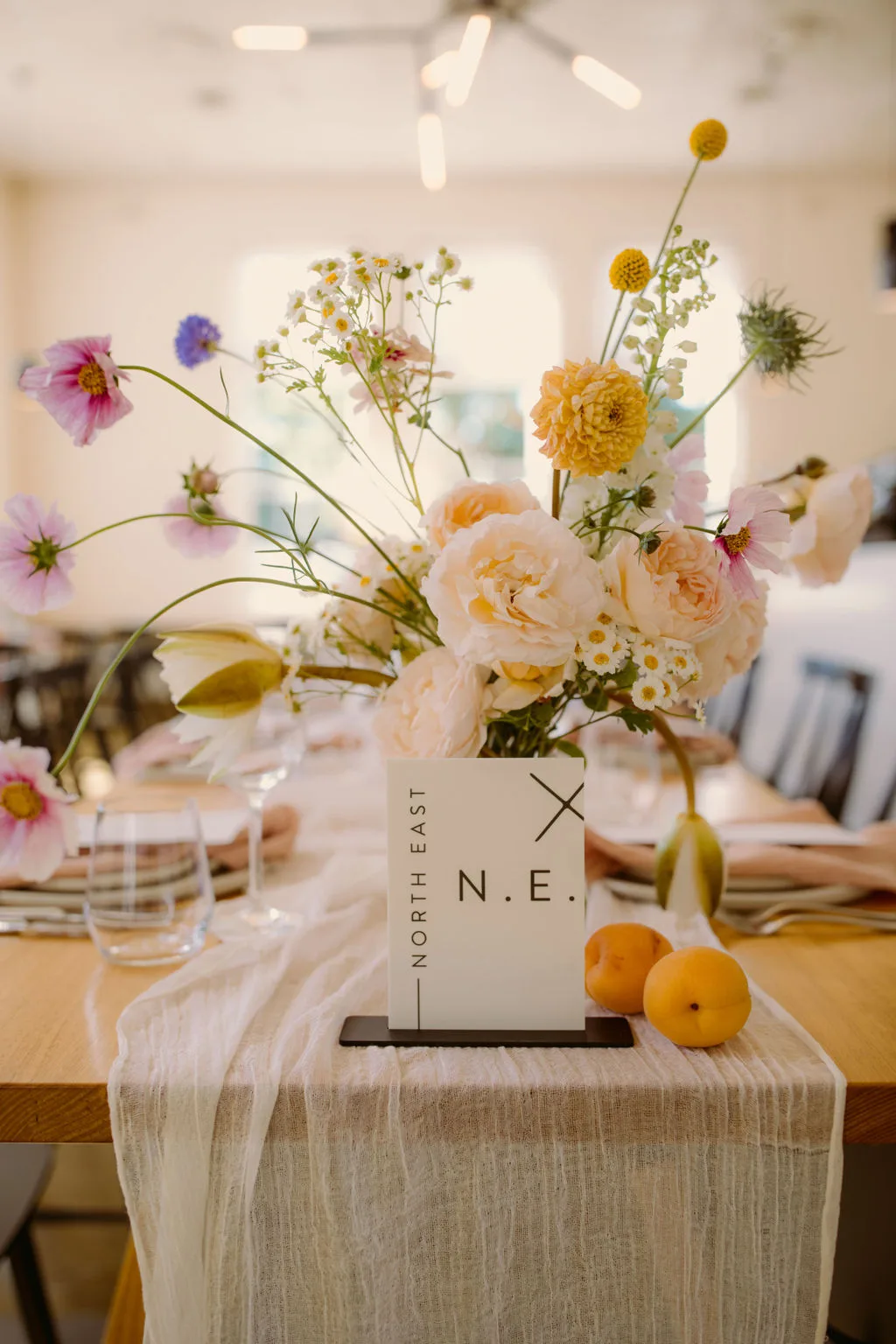 THE VIBE “We really tried to keep everything as local and Tasmanian as possible, do fewer things and do them well, and minimise our wedding footprint. We also just loved The Phasmida Room at Agrarian, particularly the mustard/gold linoleum, which inspired the yellows and golds in the florals. Summer in Tasmania is just a dream, and we wanted to celebrate that.”