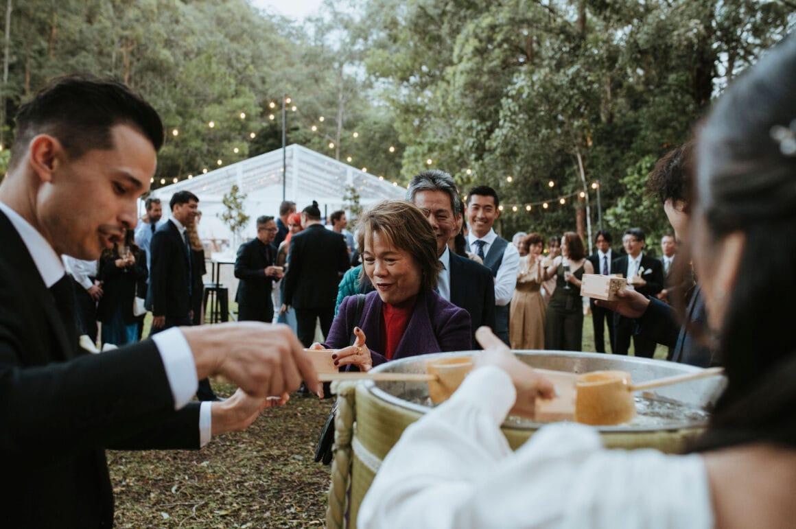 COOL CUSTOM “We incorporated a beautiful Japanese tradition into our day – the sake barrel-breaking ceremony, known as ‘Kagami Biraki.’ This tradition symbolises harmony and marks the beginning of a joyful journey for the couple. As a newly married couple, we broke open the sake barrel, representing the start of a future filled with happiness and prosperity. Once the lid was off, we served sake to all our guests by scooping from the 72L barrel and filling traditional wooden sake cups, which they were able to keep as a memento of the day.”