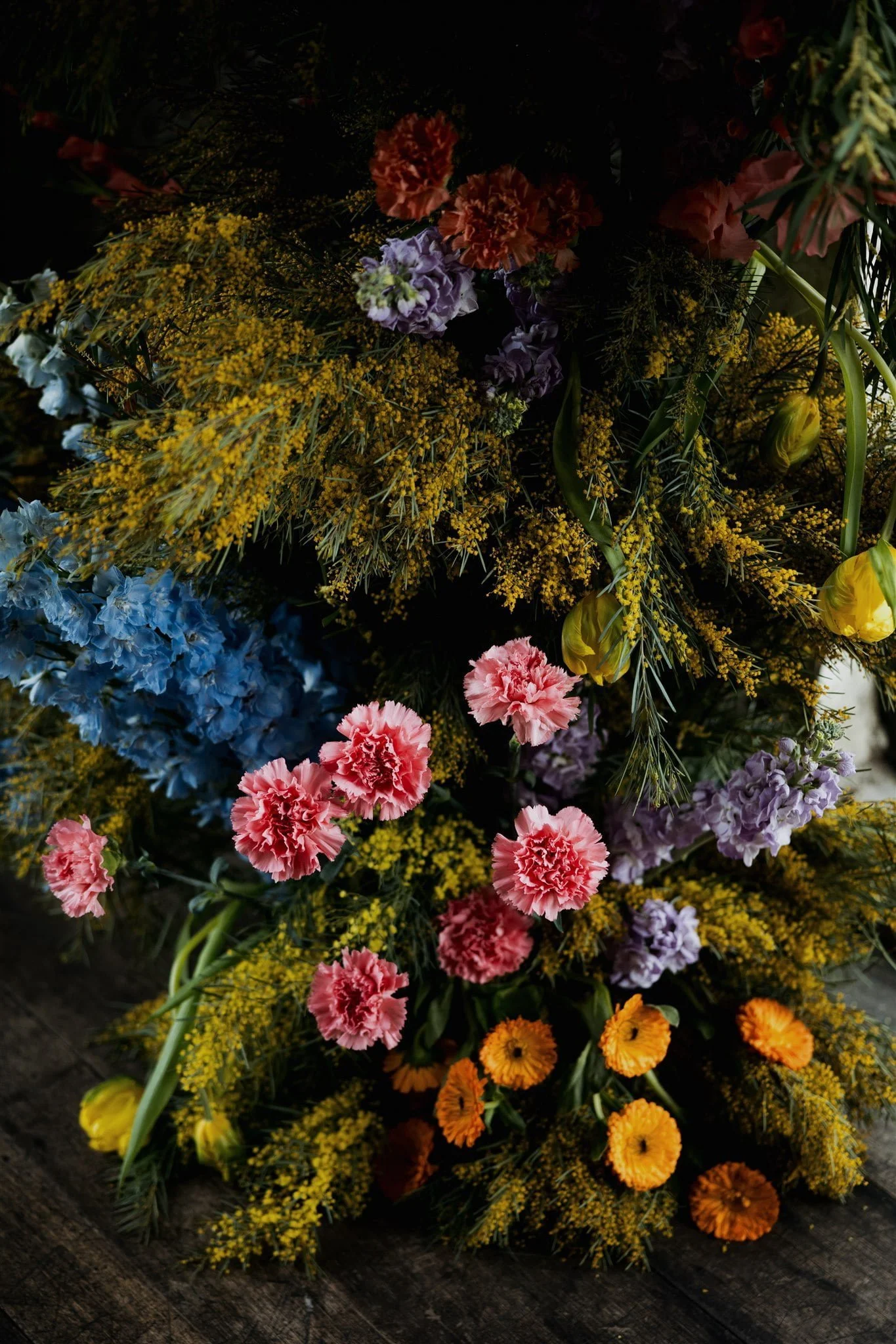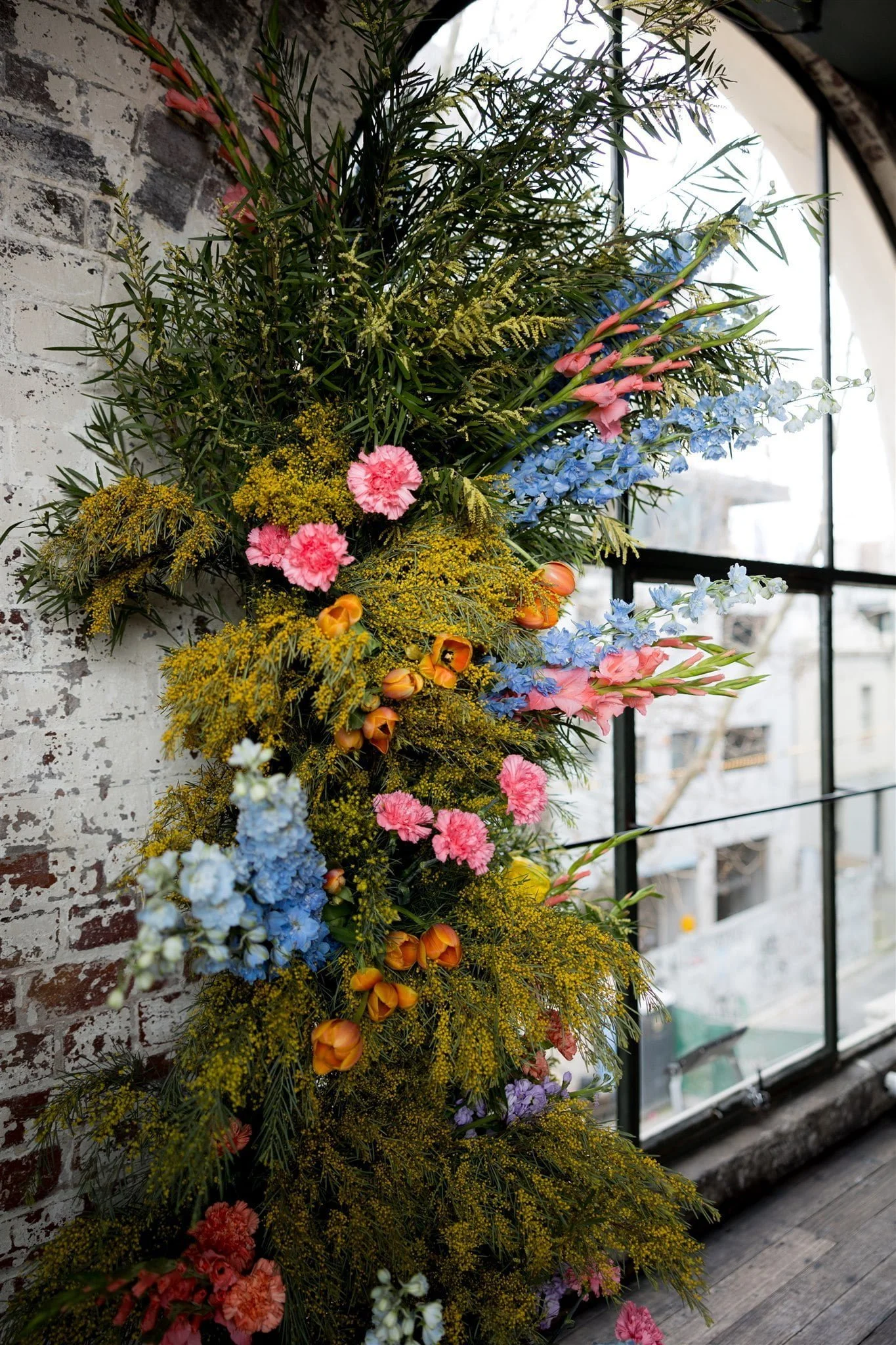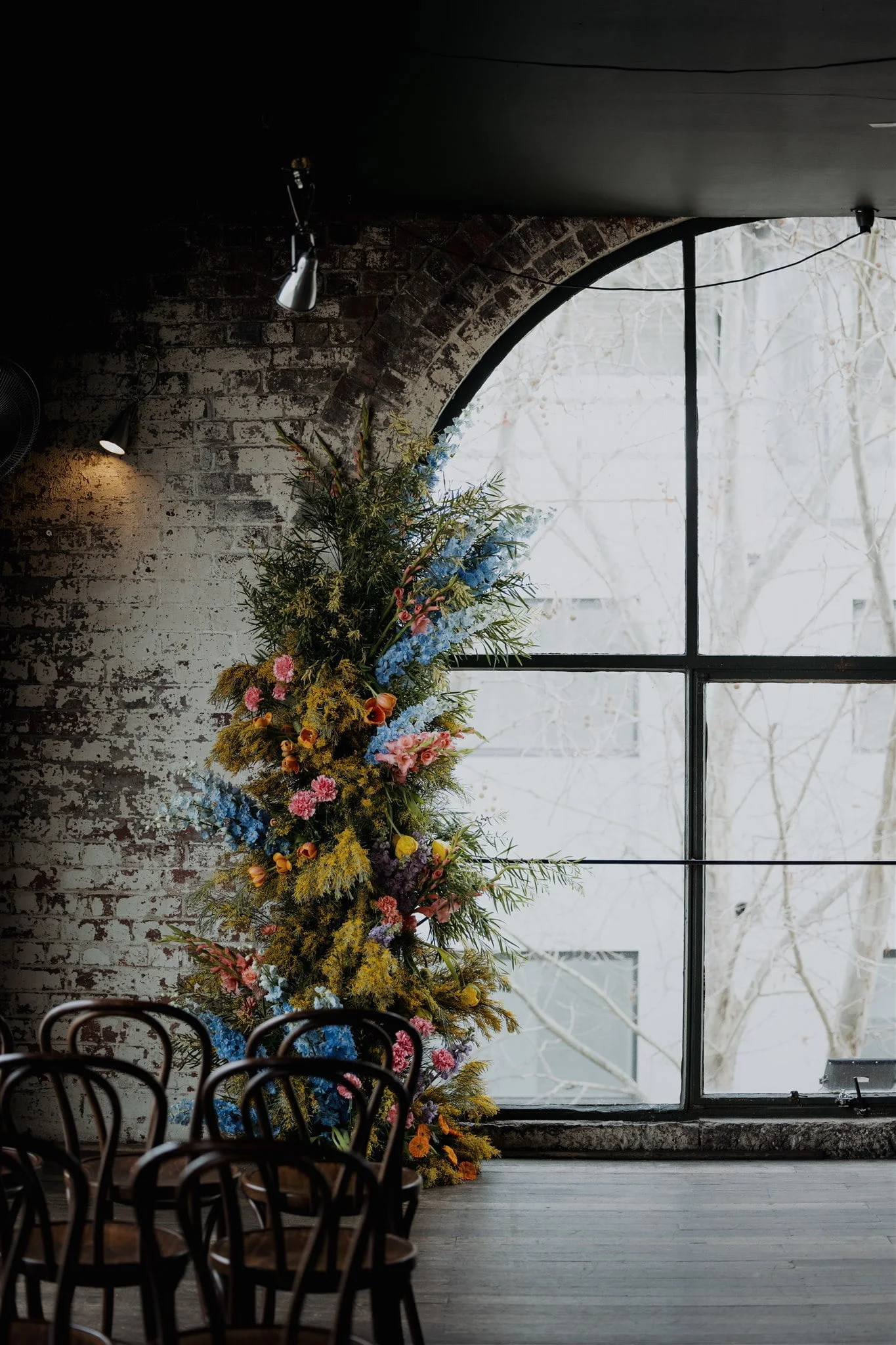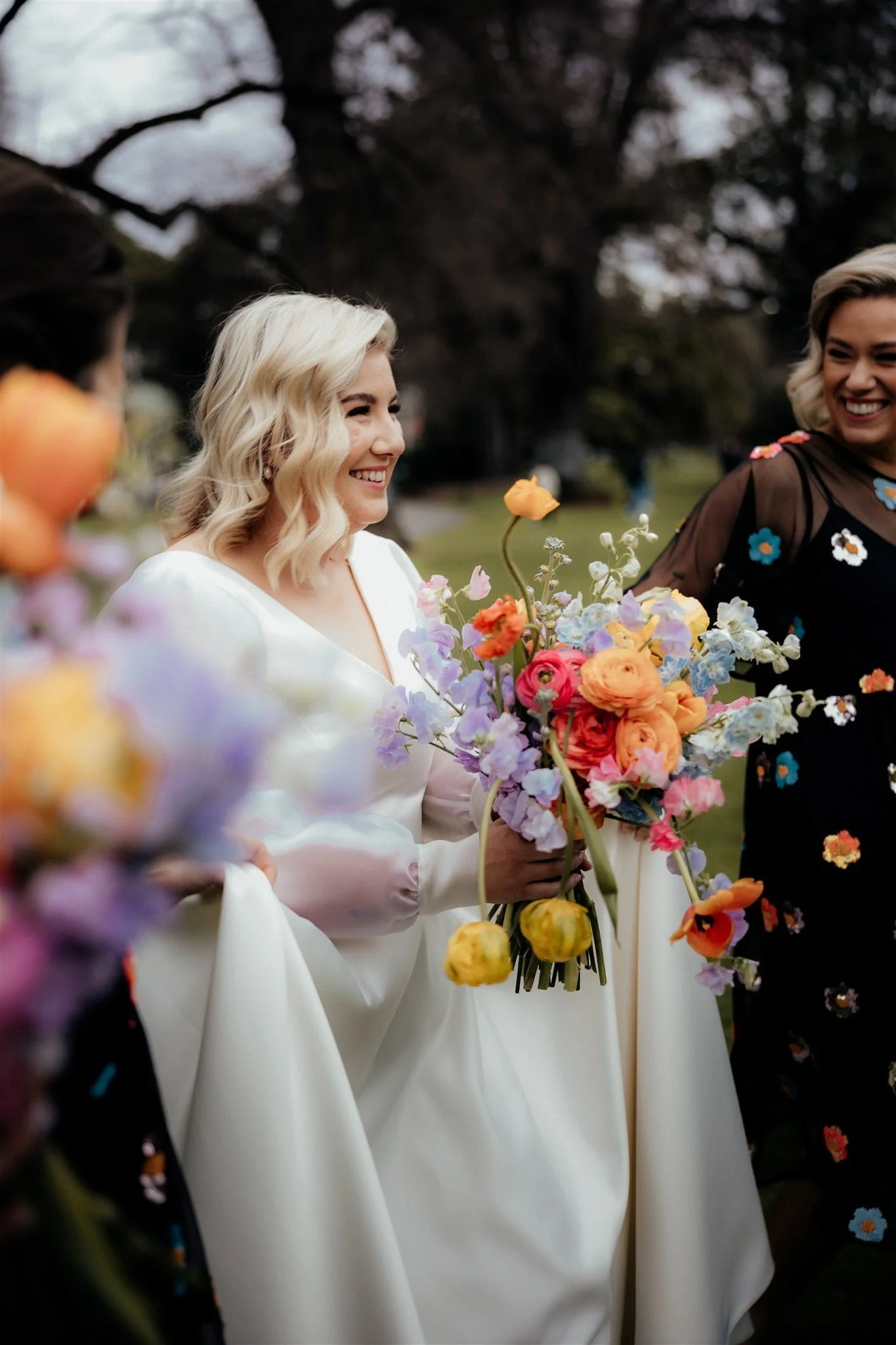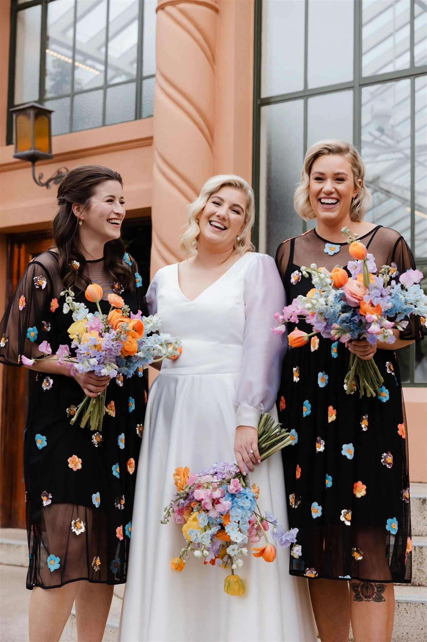 THE INSPO “Knowing the venue is dark and grungy with pops of green, I loved the idea of introducing colour and fun through the flowers and outfits. My bridesmaids wore Gorman, which I love for their hectic prints and colours, and Ross at Bloom Boy really nailed the colourful whimsical vibe I was going for on the flowers.”