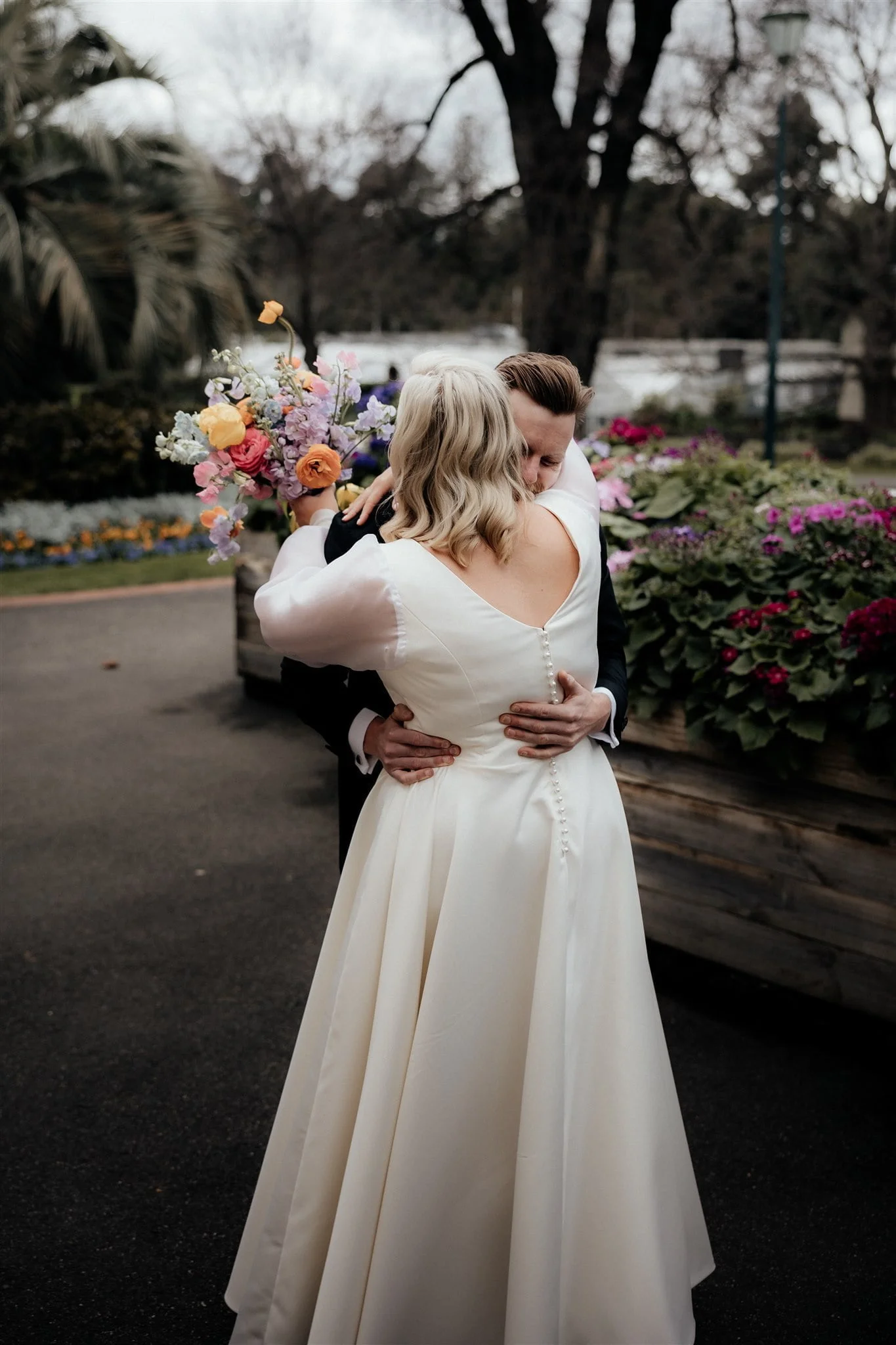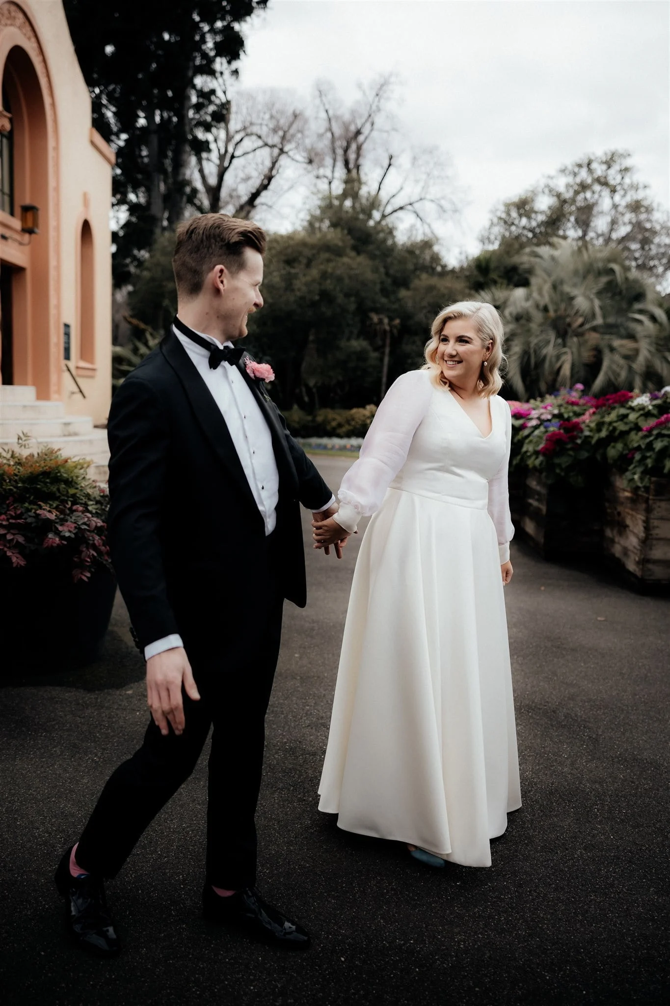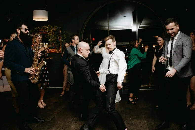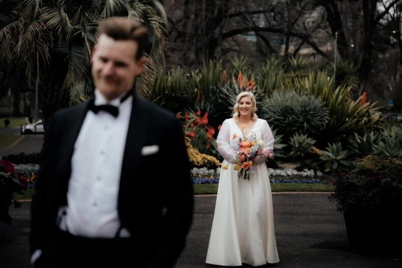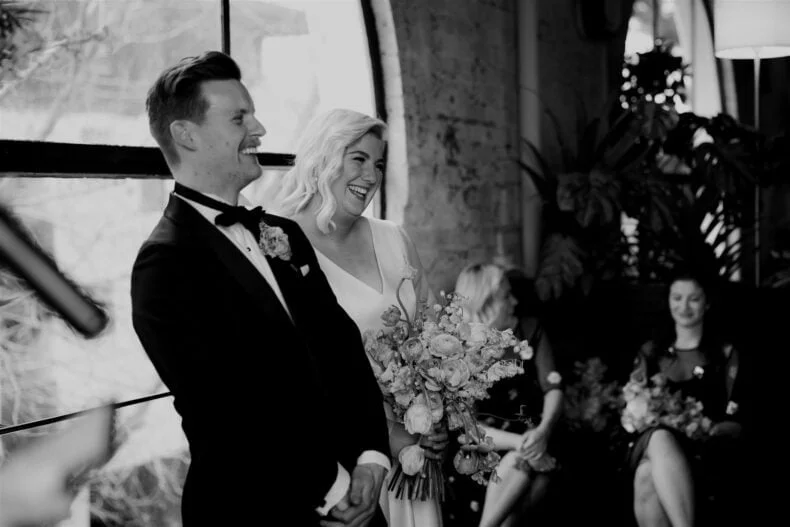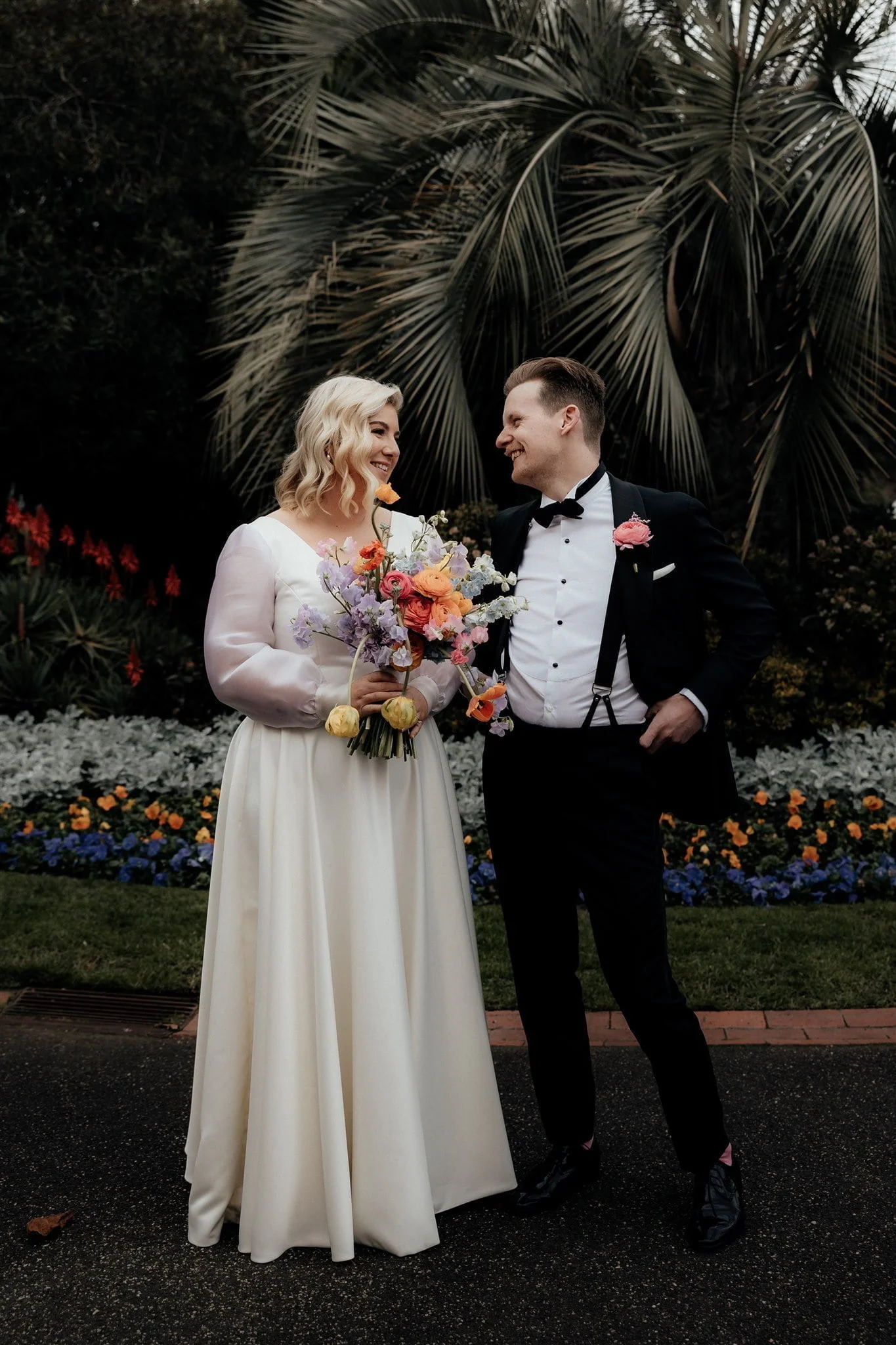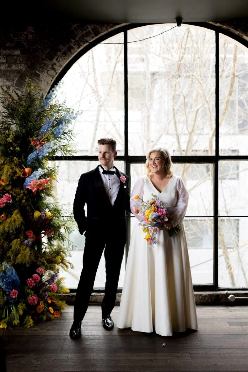 Fast-forward a year and this pair made it official in front of 80 of their loved ones at Panama Dining Room in Melbourne’s Fitzroy. And we’ve got to say, they did a stellar job lining up a pretty epic team of vendors. With Maegan Brown Moments on pics, celebrant Nat Sproal doing the legal bits oh-so beautifully, and Bloom Boy in charge of florals, this was one epic party.