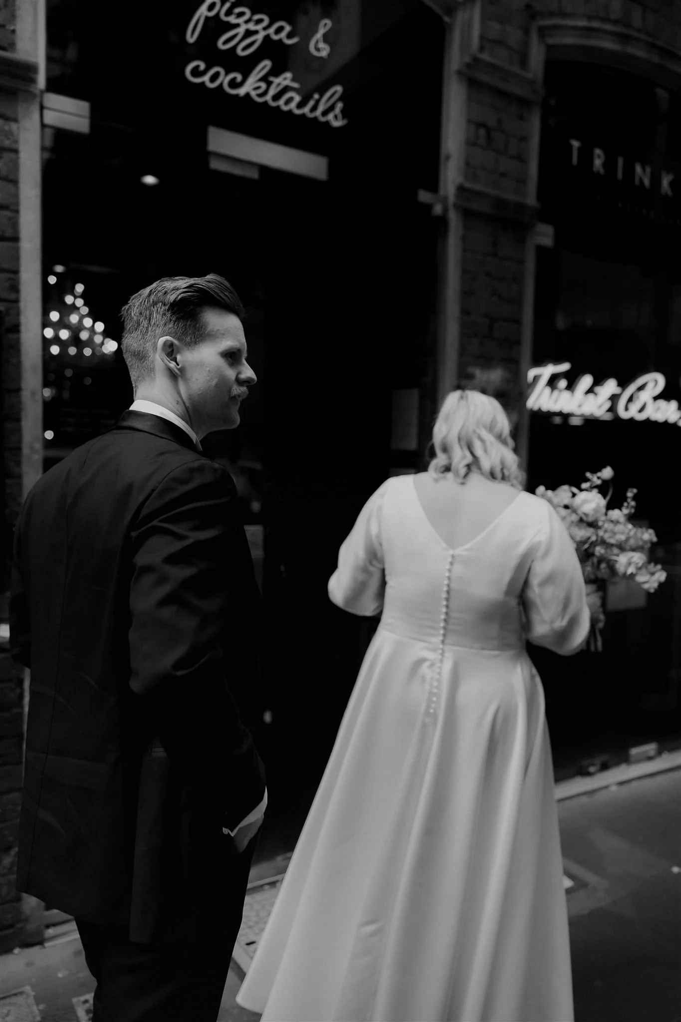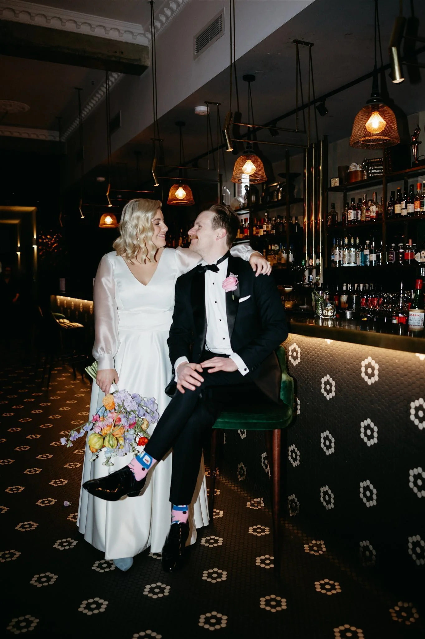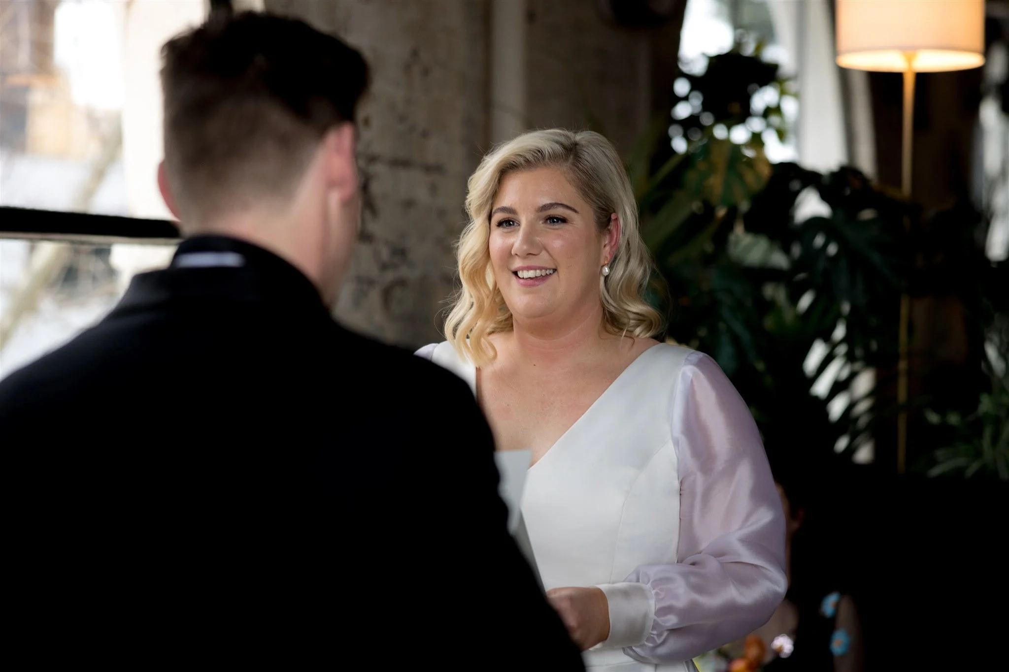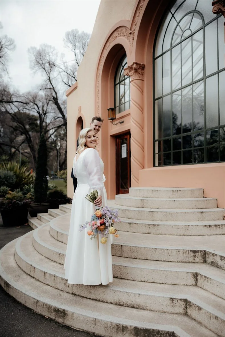 Fast-forward a year and this pair made it official in front of 80 of their loved ones at Panama Dining Room in Melbourne’s Fitzroy. And we’ve got to say, they did a stellar job lining up a pretty epic team of vendors. With Maegan Brown Moments on pics, celebrant Nat Sproal doing the legal bits oh-so beautifully, and Bloom Boy in charge of florals, this was one epic party.