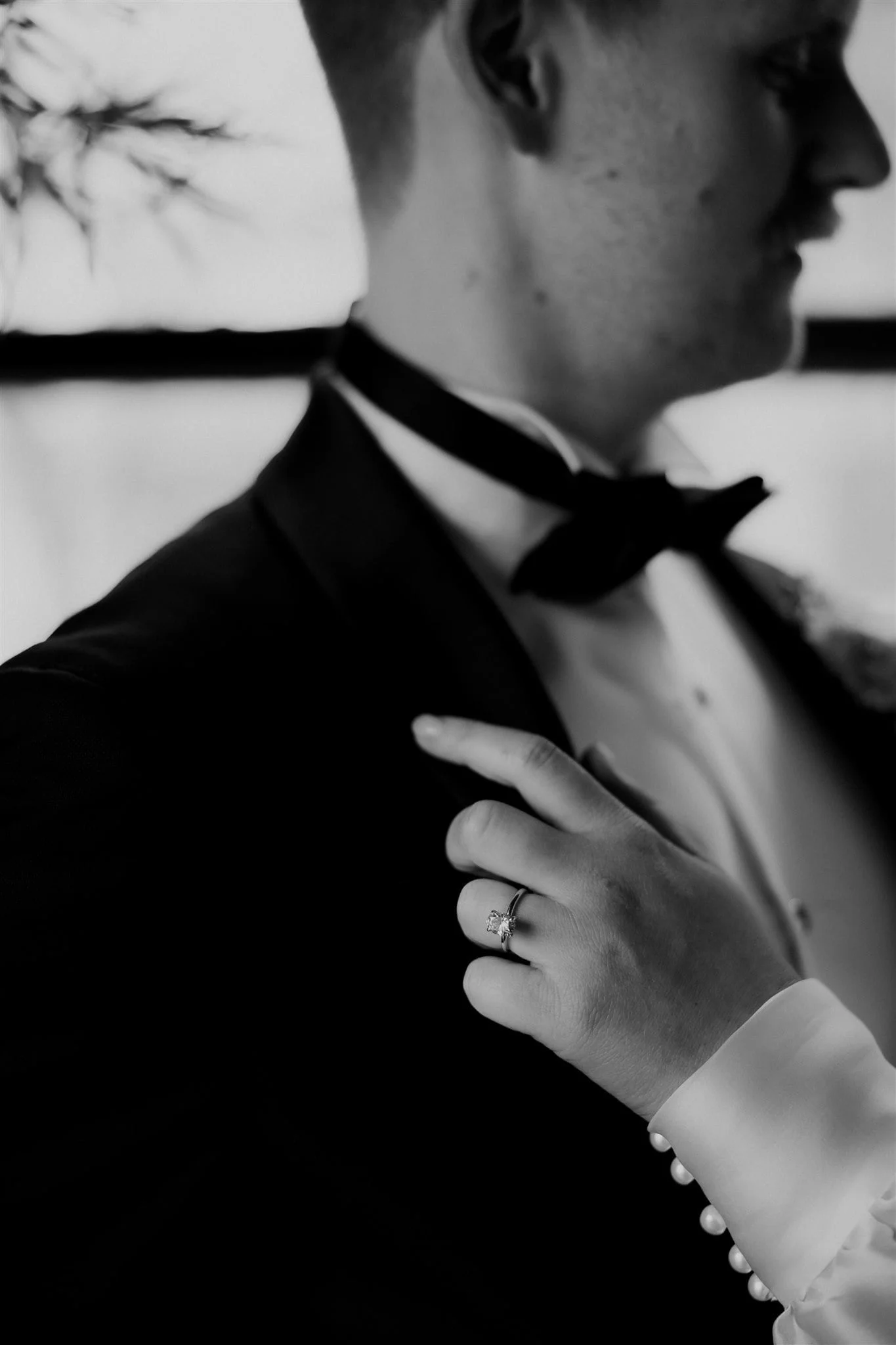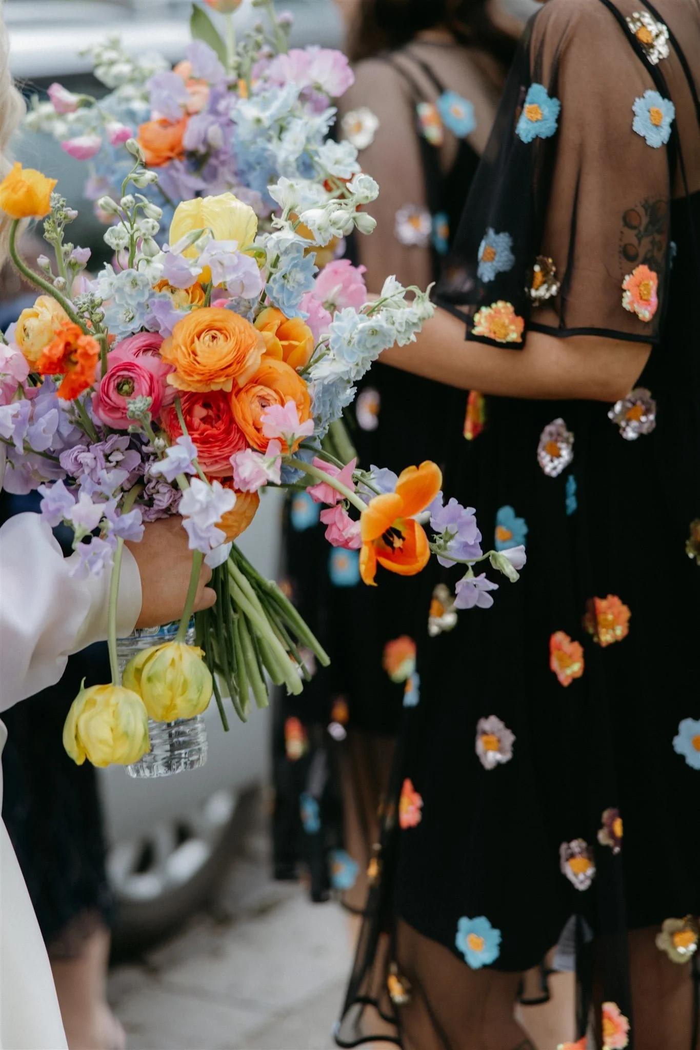 THE SUIT “The suit is from. M.J. Bale. Jez really wanted an excuse to wear a bow tie and black suit and we were super happy with how that tied together with the colourful flowers and dresses. Jez found the experience really positive and easy.”