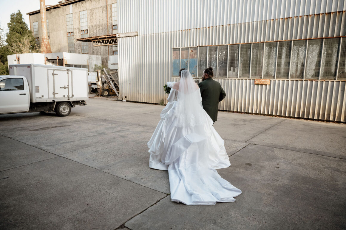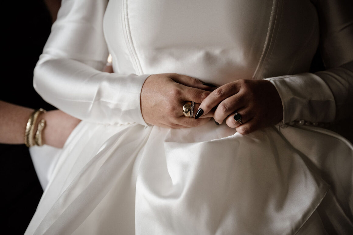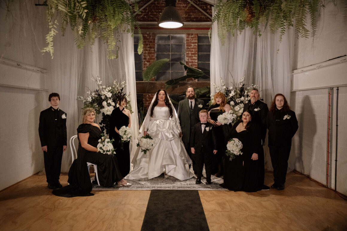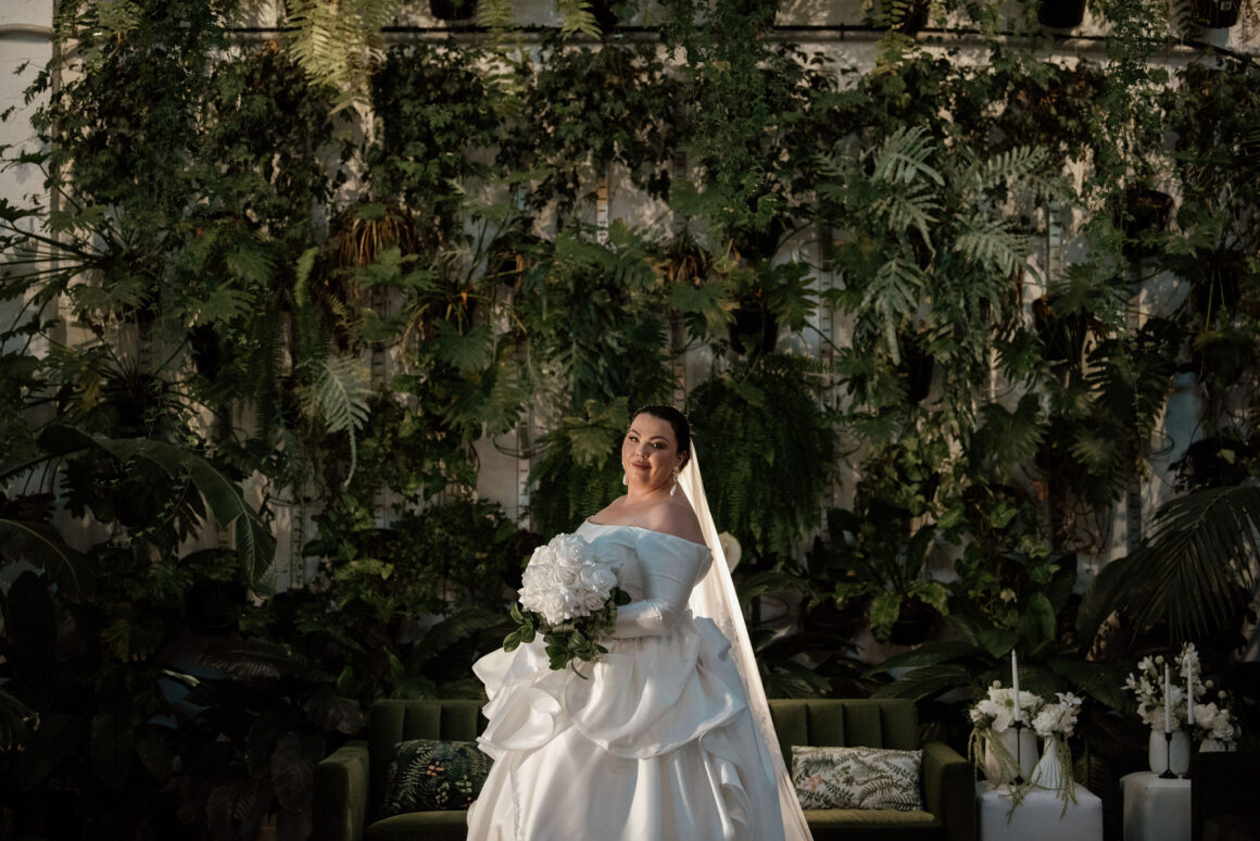 “My wedding dress was a three-piece couture creation crafted from 85 metres of raw silk, a long-sleeved bodice with pearl button detailing, a cascading multi-layered tulle ruffle skirt with pull-up sections, and a detachable double-circle train… As a designer and maker of gowns for brides of all shapes and sizes, and being a plus-size bride myself, I’d heard so many horror stories from women who didn’t fit the “expected mould” at traditional boutiques. I’m grateful I didn’t have to navigate that experience, since I was creating my own gown. At the same time, I missed out on the dramatic reveals and “wow” moments that I’ve seen my clients enjoy. But there was something magical about watching it evolve, stage by stage, and seeing it come together exactly as I had imagined.”