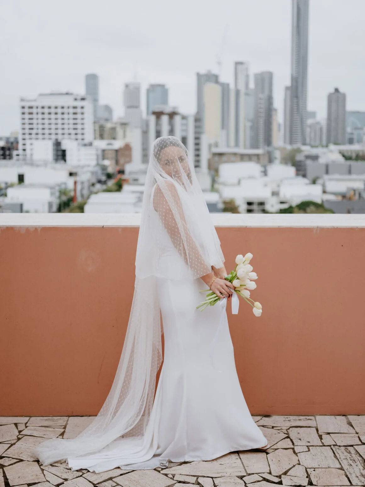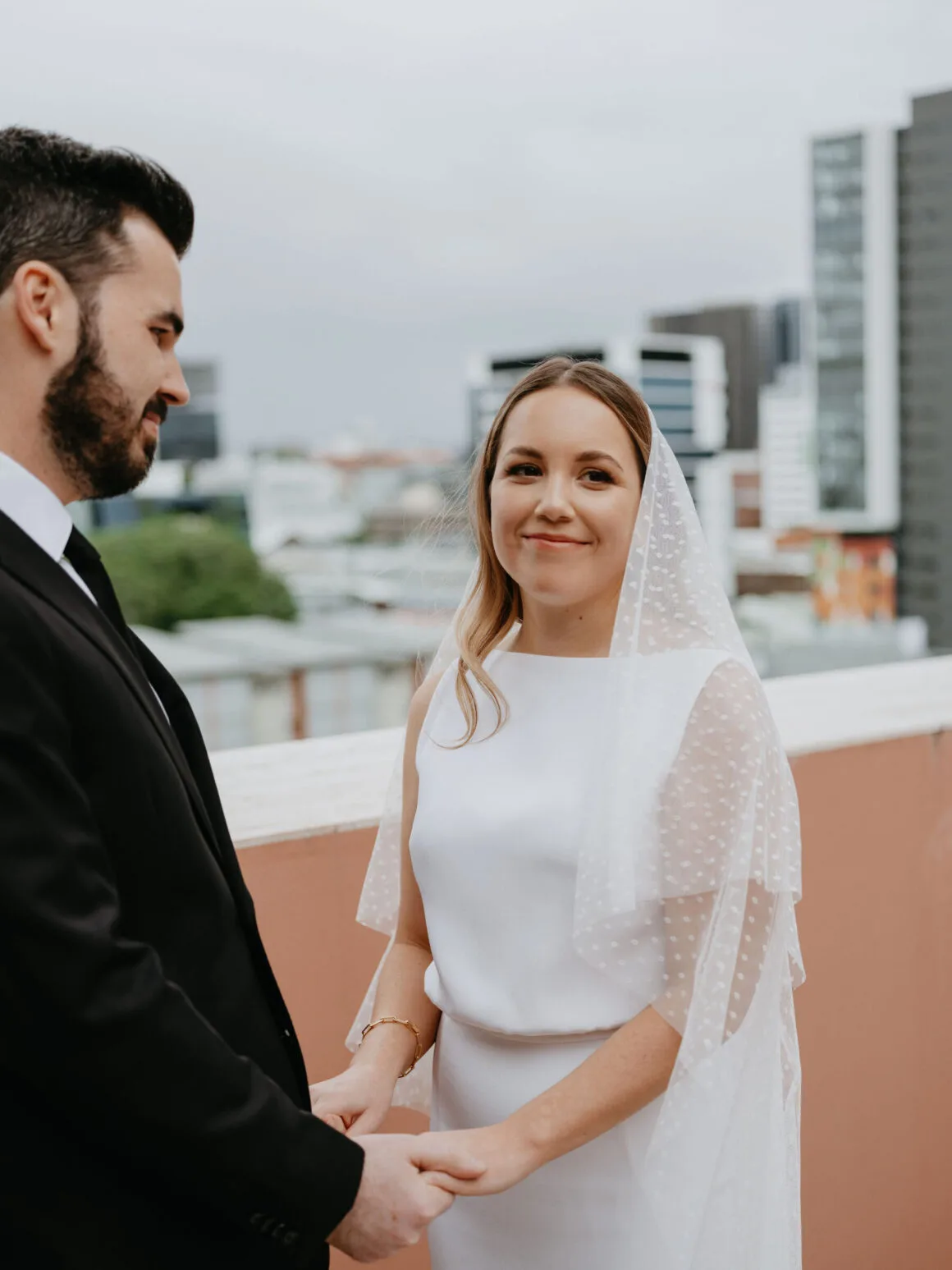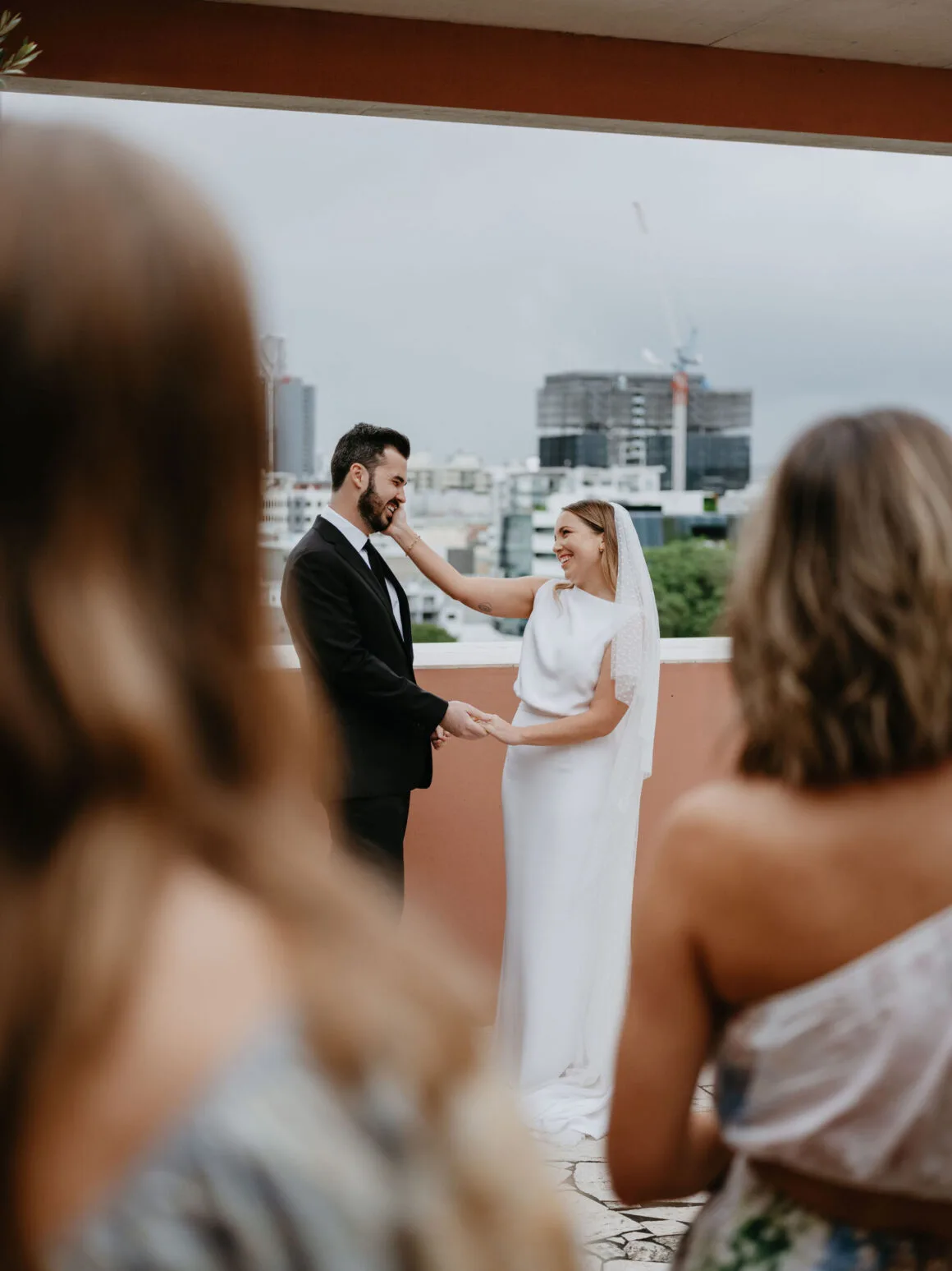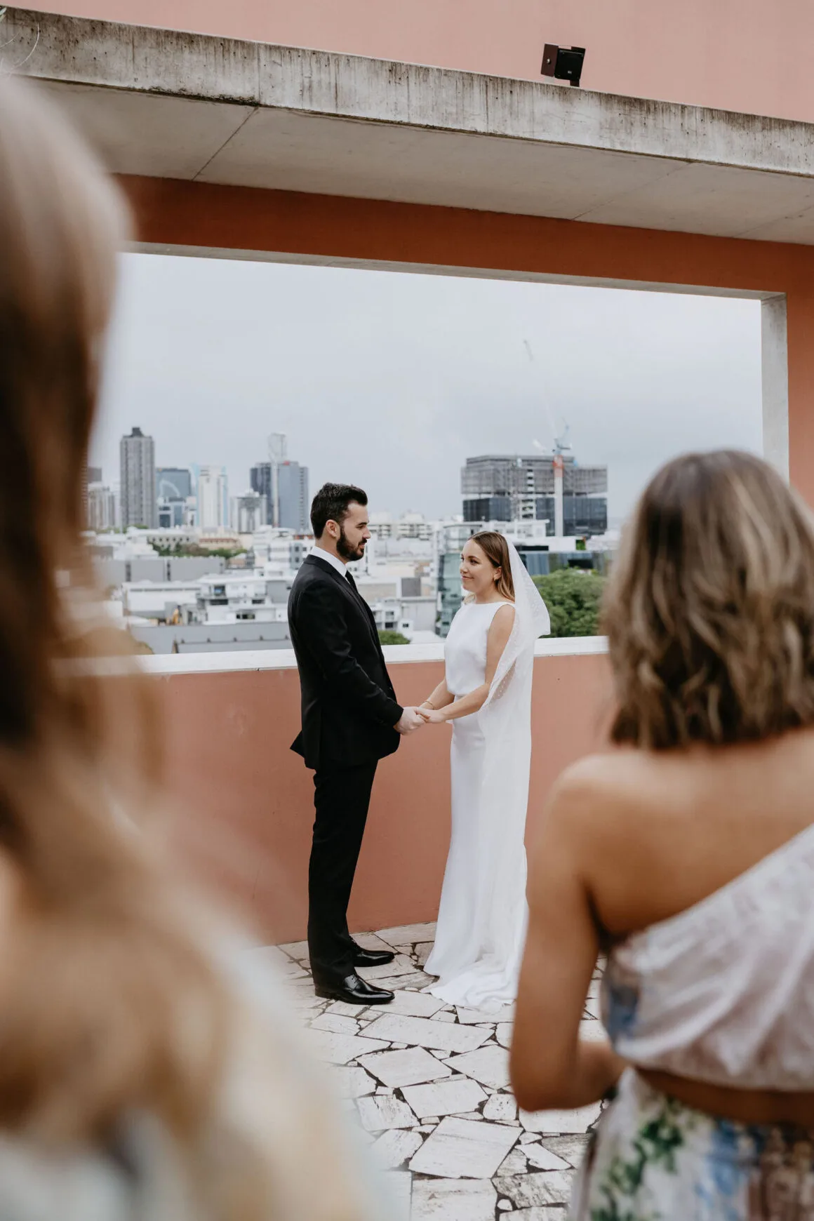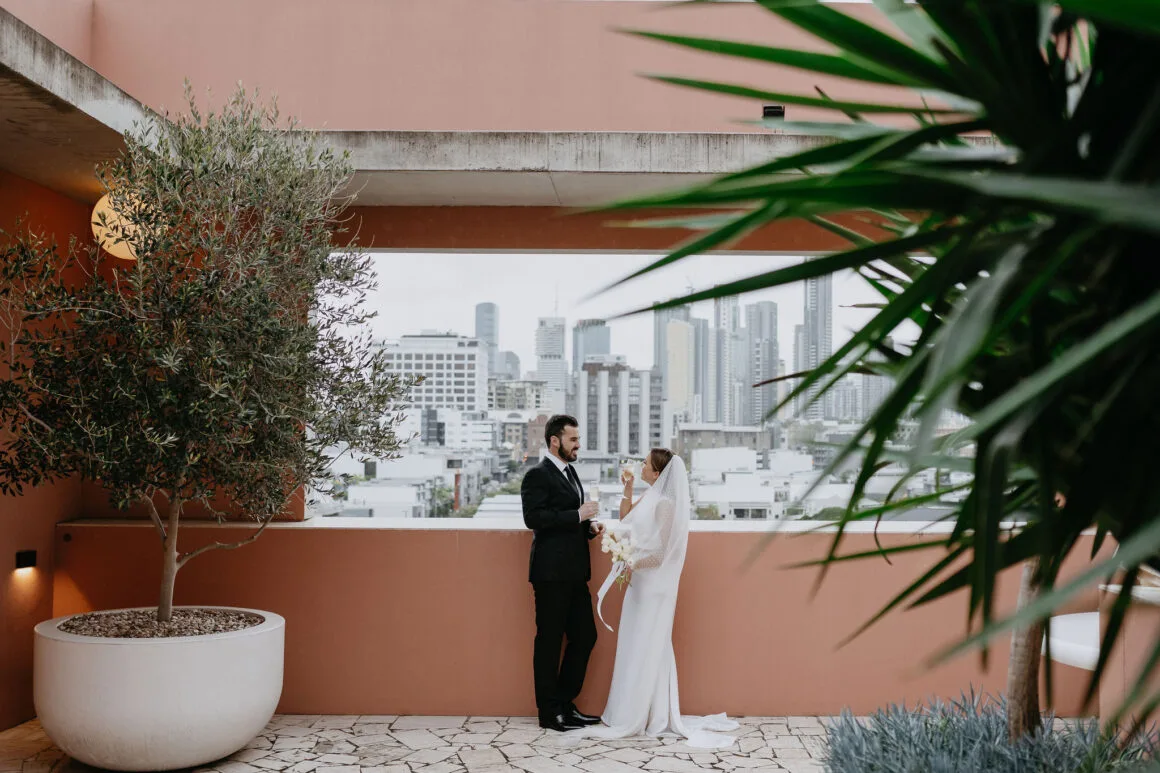 THE VENUE “Our wedding venue choice came about [due to] a last-minute attempt to move the wedding to Queensland. The Calile felt like the perfect venue for the wedding we wanted, and we couldn’t be happier with how it all worked out. Its modern, minimalist aesthetic was perfect for us. We felt as though we could lean into the hotel’s style and keep everything else stripped back. The Calile Suite also offered the perfect space for our group. The private rooftop terrace was intimate, yet open and airy as it overlooked the city, and being a winter wedding, we all got to retreat to the suite for champagne and canapés before dinner.”