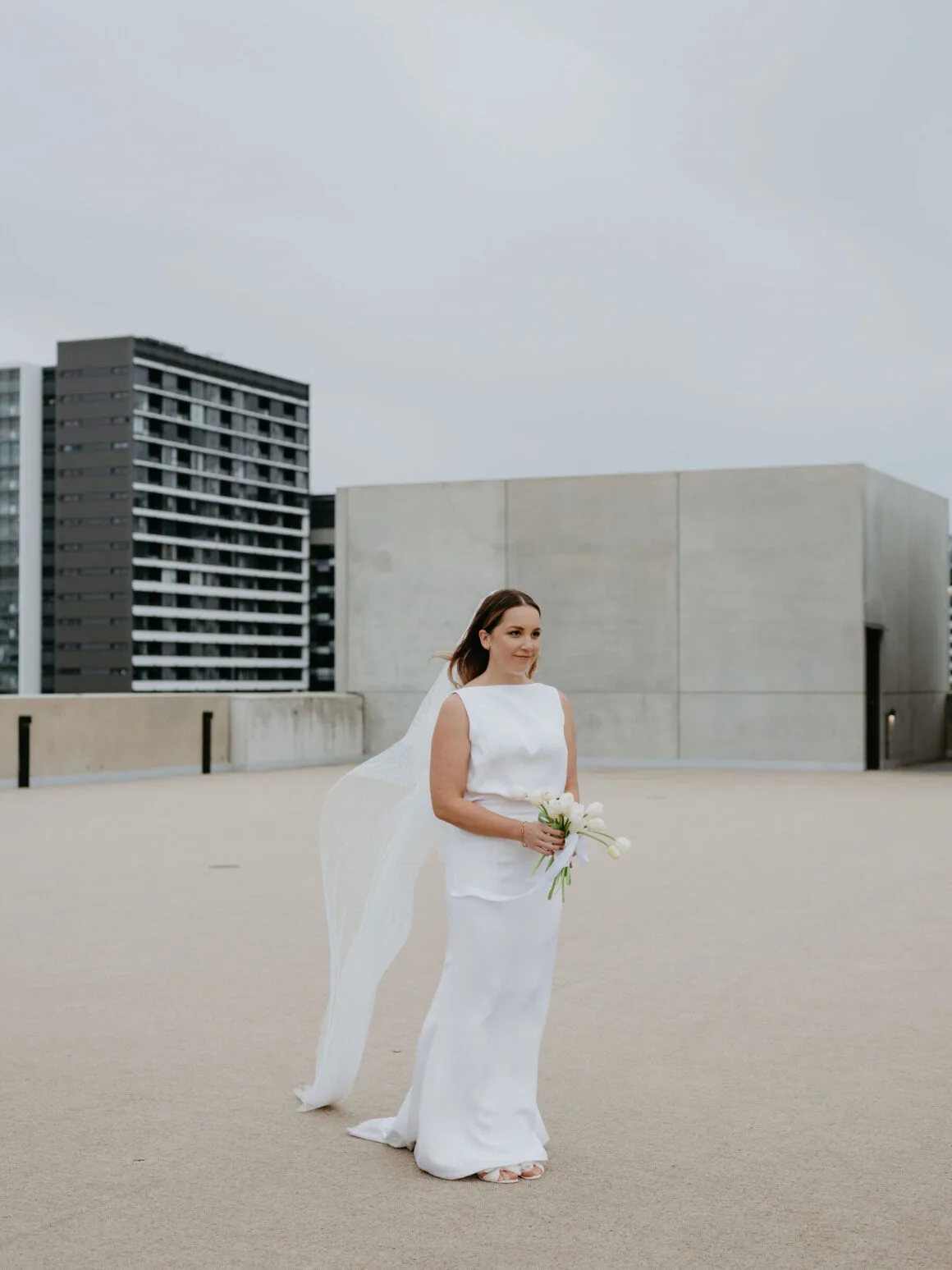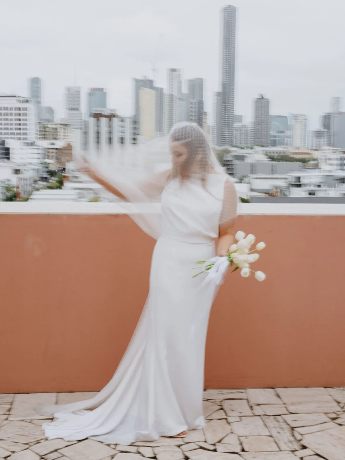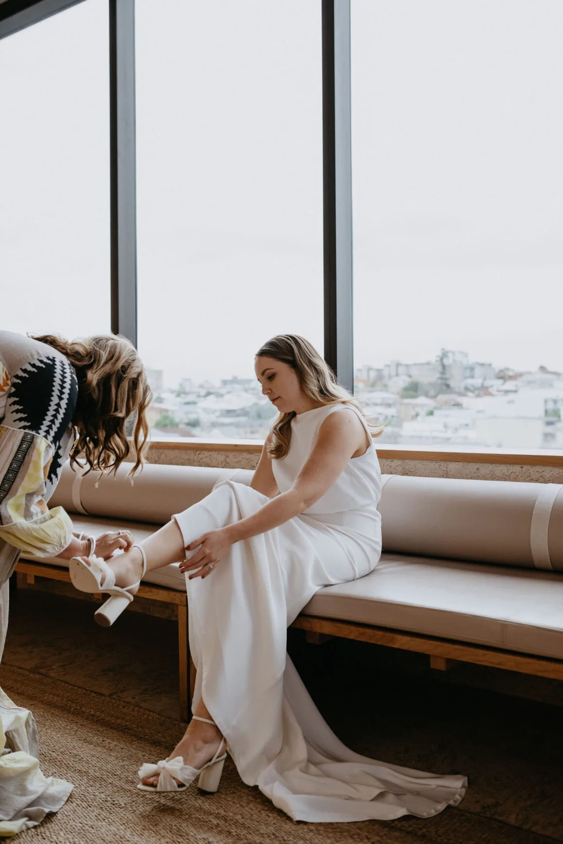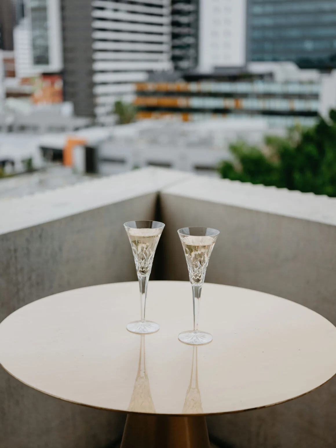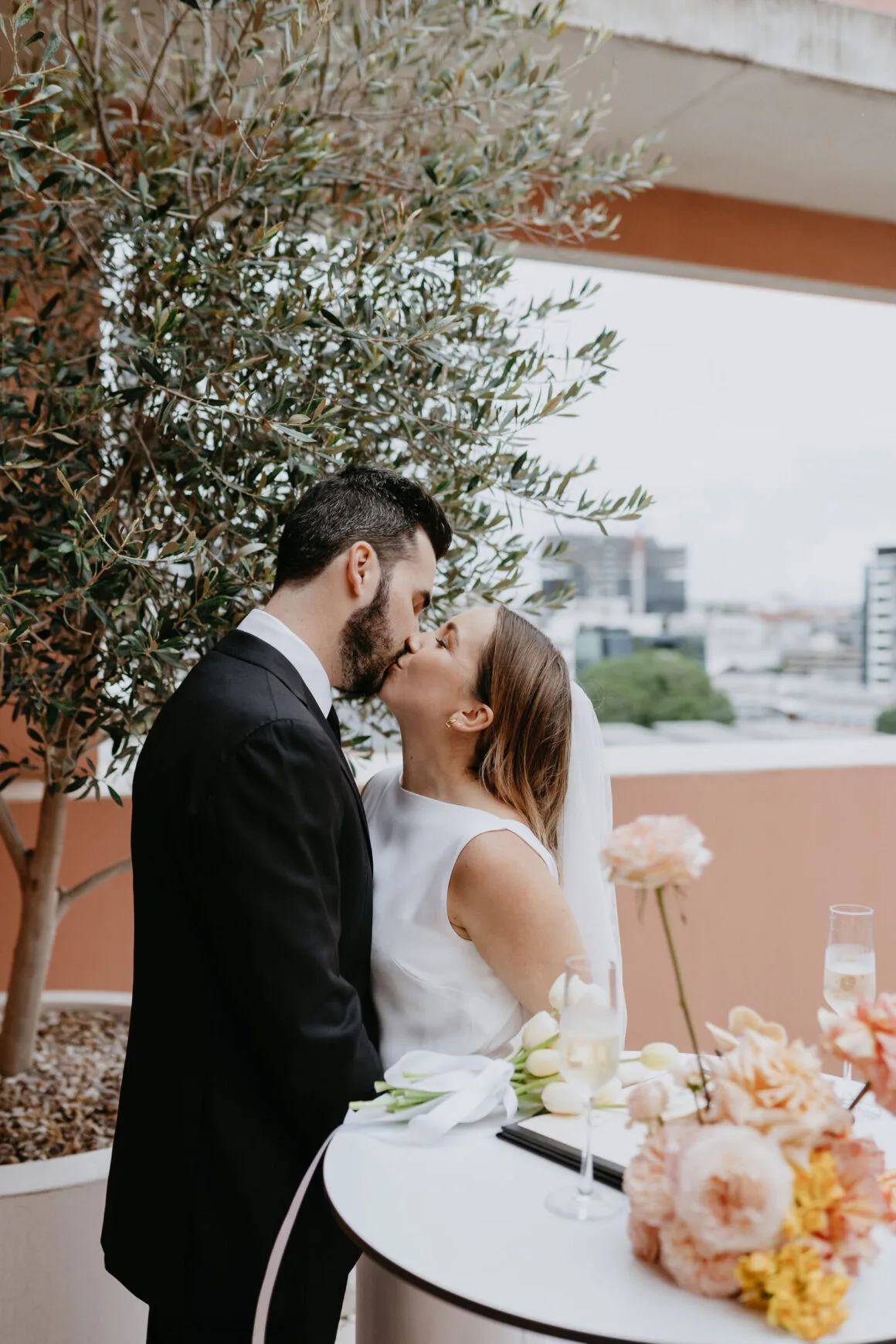 THE VENUE “Our wedding venue choice came about [due to] a last-minute attempt to move the wedding to Queensland. The Calile felt like the perfect venue for the wedding we wanted, and we couldn’t be happier with how it all worked out. Its modern, minimalist aesthetic was perfect for us. We felt as though we could lean into the hotel’s style and keep everything else stripped back. The Calile Suite also offered the perfect space for our group. The private rooftop terrace was intimate, yet open and airy as it overlooked the city, and being a winter wedding, we all got to retreat to the suite for champagne and canapés before dinner.”