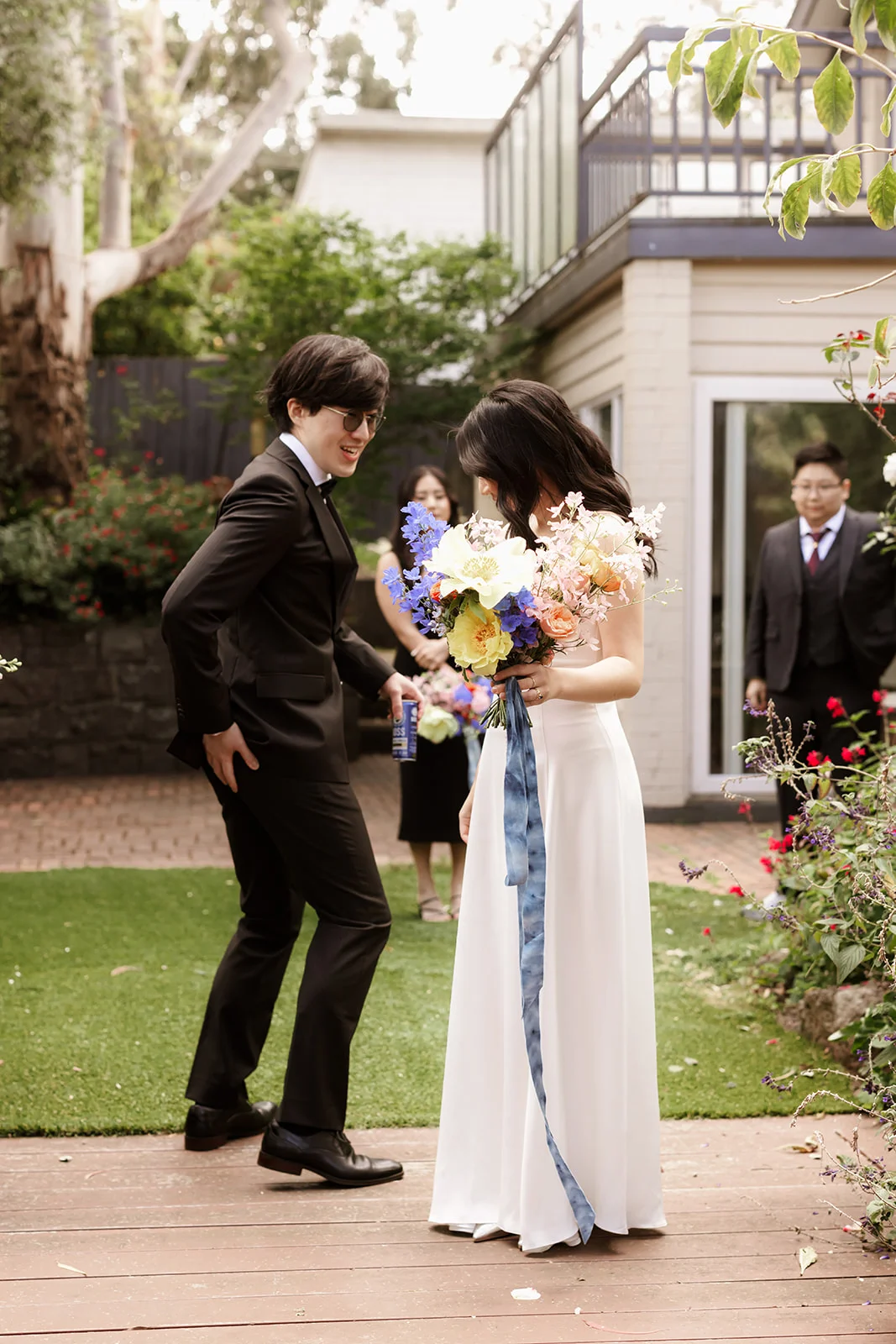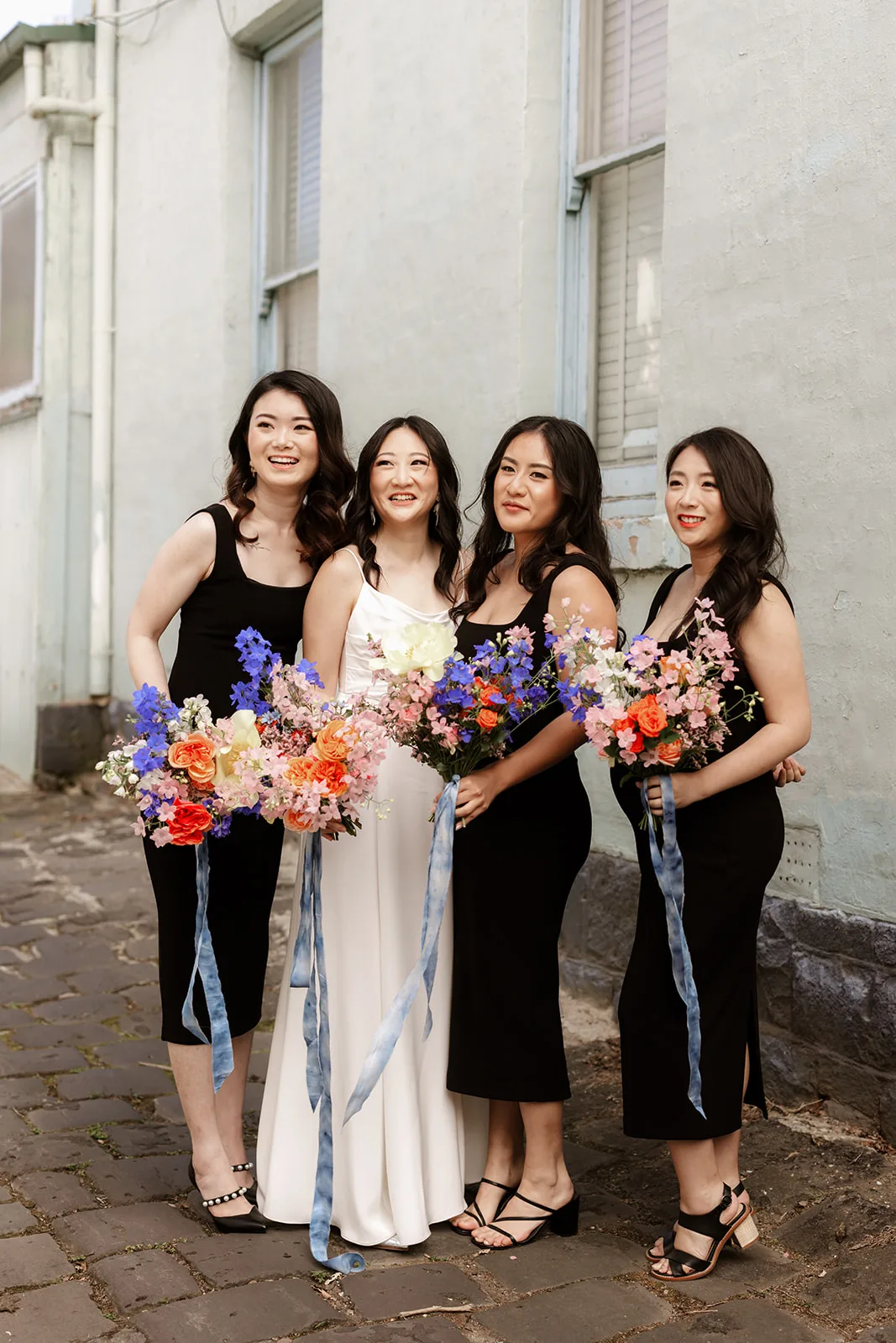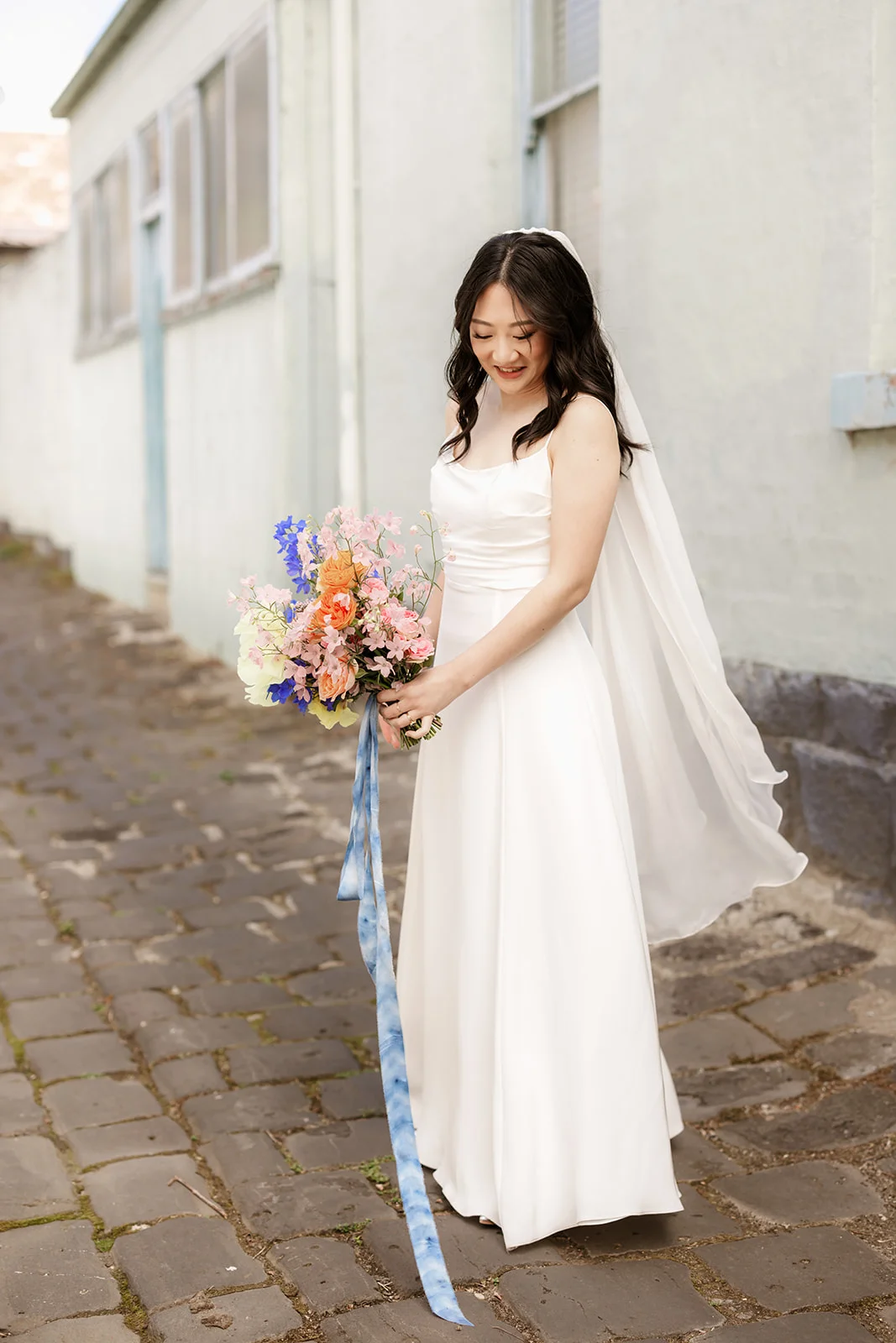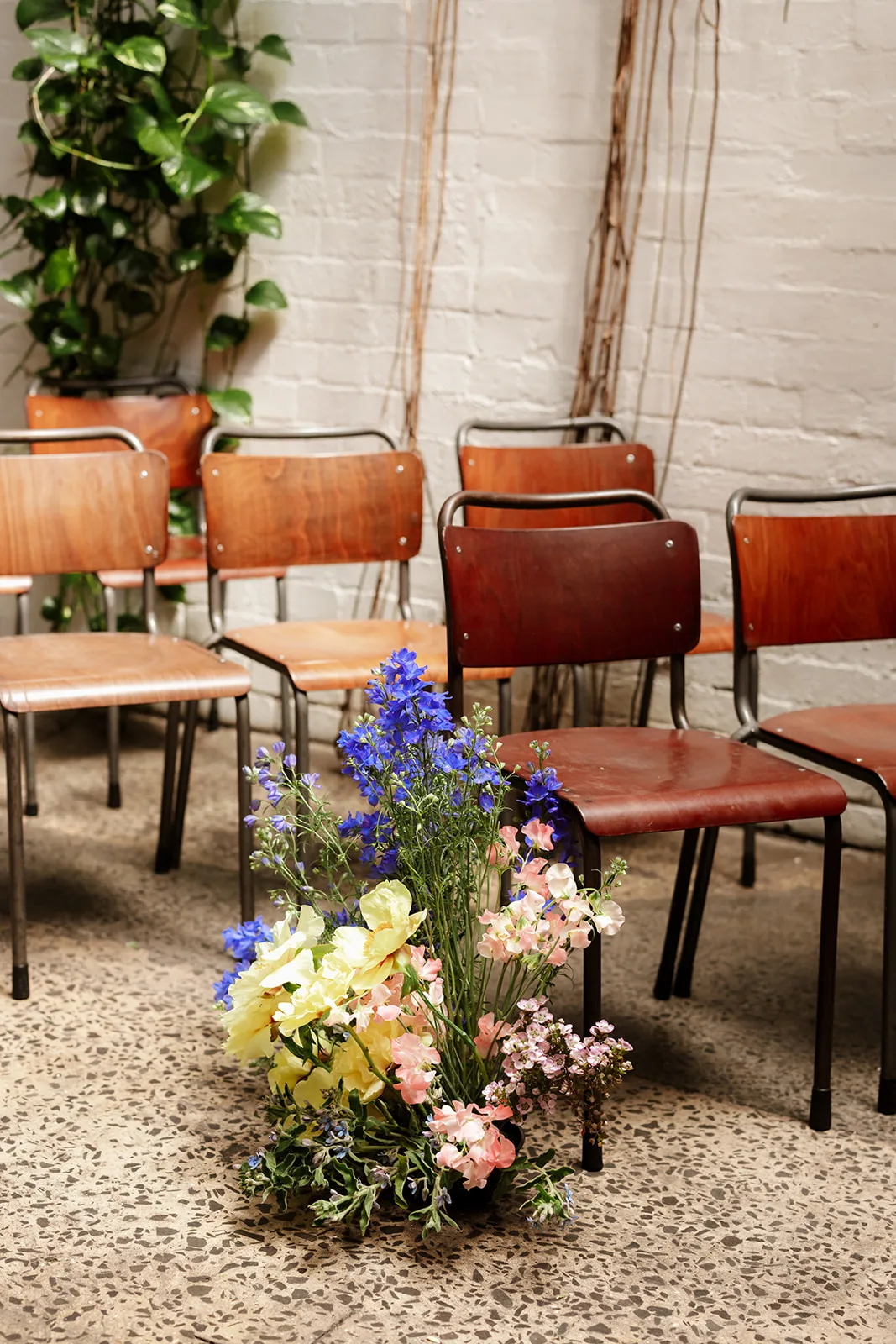 FAVE DETAILS “I loved the bouquets from Katie at Ripple Studio. The bouquet style was quite loose with lots of movement and colour and made for great props for the photos. Although we were on a budget, I did want to prioritise having added florals for a bit of colour. We came up with the brief of loose and airy, garden-style, still-life painting, and Katie absolutely delivered! ”