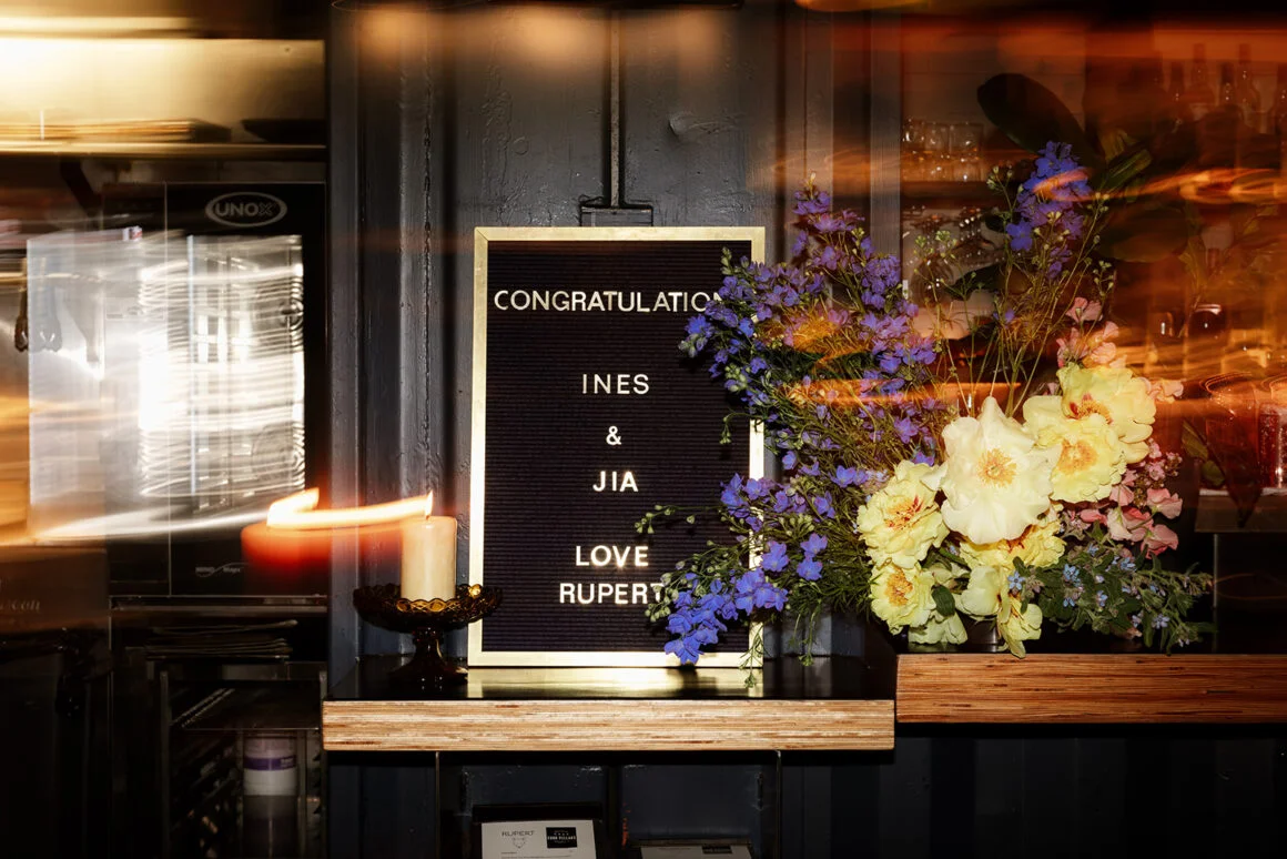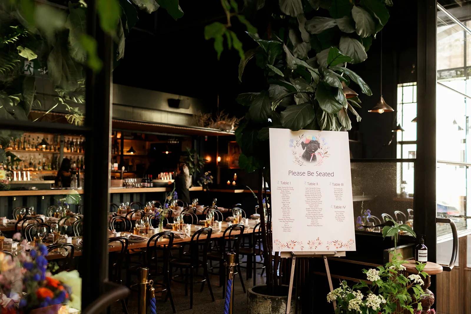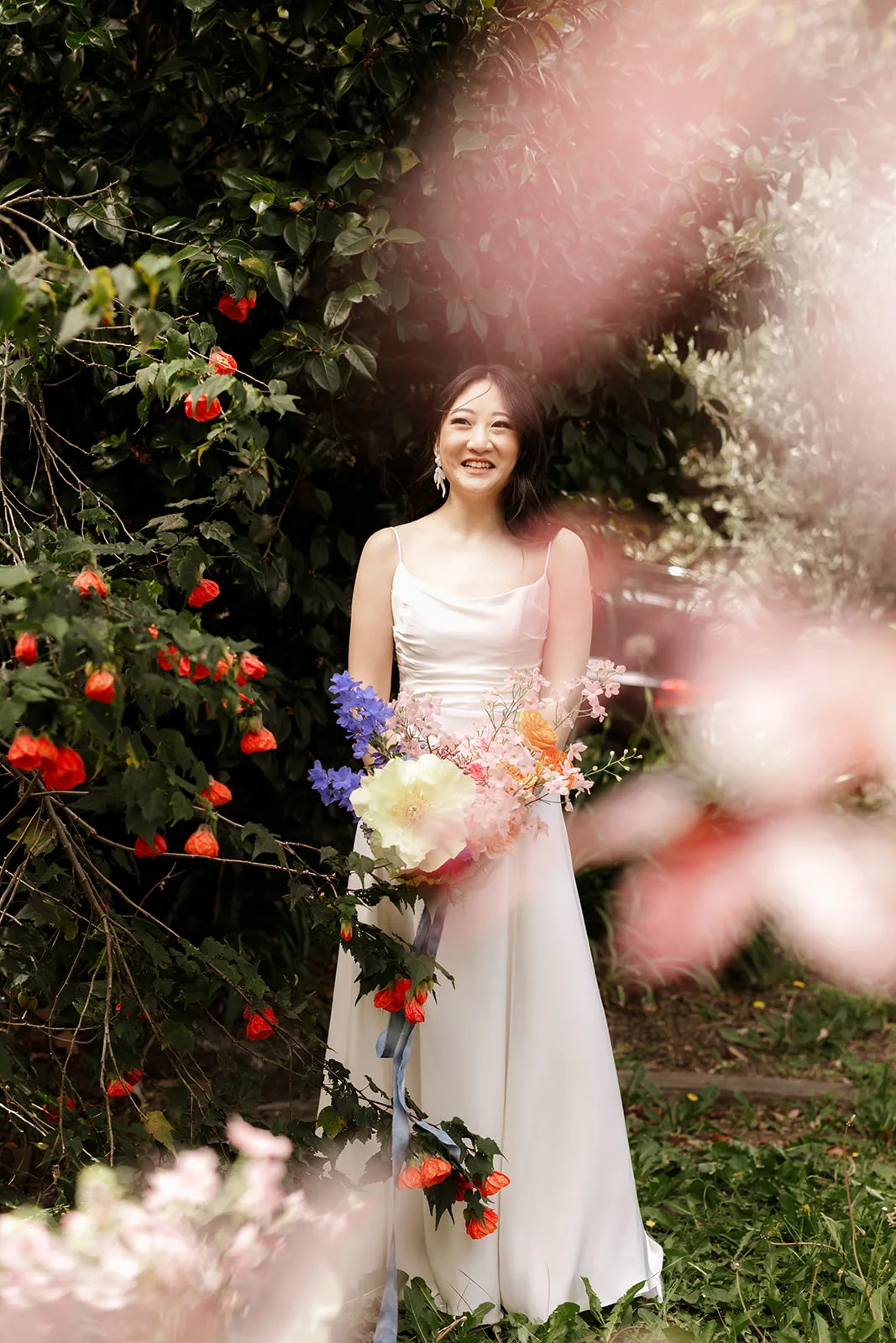 THE INSPO “There wasn’t a set theme: Jia didn’t mind, and I just wanted plants. I decided on a colour scheme of peach and blue, and our bridesmaid Grace kindly designed the invitations, the menus and the seating chart. I gave her some photos from of our dog Willa and she drew Willa in her designs.”