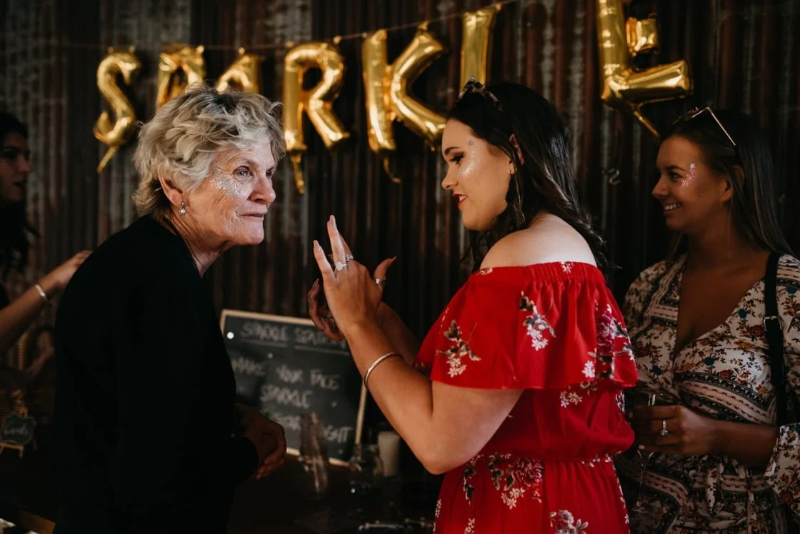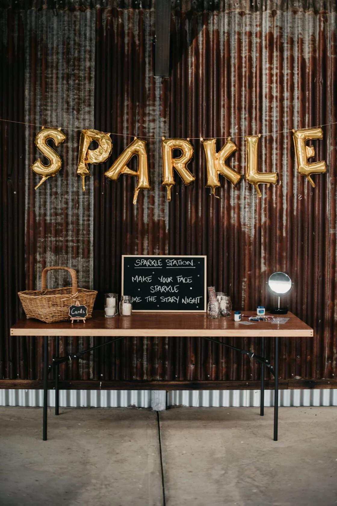 DIY “Yes! All the fairly lights were hung by the the boys and there were a lot! Photo booth, sparkle station… we also made the bridesmaids bouquets with foliage from the property, signs were written by a friend.”