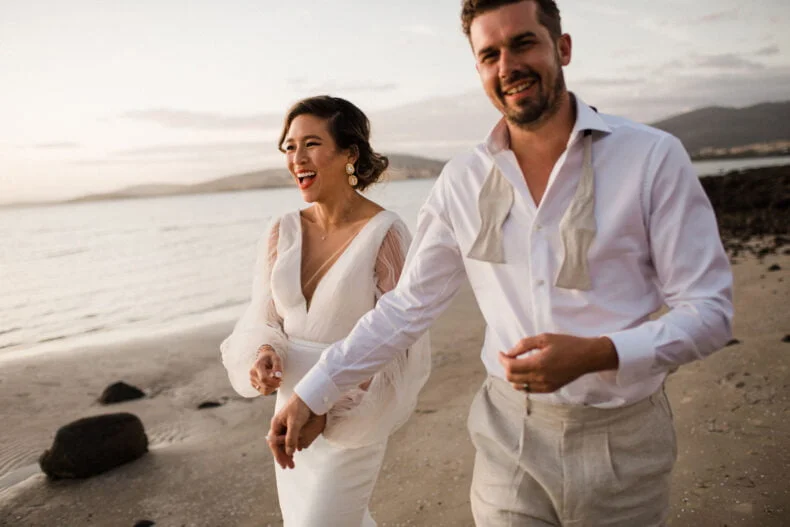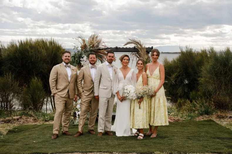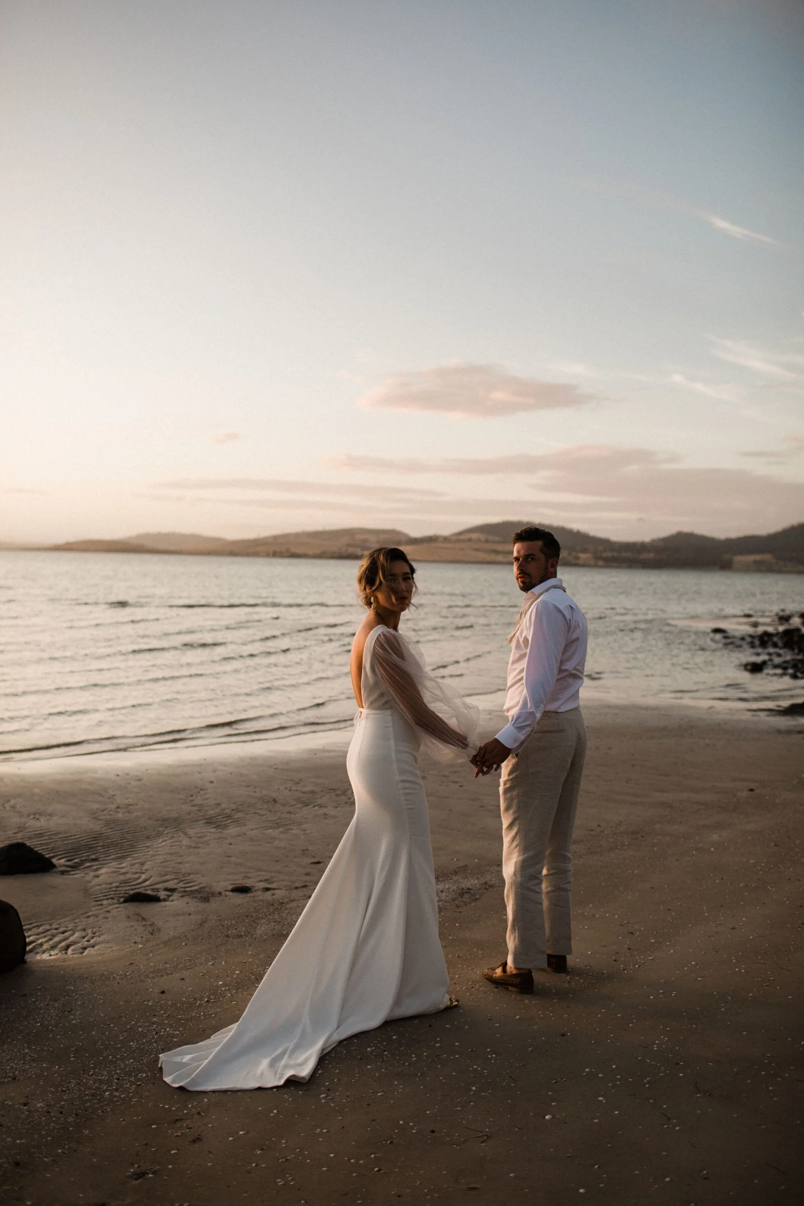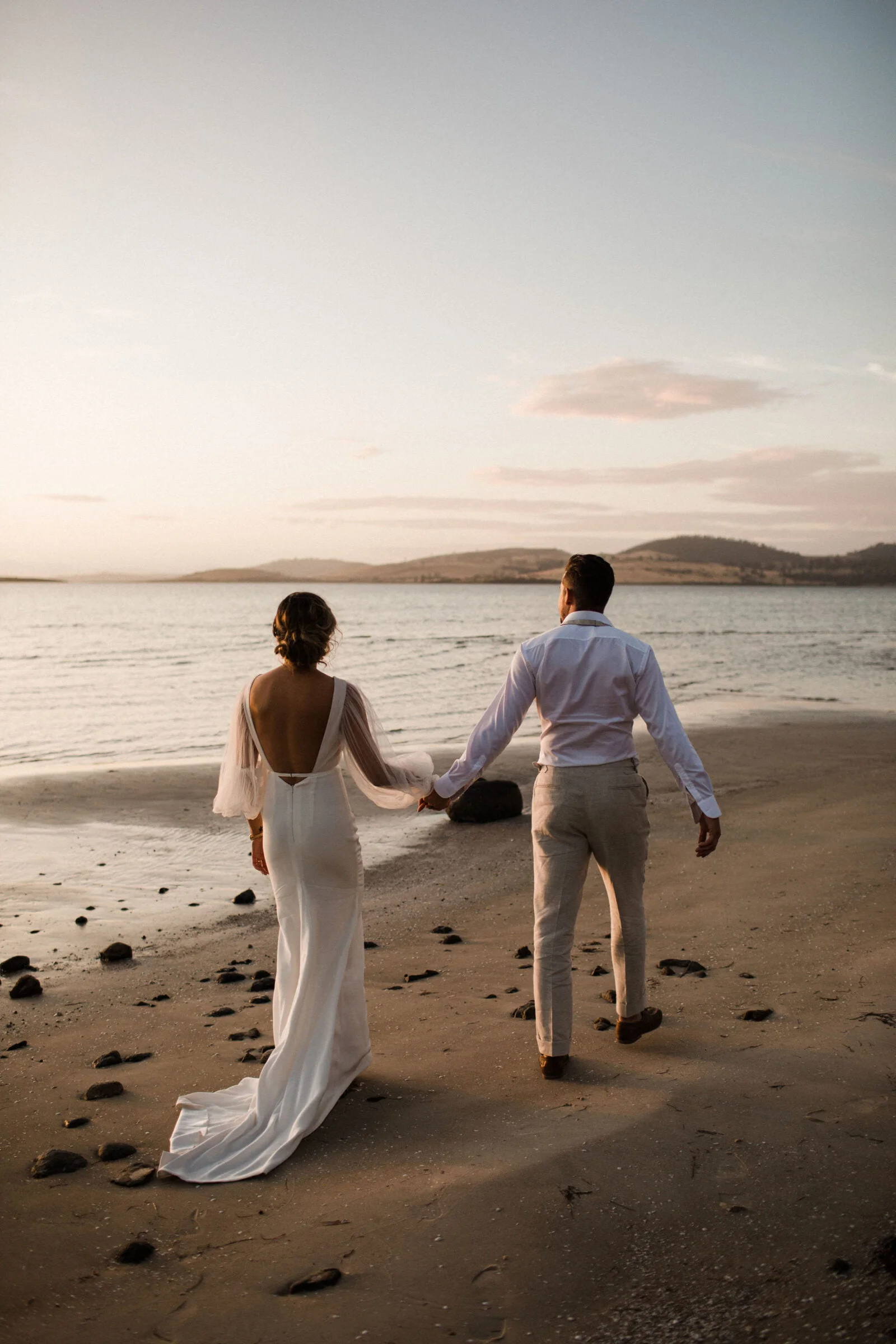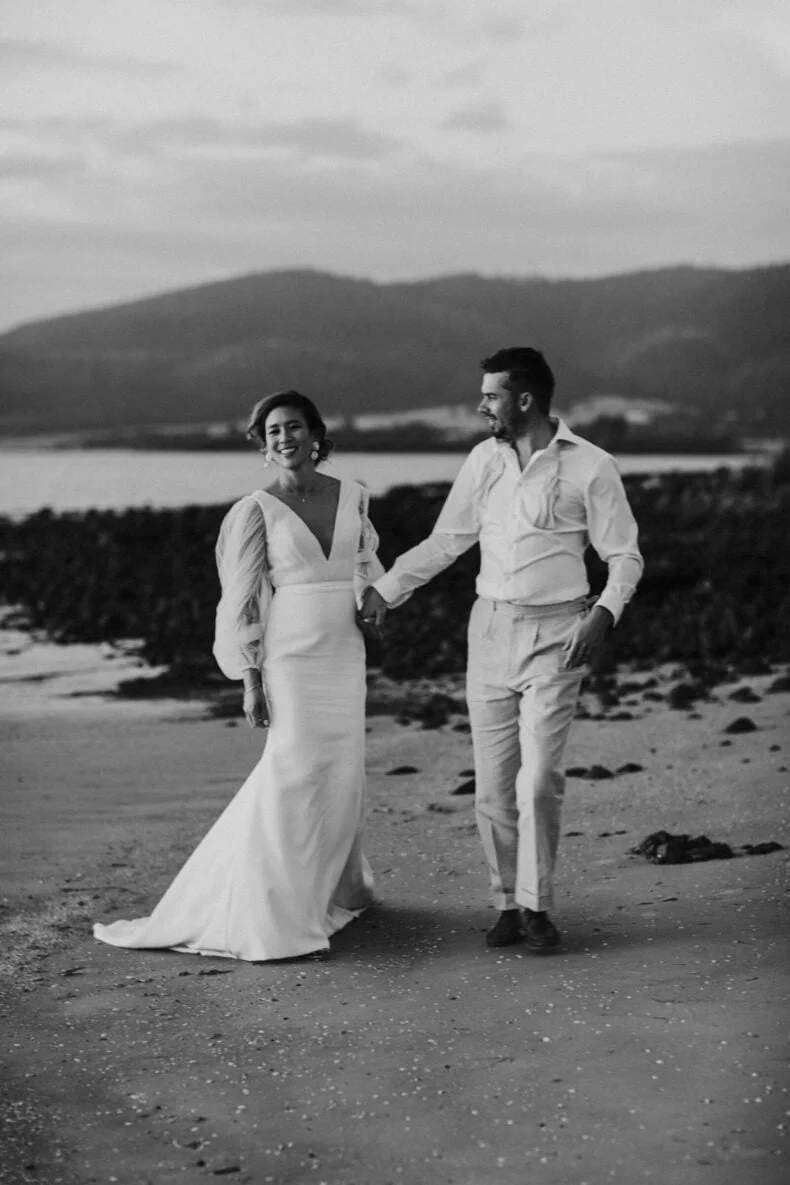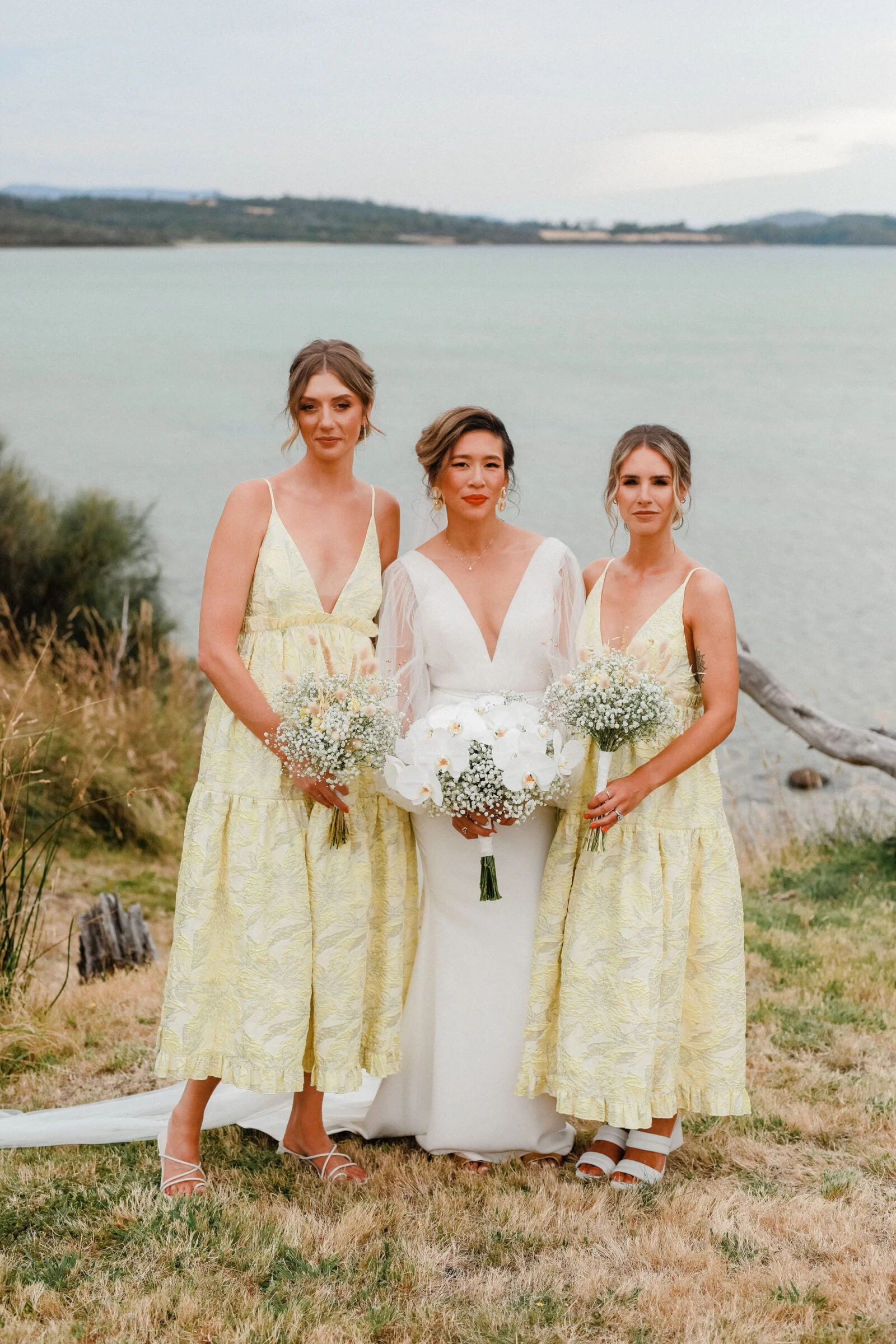 CONTRIBUTING VENDORS Photographer Cassie Sullivan Weddings Florist Billy Button Co Stationery (Place cards) Letters by Jessie, (Invites) Paperless Post Printer Carbon8 Ceremony & reception venue Private property adjoining Dunalley Bay Tasting Hut Catering Sabre Events + Catering Cake Made by family friend Wedding favours Dunalley Bay Distillery Hire Items & Marquee Salters Hire Entertainment & sound hire Baker Boys Band Celebrant Le Lien; Emily Campbell Rings Mejuri Transport Belbins Buses Portaloos Little Island Event Co THE BRIDE Bridal gown designer Chosen by Kyha Bridal Boutique Love Marie Veil eBay Robes In Bed Shoes Cult Gaia Accessories Natalie Alamein Hair Kimberley Temata Makeup The Makeup Bar Hobart Fragrance Black Saffron by Byredo Bridesmaid dresses ASOS THE GROOM Suit, shirt, bow tie & groomsmen suits Mawson Ossa Shoes Urge via The Iconic Watch Nixon