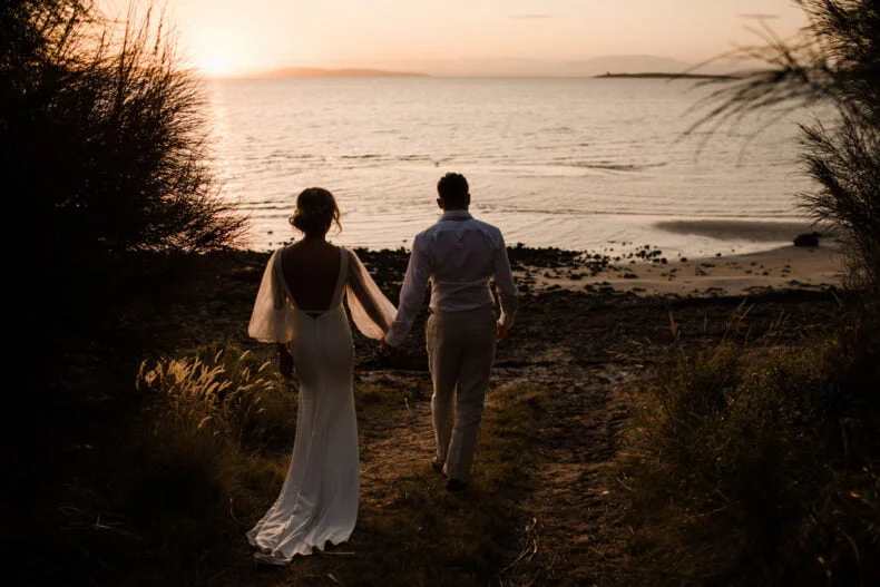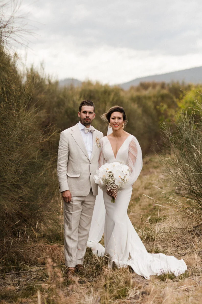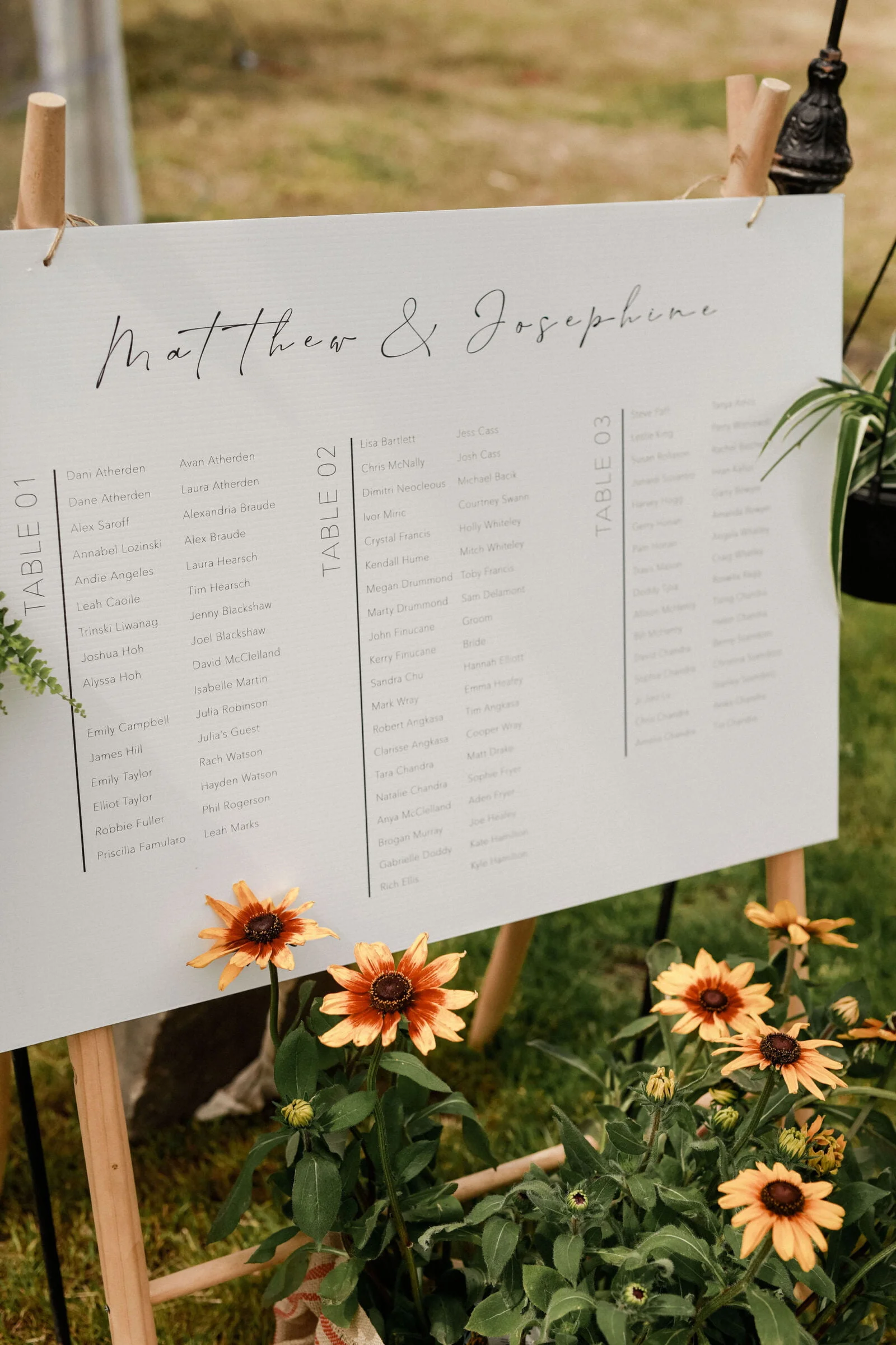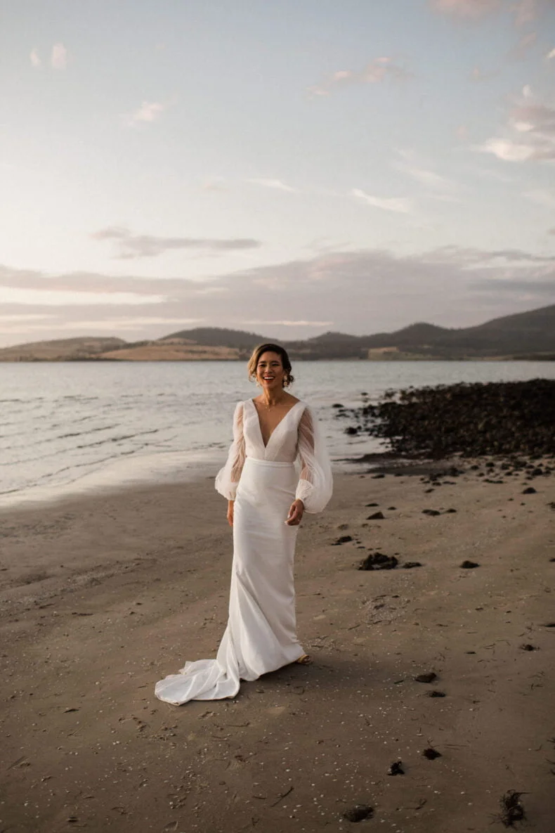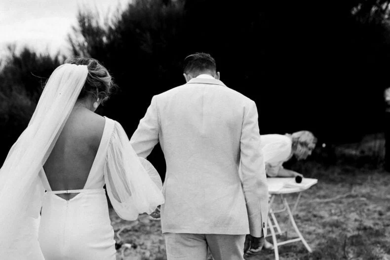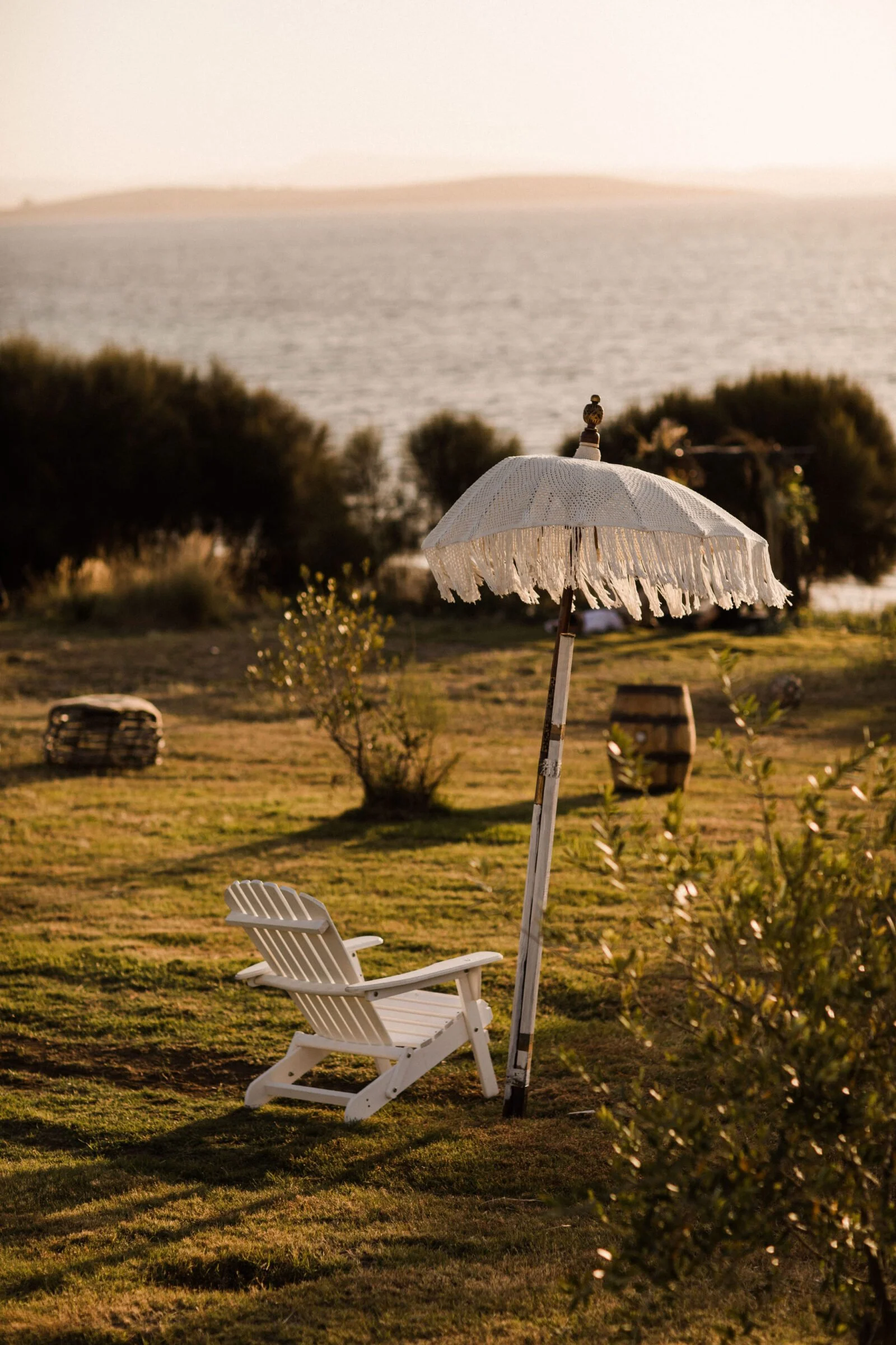 CONTRIBUTING VENDORS Photographer Cassie Sullivan Weddings Florist Billy Button Co Stationery (Place cards) Letters by Jessie, (Invites) Paperless Post Printer Carbon8 Ceremony & reception venue Private property adjoining Dunalley Bay Tasting Hut Catering Sabre Events + Catering Cake Made by family friend Wedding favours Dunalley Bay Distillery Hire Items & Marquee Salters Hire Entertainment & sound hire Baker Boys Band Celebrant Le Lien; Emily Campbell Rings Mejuri Transport Belbins Buses Portaloos Little Island Event Co THE BRIDE Bridal gown designer Chosen by Kyha Bridal Boutique Love Marie Veil eBay Robes In Bed Shoes Cult Gaia Accessories Natalie Alamein Hair Kimberley Temata Makeup The Makeup Bar Hobart Fragrance Black Saffron by Byredo Bridesmaid dresses ASOS THE GROOM Suit, shirt, bow tie & groomsmen suits Mawson Ossa Shoes Urge via The Iconic Watch Nixon