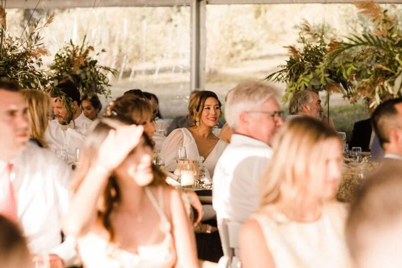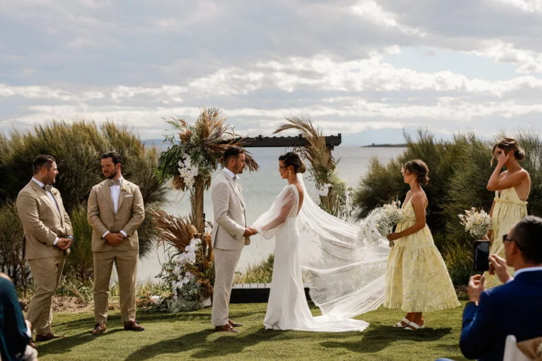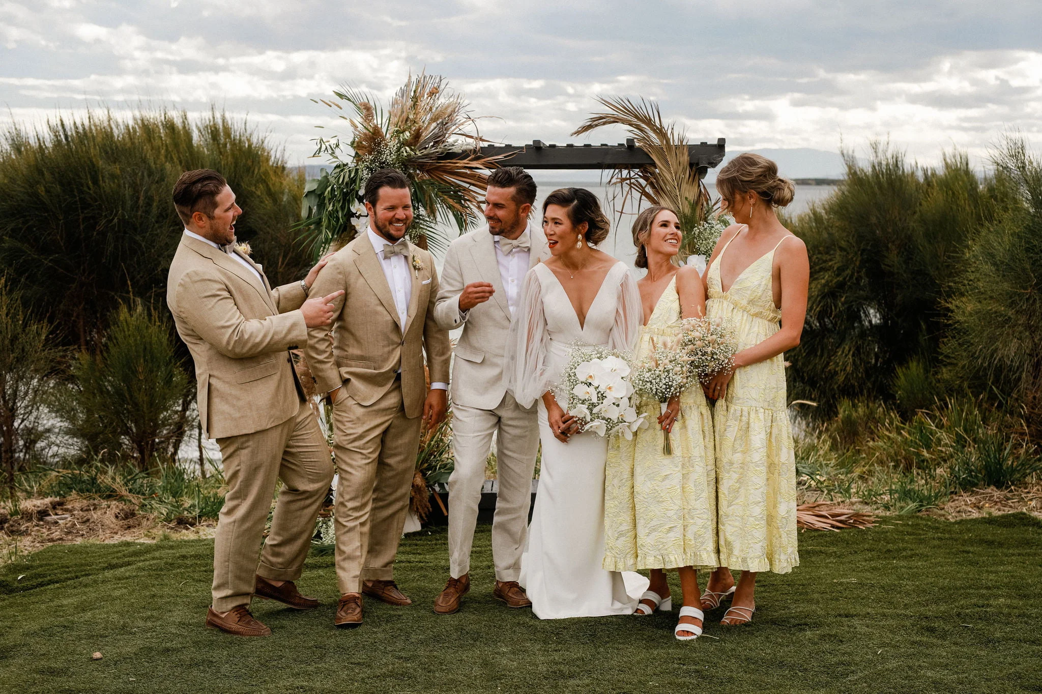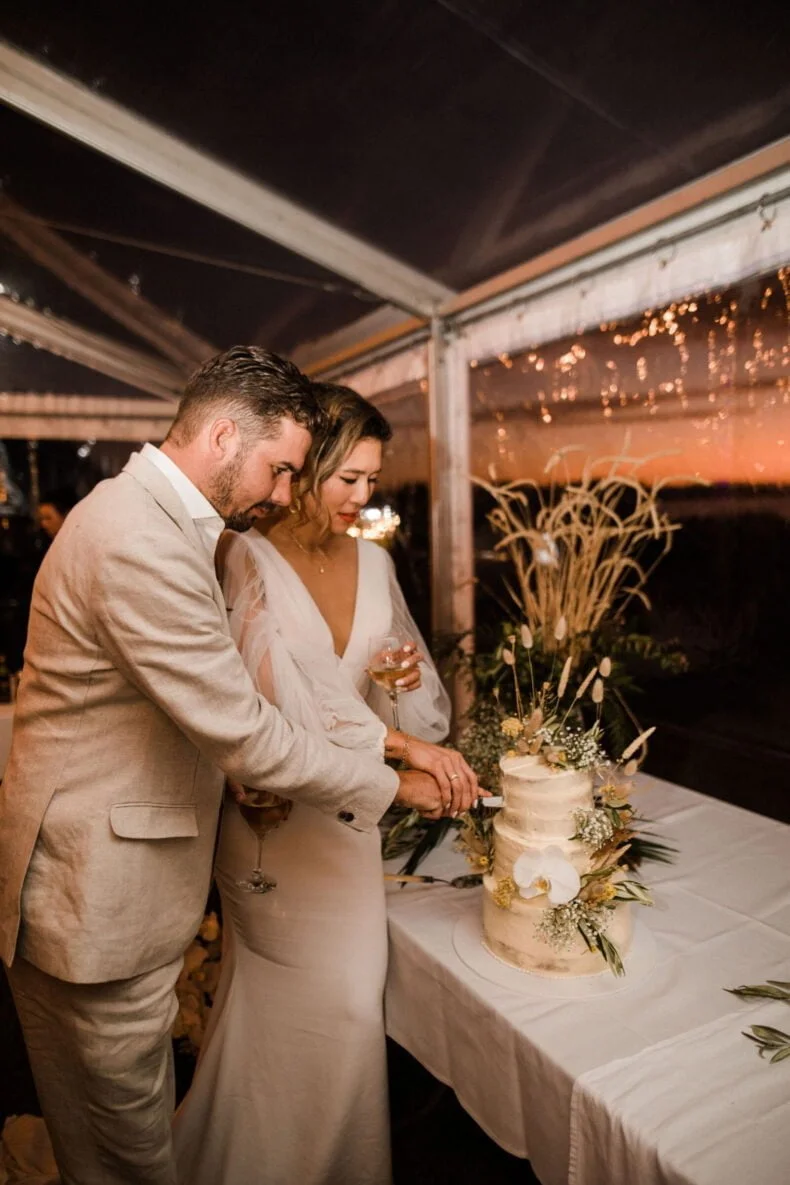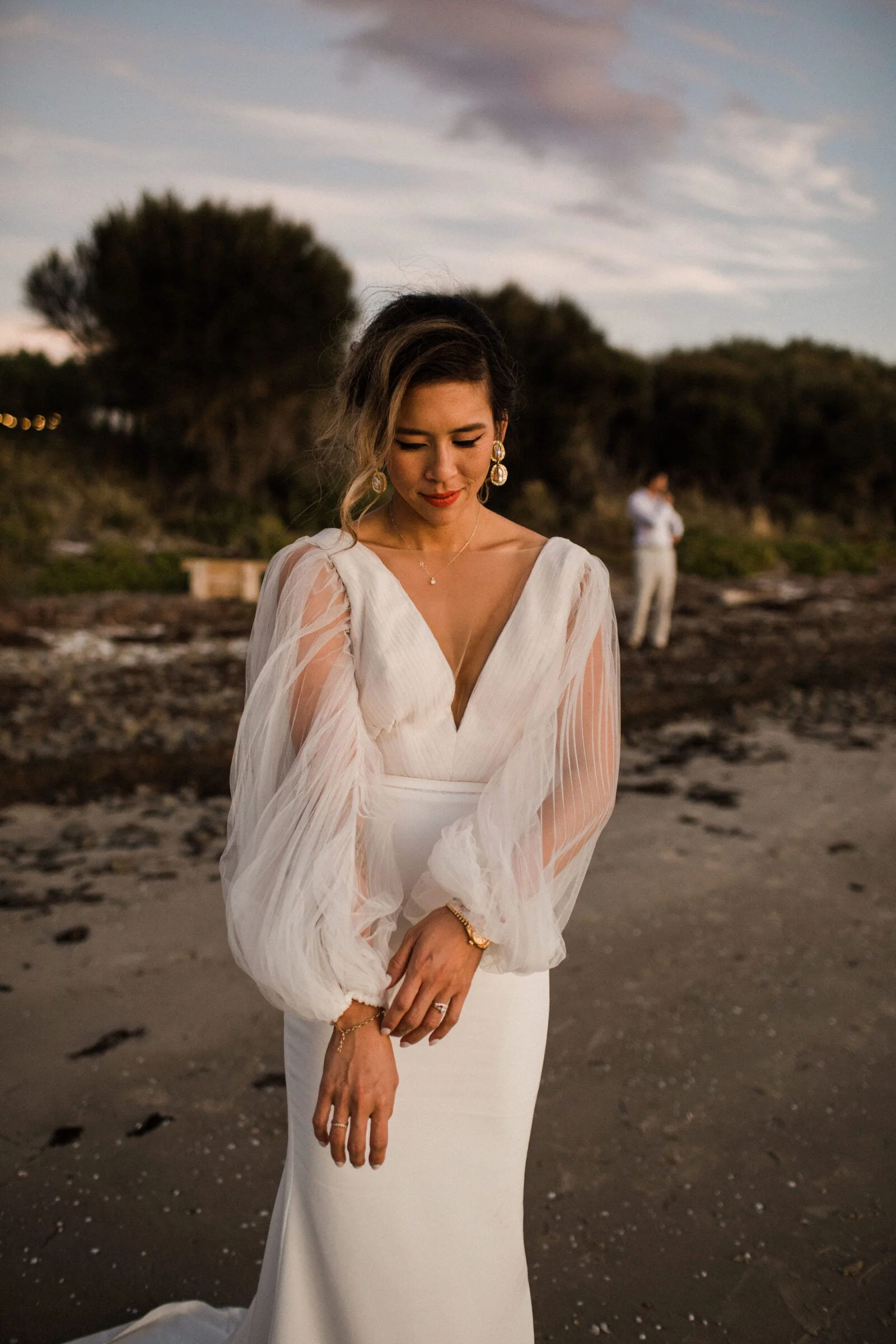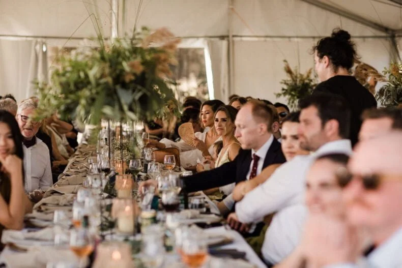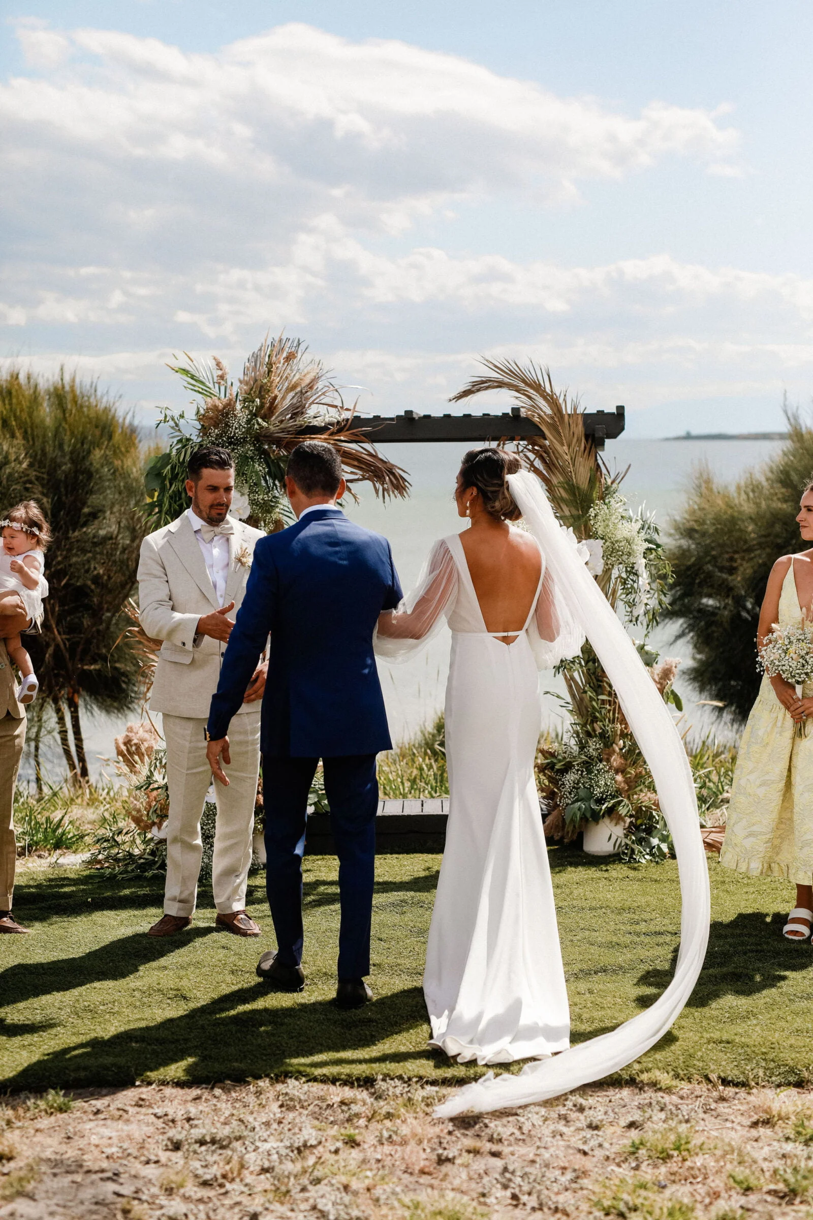 CONTRIBUTING VENDORS Photographer Cassie Sullivan Weddings Florist Billy Button Co Stationery (Place cards) Letters by Jessie, (Invites) Paperless Post Printer Carbon8 Ceremony & reception venue Private property adjoining Dunalley Bay Tasting Hut Catering Sabre Events + Catering Cake Made by family friend Wedding favours Dunalley Bay Distillery Hire Items & Marquee Salters Hire Entertainment & sound hire Baker Boys Band Celebrant Le Lien; Emily Campbell Rings Mejuri Transport Belbins Buses Portaloos Little Island Event Co THE BRIDE Bridal gown designer Chosen by Kyha Bridal Boutique Love Marie Veil eBay Robes In Bed Shoes Cult Gaia Accessories Natalie Alamein Hair Kimberley Temata Makeup The Makeup Bar Hobart Fragrance Black Saffron by Byredo Bridesmaid dresses ASOS THE GROOM Suit, shirt, bow tie & groomsmen suits Mawson Ossa Shoes Urge via The Iconic Watch Nixon