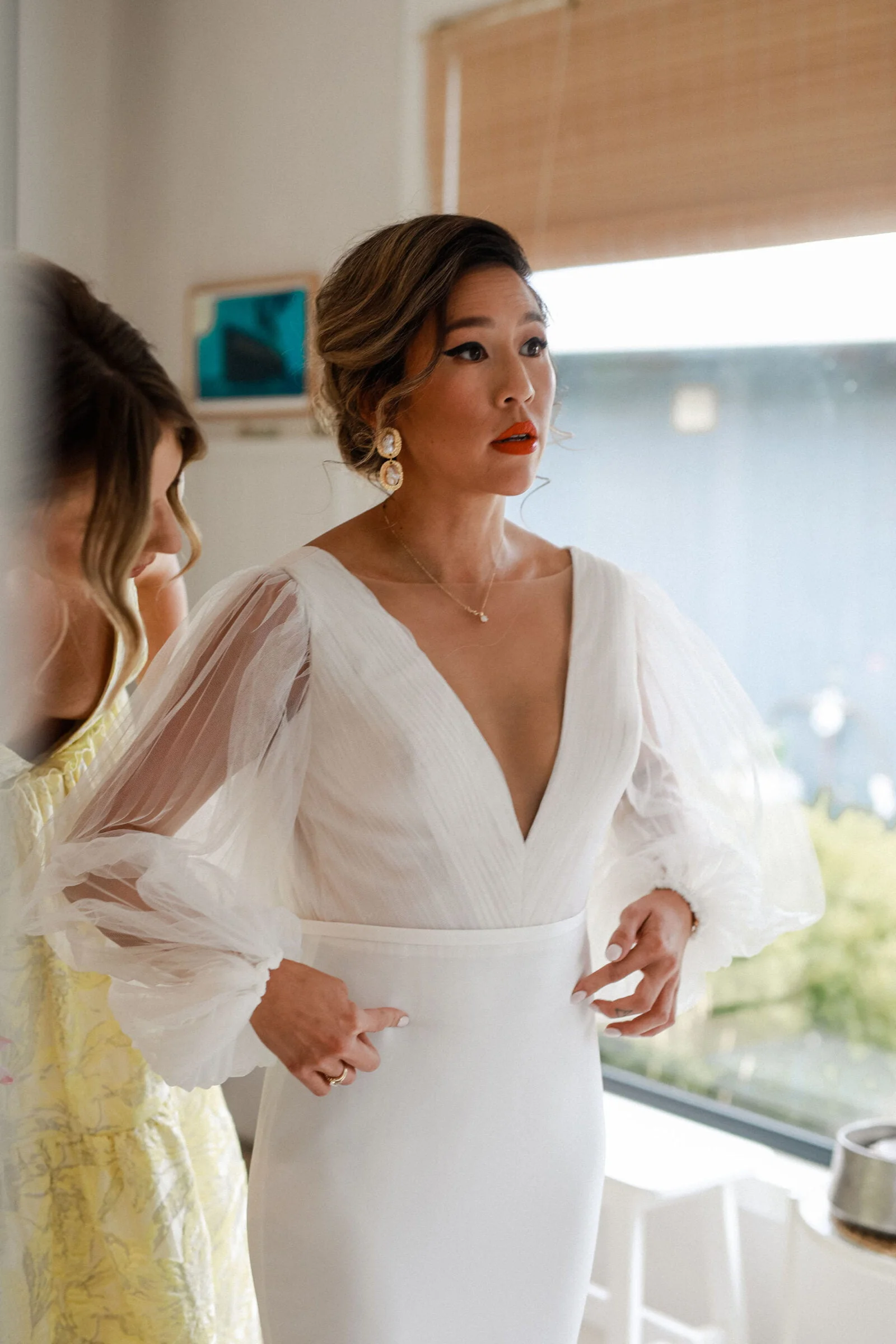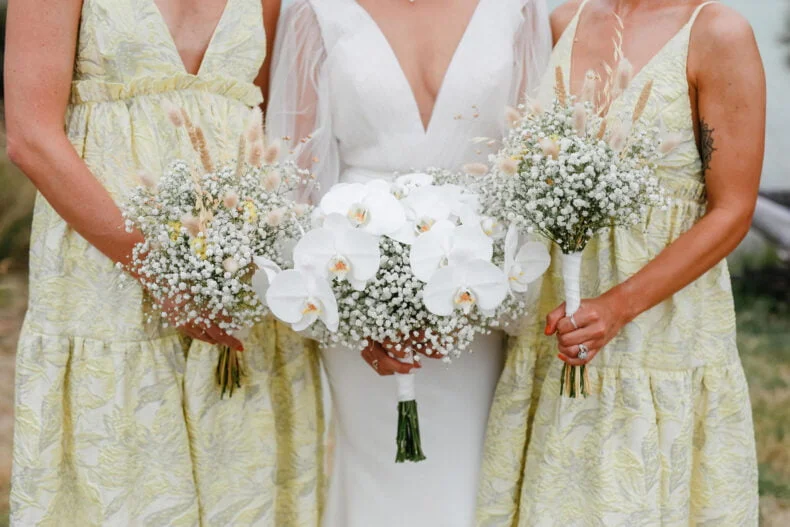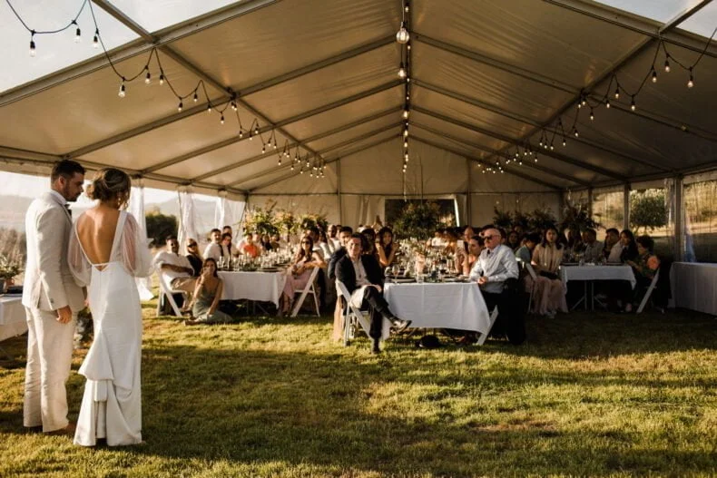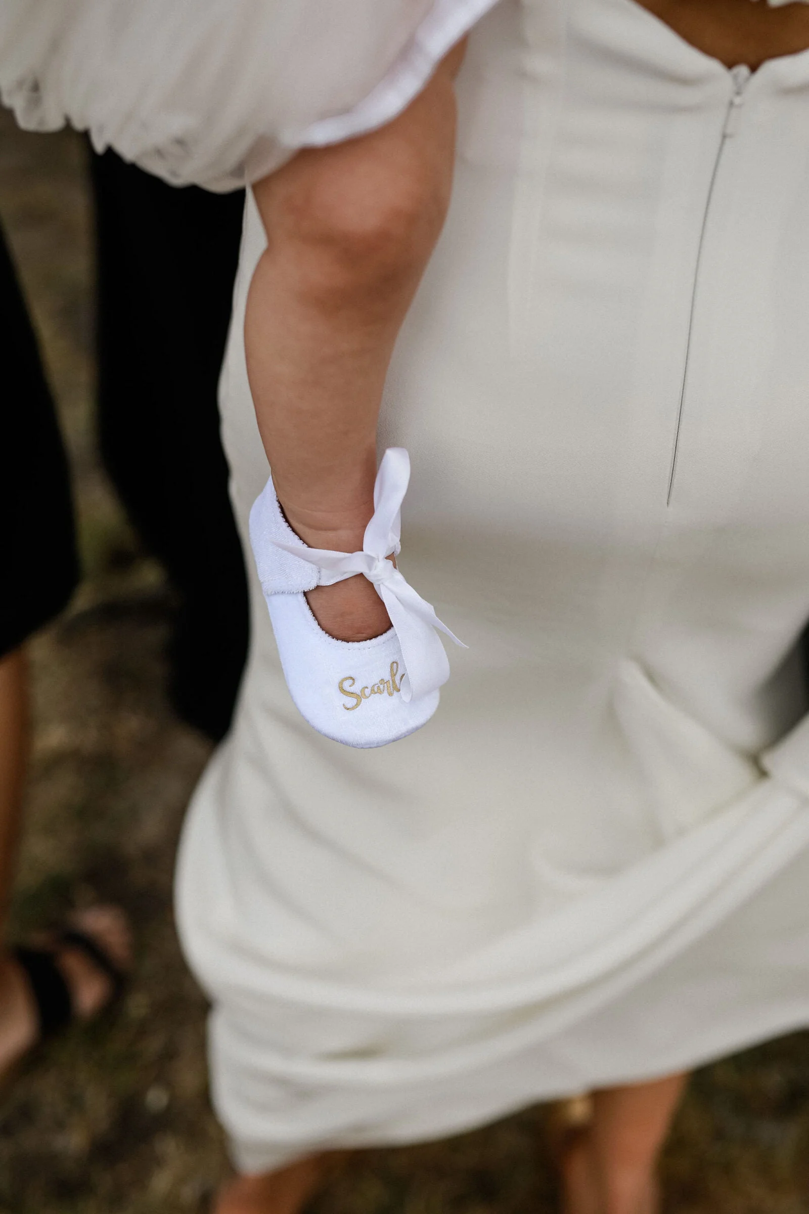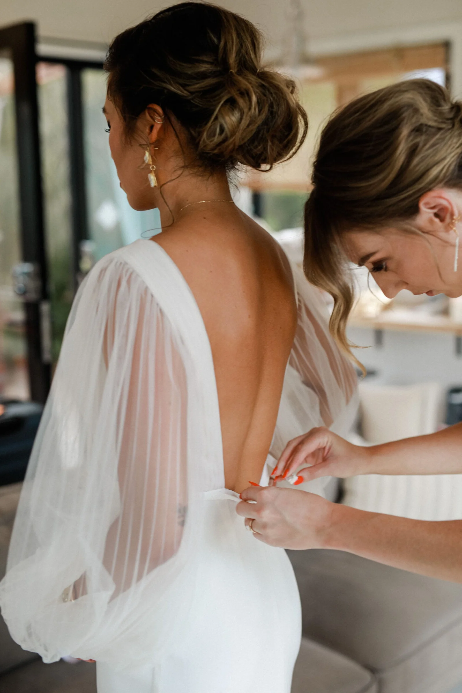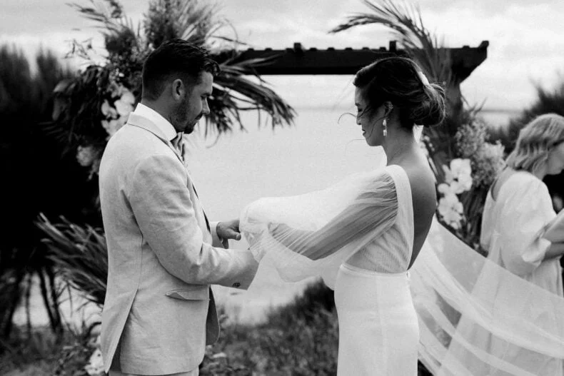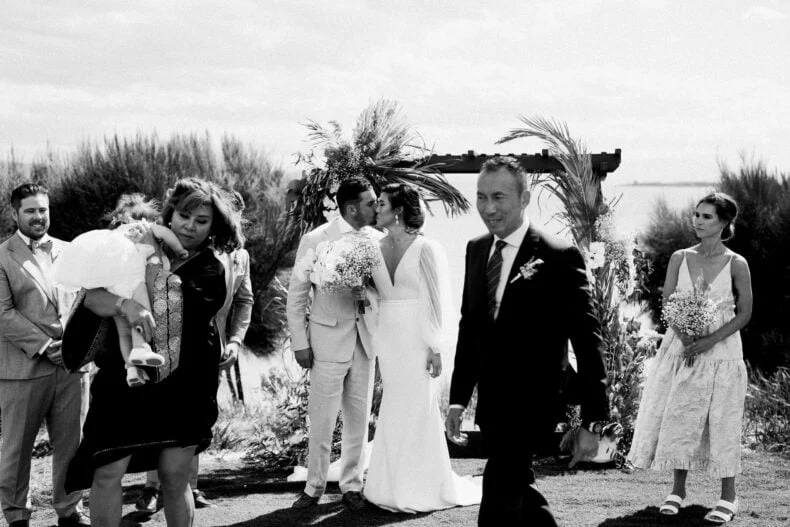 CONTRIBUTING VENDORS Photographer Cassie Sullivan Weddings Florist Billy Button Co Stationery (Place cards) Letters by Jessie, (Invites) Paperless Post Printer Carbon8 Ceremony & reception venue Private property adjoining Dunalley Bay Tasting Hut Catering Sabre Events + Catering Cake Made by family friend Wedding favours Dunalley Bay Distillery Hire Items & Marquee Salters Hire Entertainment & sound hire Baker Boys Band Celebrant Le Lien; Emily Campbell Rings Mejuri Transport Belbins Buses Portaloos Little Island Event Co THE BRIDE Bridal gown designer Chosen by Kyha Bridal Boutique Love Marie Veil eBay Robes In Bed Shoes Cult Gaia Accessories Natalie Alamein Hair Kimberley Temata Makeup The Makeup Bar Hobart Fragrance Black Saffron by Byredo Bridesmaid dresses ASOS THE GROOM Suit, shirt, bow tie & groomsmen suits Mawson Ossa Shoes Urge via The Iconic Watch Nixon