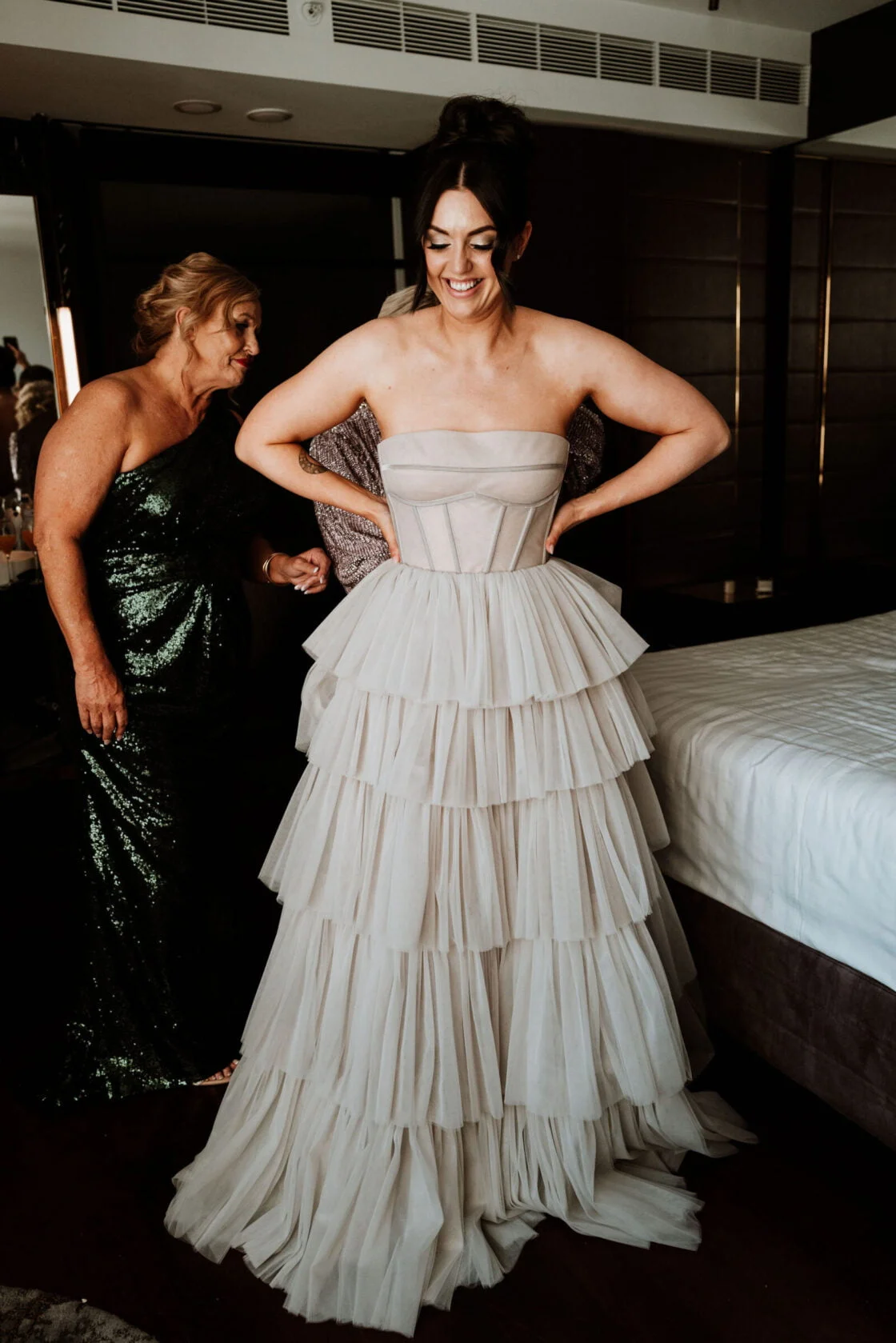 THE VENUE “Due to all the restrictions we kind of went in blind with trying to find a venue interstate when we were unable to travel. All we wanted was one venue that could host both our ceremony and reception as well as have the option for accommodation given we had guests travelling from interstate. We had a few issues given the short notice however, after we connected with QT Perth it all came together. We were able to host the ceremony in a function room, the pre-reception drinks in their bar and the reception in their private dining room, which all worked out perfectly. It was just a breeze not having to have all our guests trek across town to multiple different venues over the course of the afternoon/evening.”