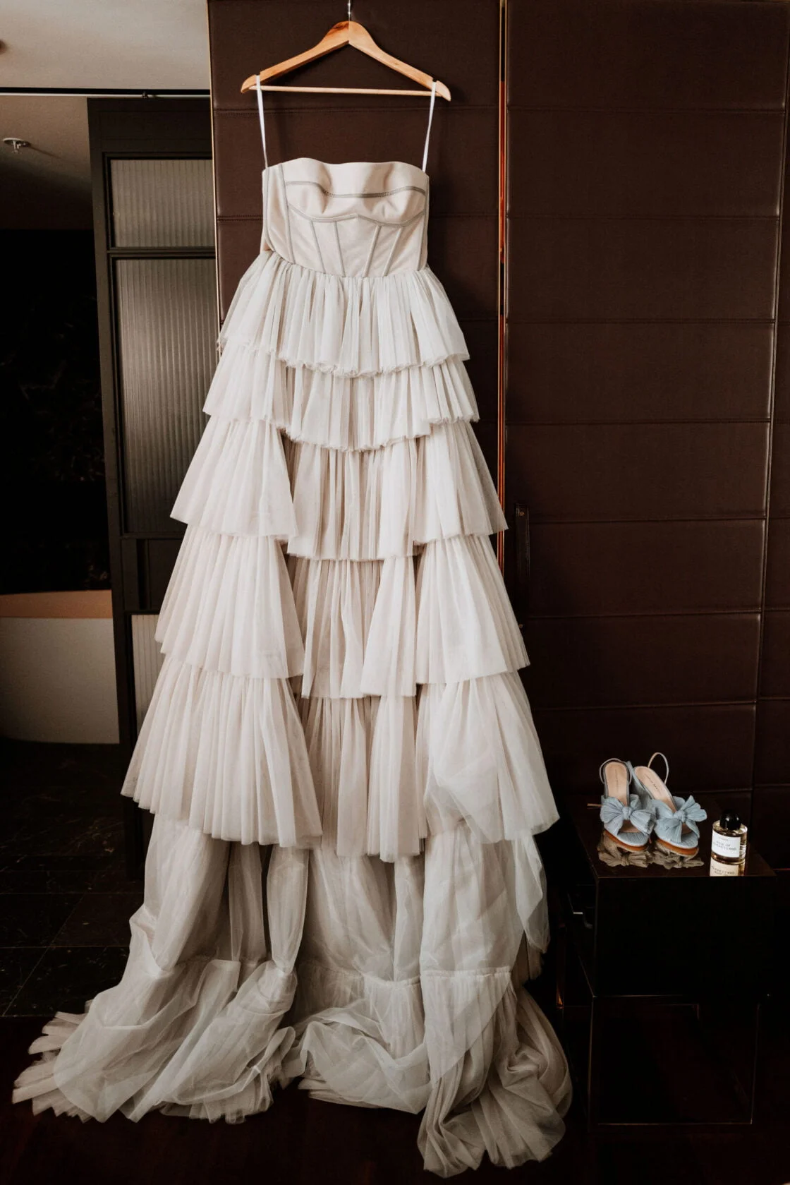 THE DRESS “I had tried on a few white dresses but none of them felt like ‘the one’. I had seen this dress by Vagabond Bridal online and could not believe it when I realised there was a boutique in SA, Imagine Bridal Lounge, that stocked it. I had an appointment with the boutique all booked in and two days beforehand, COVID sent us into lockdown. The ladies at Imagine Bridal were amazing and squeezed me in before the lockdowns kicked in at midnight. So Gary, being the absolute angel he is, drove me over an hour away at 9:30pm and sat in the car while I tried on dresses alone. The second I put it on I knew it was the one. Lucky for me, my dress was able to be rush ordered and arrived just a few weeks out from our big day.”