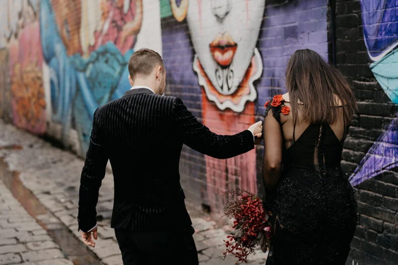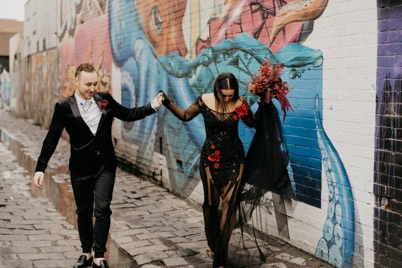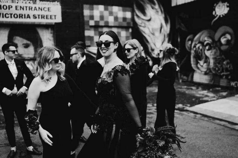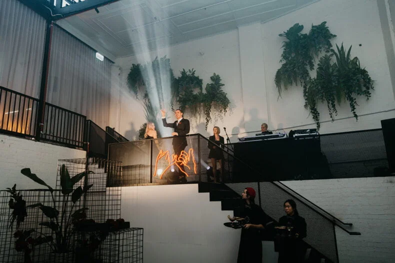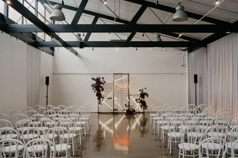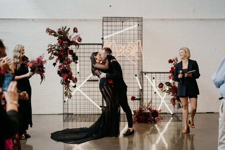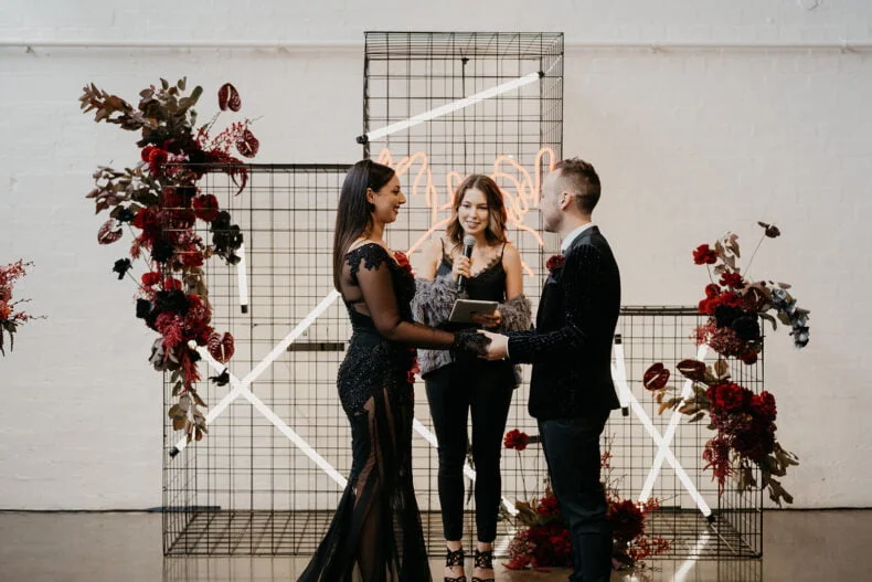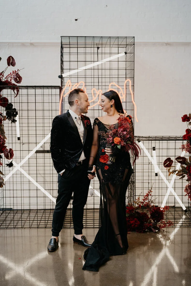 FAVE DEETS “Our ceremony backdrop was very special – an installation of black Davey cubes, neon battens, dark florals that housed a custom neon sign of a pinky promise that now sits on our wall at home above our bar – our love story that’s come full circle from bar to bar! Seeing our “nightclub” come alive with a neon tube lighting installation that moved up and down with the beat of the music.”