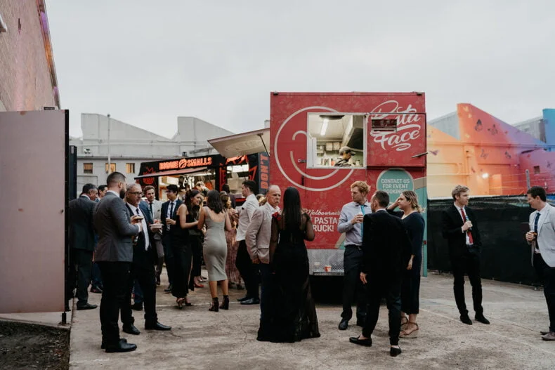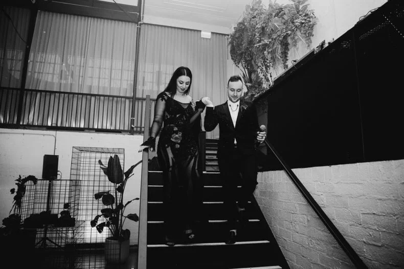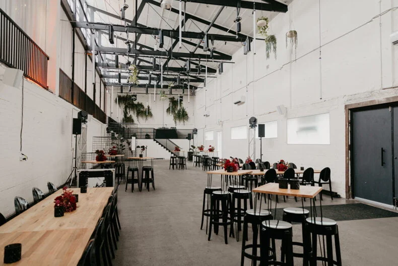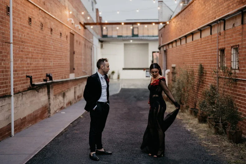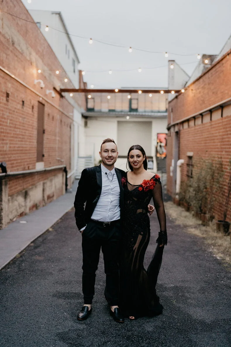 THE VENUE “I knew we needed a blank canvas to bring the vision we had to life. It also needed to be a big space to cater to our guest list. We looked high and low for an empty warehouse-style venue in Melbourne but nothing met the brief. Within seconds of walking into The Wool Mill, we knew we found the right place – we could set up a ceremony space, cocktail lounge, reception/party arena, speakeasy bar and food truck park all in the one venue. Added bonuses were that we could make it our wedding, without having to plan it ourselves. The Wool Mill is related to Nudo who offer planning and management services as part of the venue hire.”