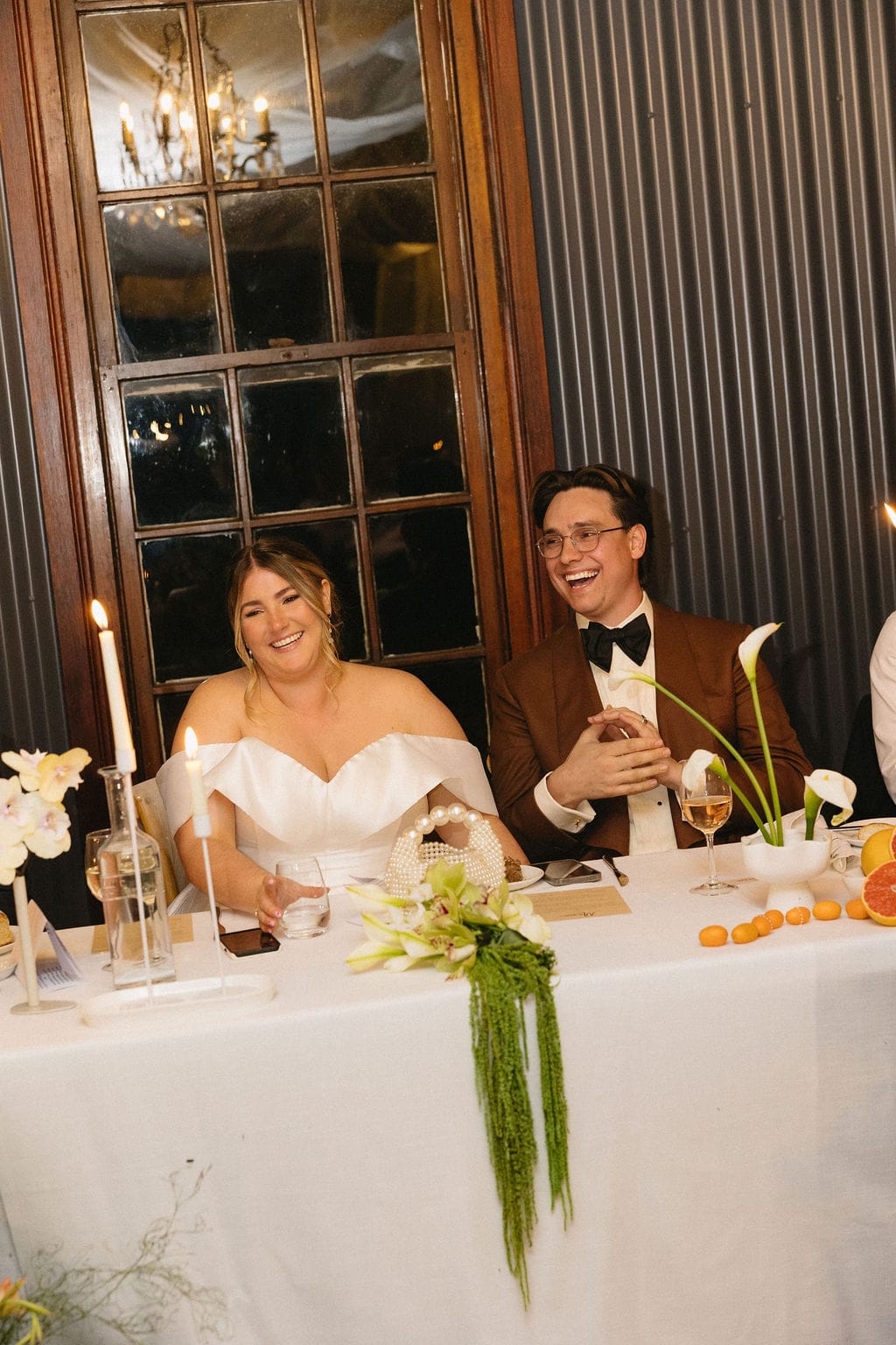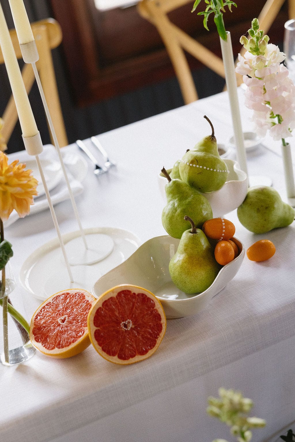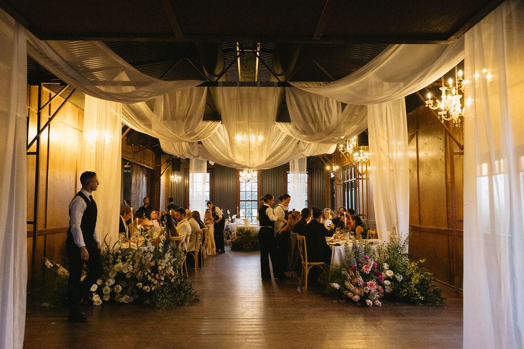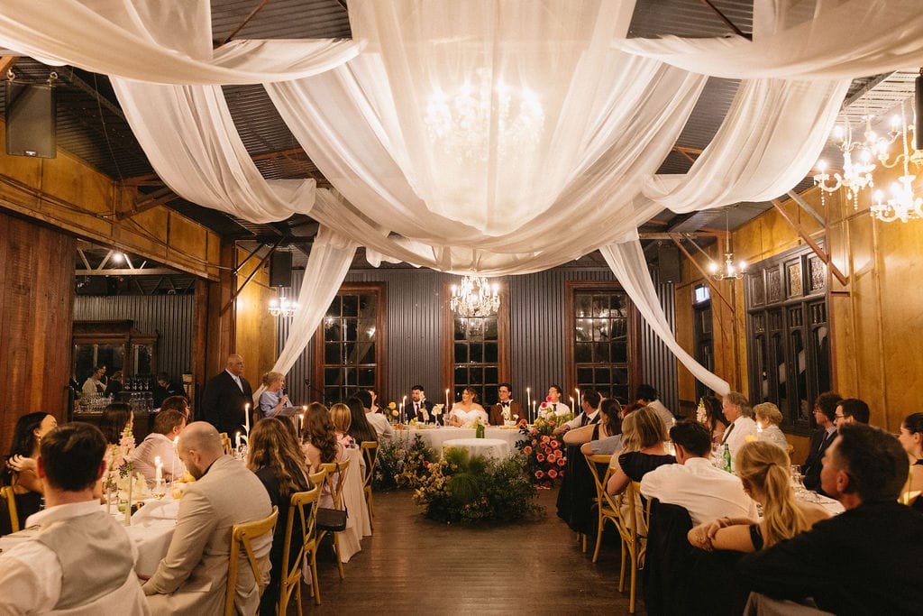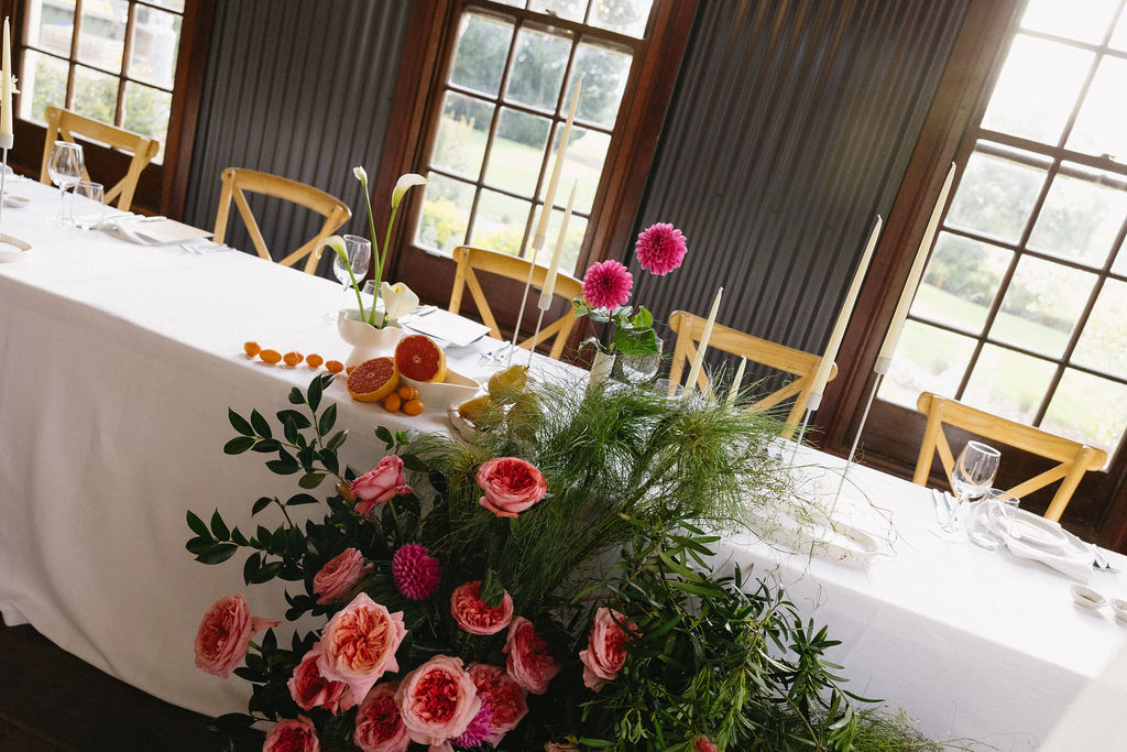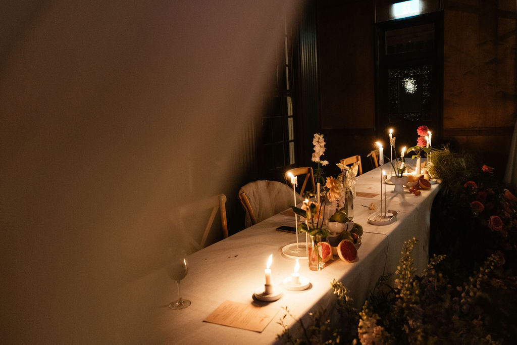 “[The] flowers: Nasser’s prompt for Pia & Jade for our ceremony was that he wanted to feel like we were in a flower garden. [They were also] able to move the ceremony florals to the reception, which allowed us to continue to feel like we were in that beautiful garden. Drinks: we had Limoncello spritz as one of the cocktails during cocktail hour, which was a lovely nod to the fun times we’ve had drinking them on holiday holidays with friends. Reception styling: one of our guests’ favourite details from the night was the fruit (such as grapefruit) cut into half with little pearl hearts placed on the flesh of the fruit. It was a little touch that added a lot of ‘wow’ to the night. Draping: Terrara House did the internal draping to the venue which softened the feel and look of the reception space. Lastly, our DJ brought a disco ball which added a lot of fun to the dance floor…”