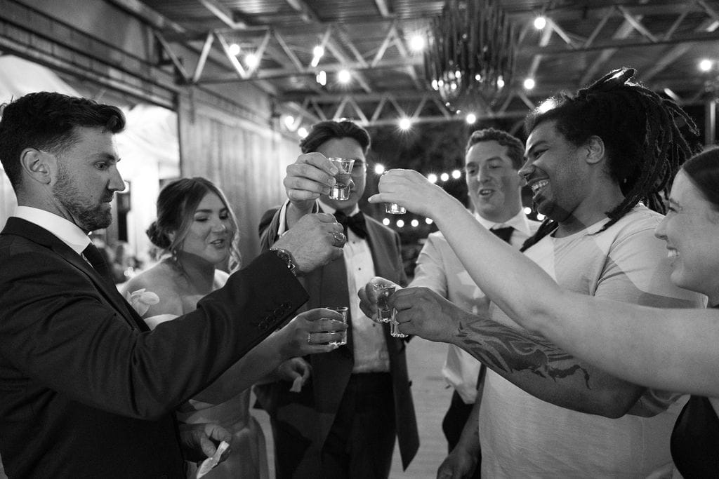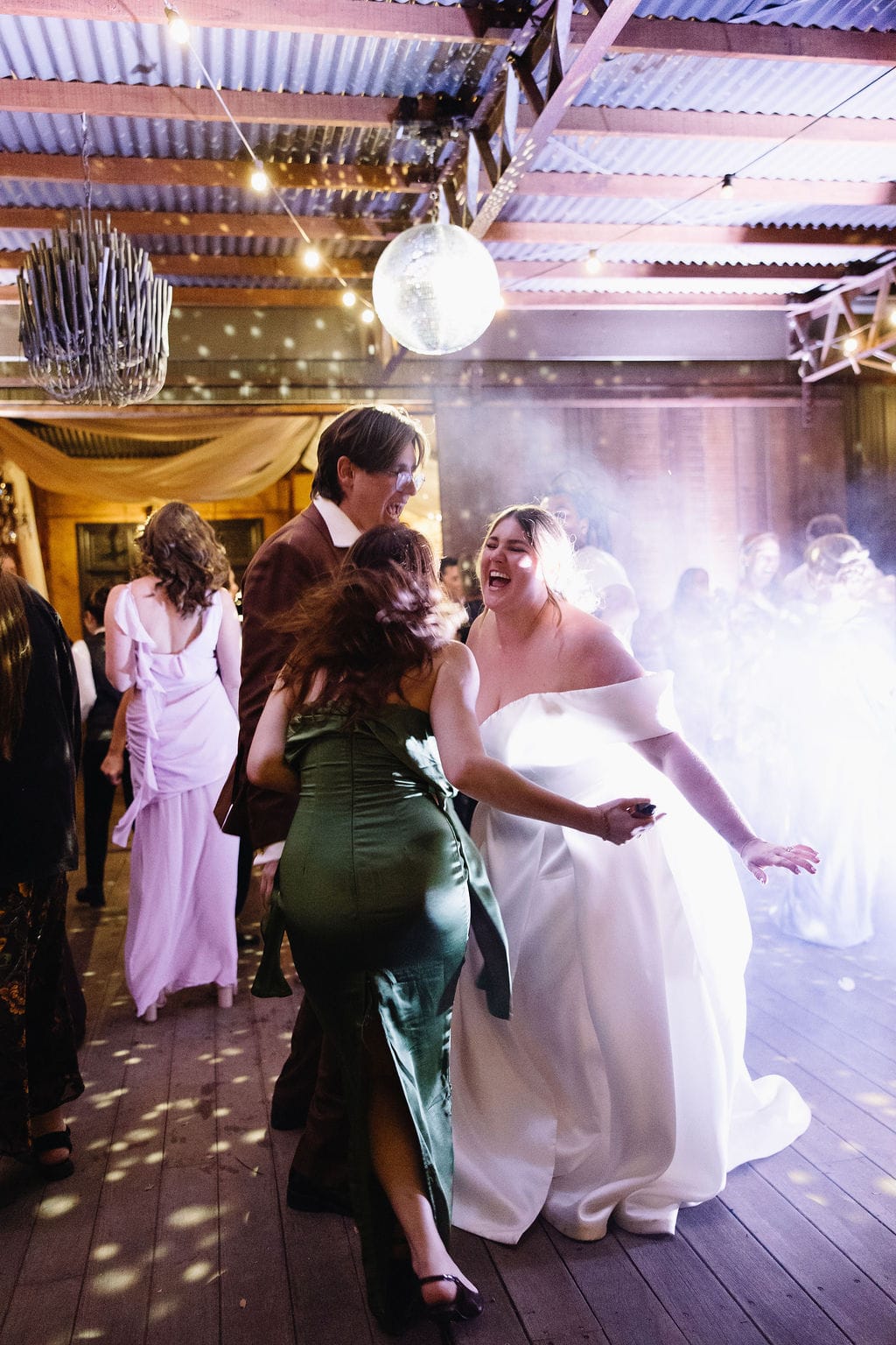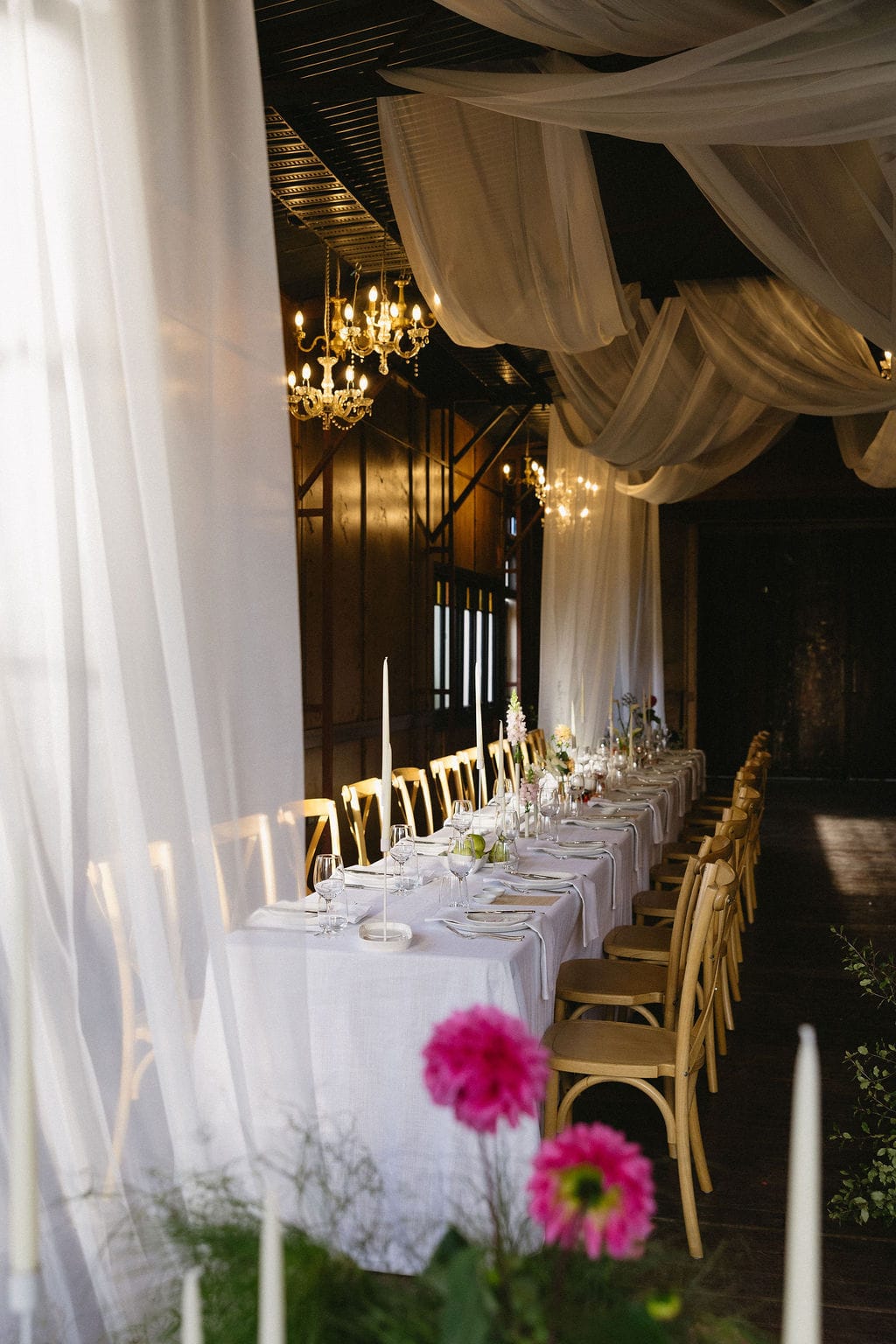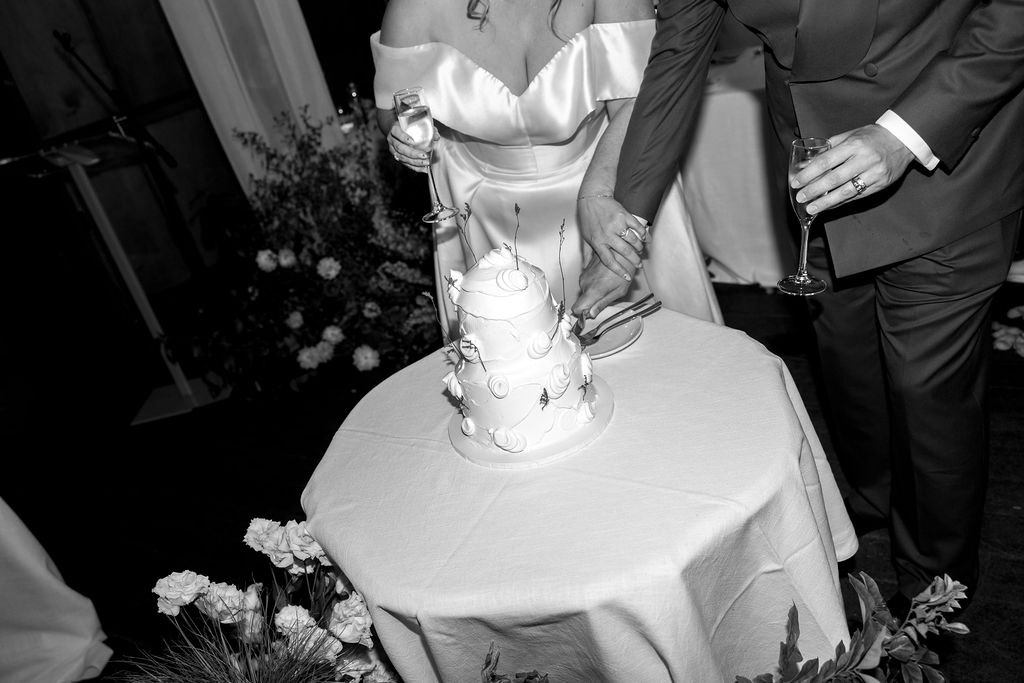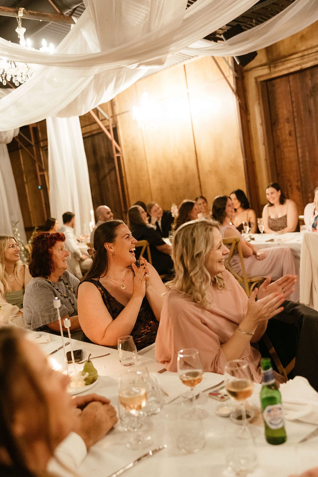 “[The] flowers: Nasser’s prompt for Pia & Jade for our ceremony was that he wanted to feel like we were in a flower garden. [They were also] able to move the ceremony florals to the reception, which allowed us to continue to feel like we were in that beautiful garden. Drinks: we had Limoncello spritz as one of the cocktails during cocktail hour, which was a lovely nod to the fun times we’ve had drinking them on holiday holidays with friends. Reception styling: one of our guests’ favourite details from the night was the fruit (such as grapefruit) cut into half with little pearl hearts placed on the flesh of the fruit. It was a little touch that added a lot of ‘wow’ to the night. Draping: Terrara House did the internal draping to the venue which softened the feel and look of the reception space. Lastly, our DJ brought a disco ball which added a lot of fun to the dance floor…”