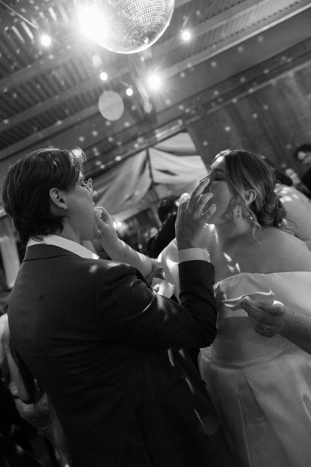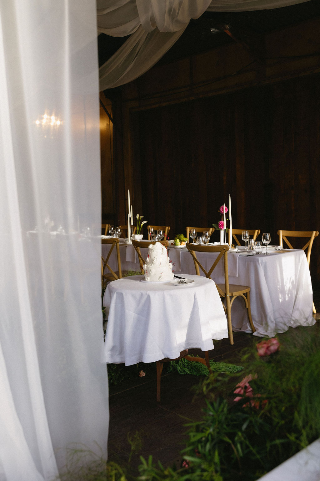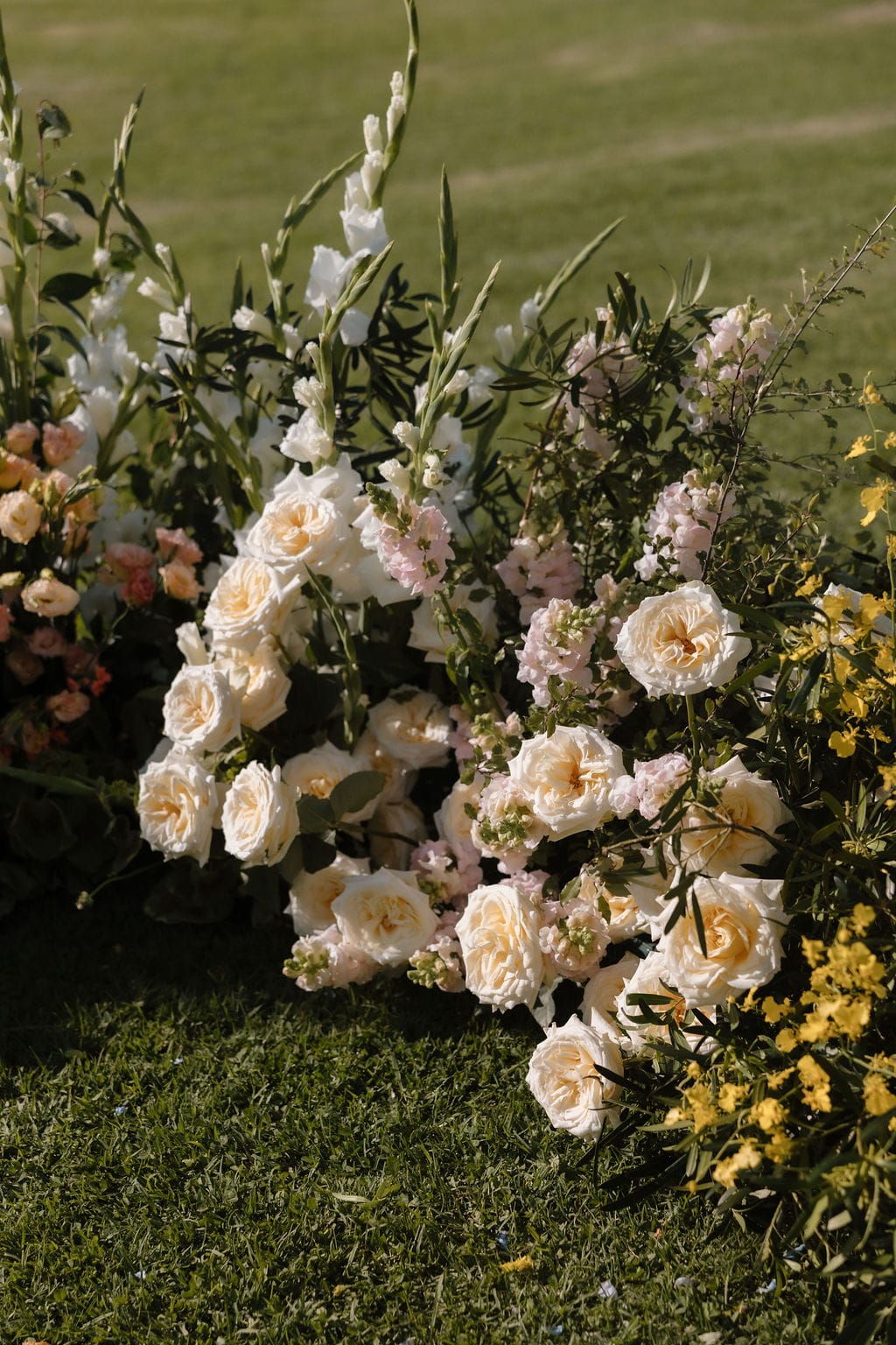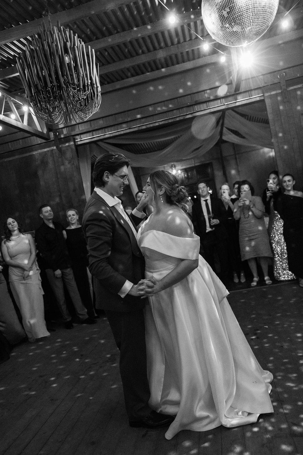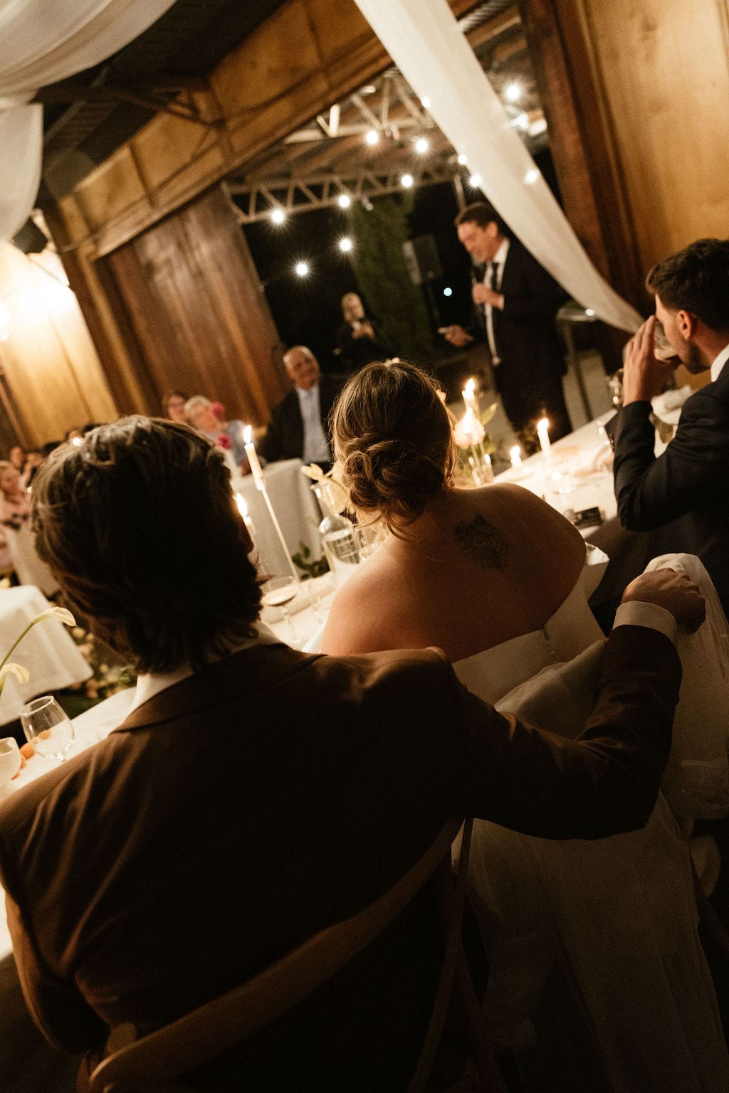 “[The] flowers: Nasser’s prompt for Pia & Jade for our ceremony was that he wanted to feel like we were in a flower garden. [They were also] able to move the ceremony florals to the reception, which allowed us to continue to feel like we were in that beautiful garden. Drinks: we had Limoncello spritz as one of the cocktails during cocktail hour, which was a lovely nod to the fun times we’ve had drinking them on holiday holidays with friends. Reception styling: one of our guests’ favourite details from the night was the fruit (such as grapefruit) cut into half with little pearl hearts placed on the flesh of the fruit. It was a little touch that added a lot of ‘wow’ to the night. Draping: Terrara House did the internal draping to the venue which softened the feel and look of the reception space. Lastly, our DJ brought a disco ball which added a lot of fun to the dance floor…”