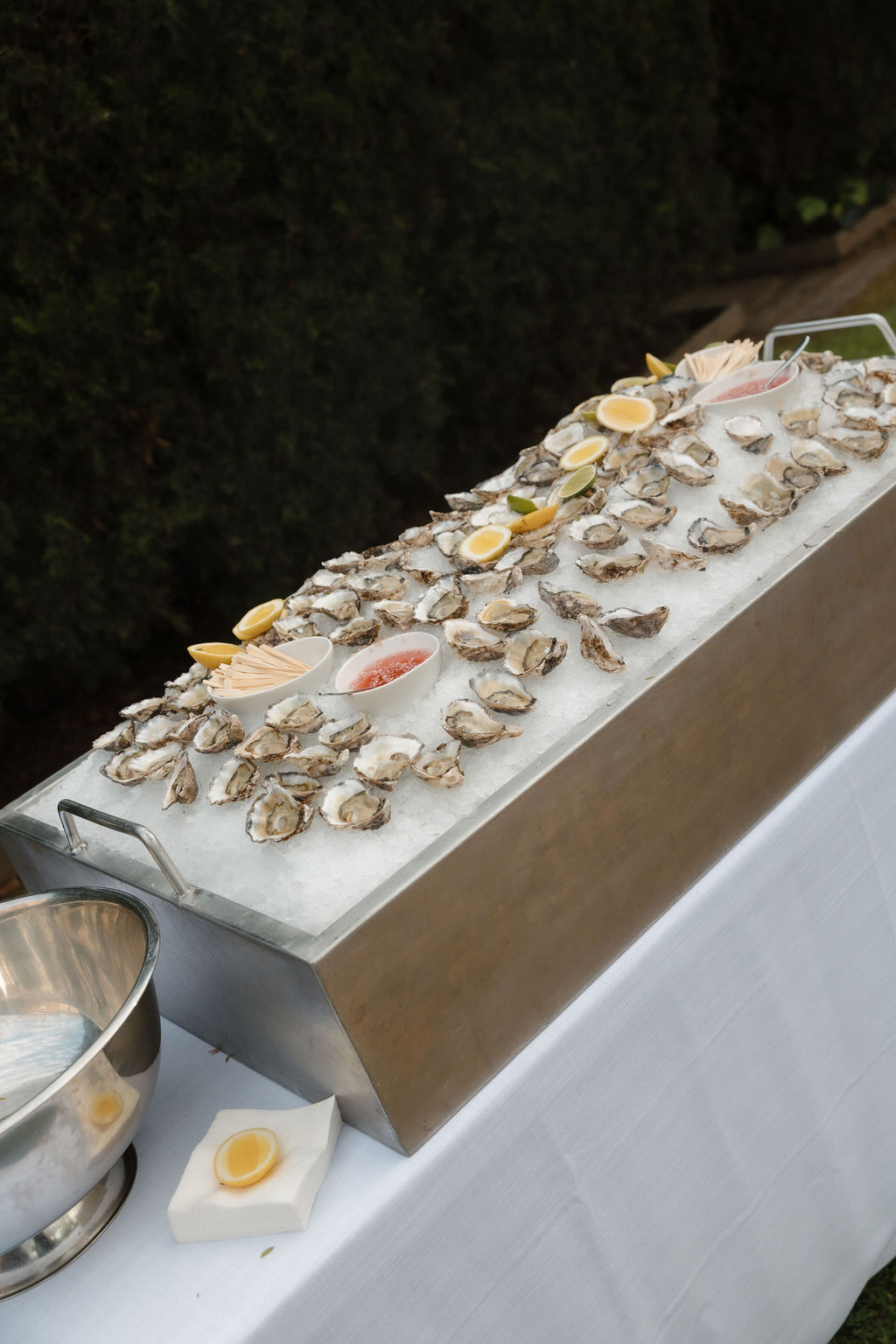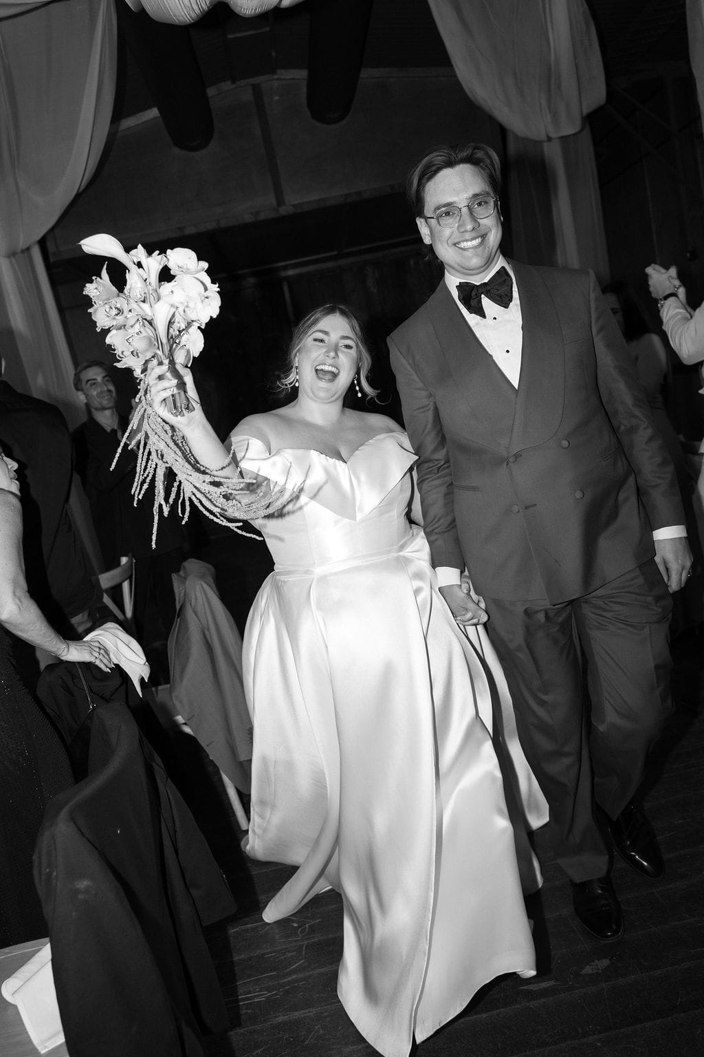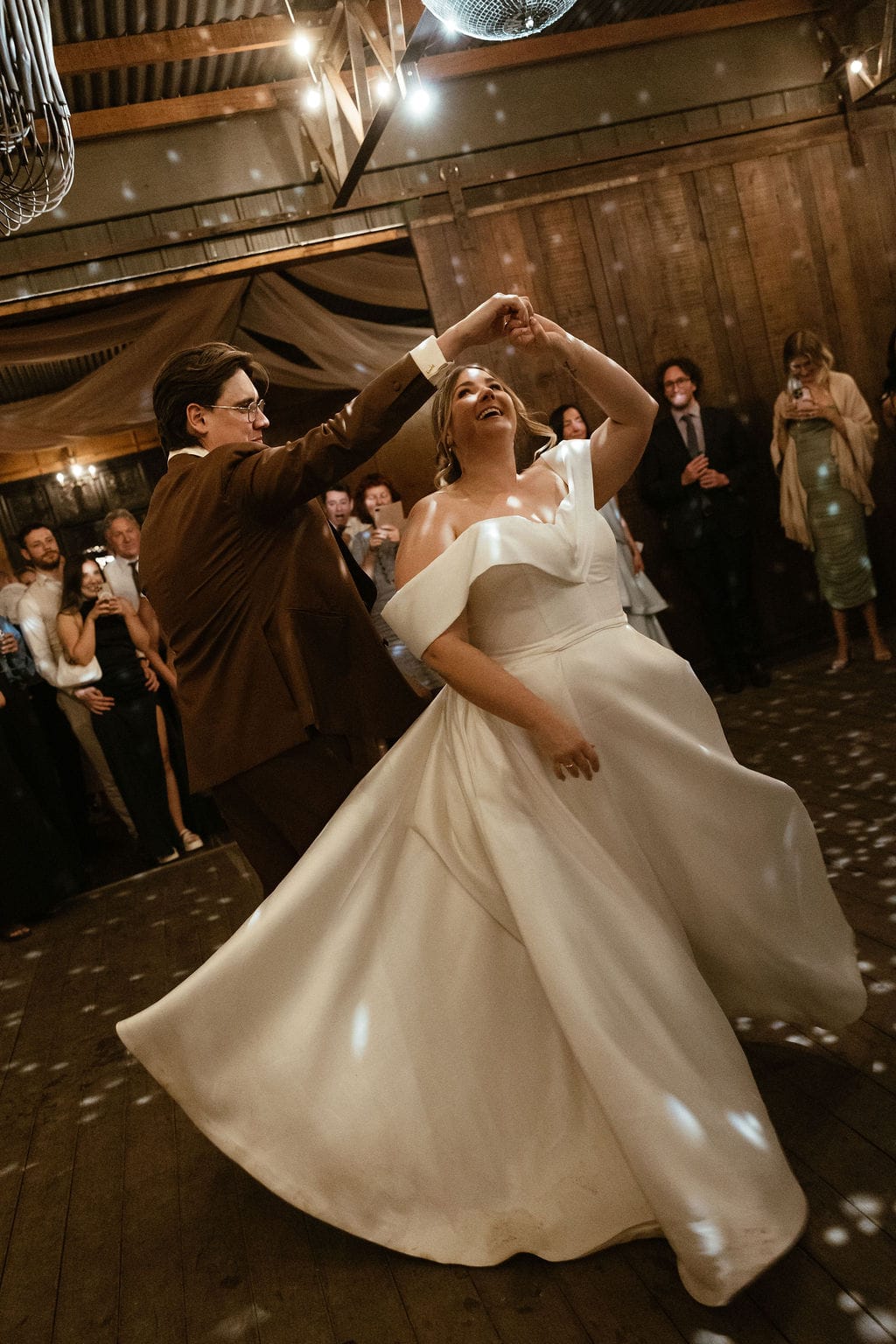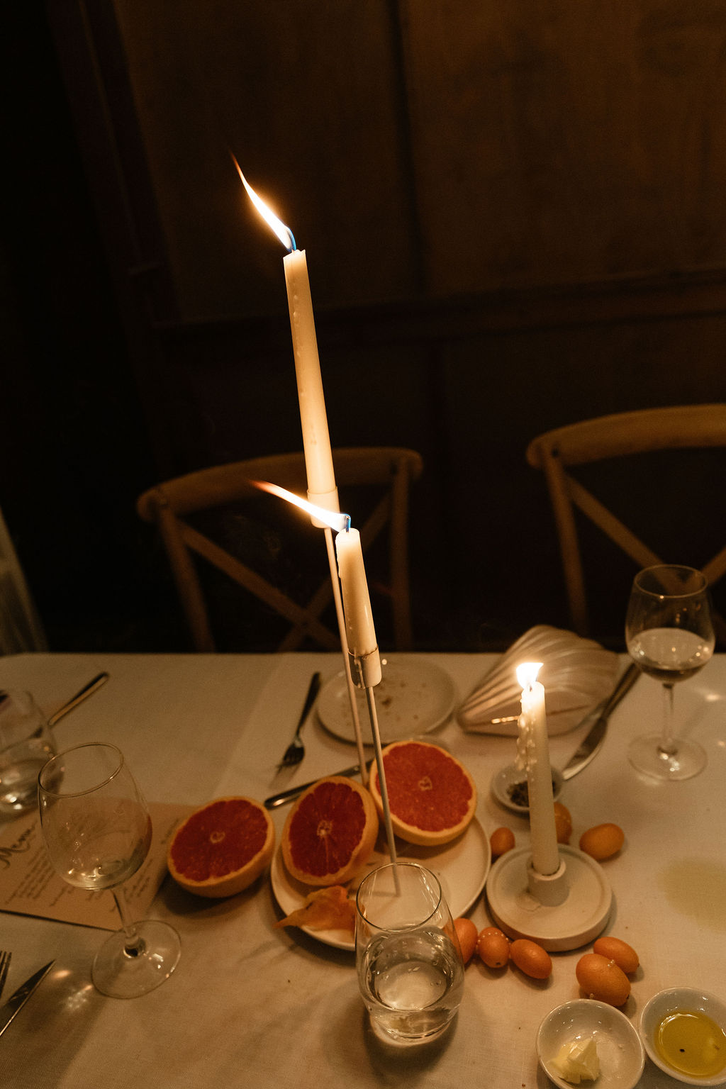 “[The] flowers: Nasser’s prompt for Pia & Jade for our ceremony was that he wanted to feel like we were in a flower garden. [They were also] able to move the ceremony florals to the reception, which allowed us to continue to feel like we were in that beautiful garden. Drinks: we had Limoncello spritz as one of the cocktails during cocktail hour, which was a lovely nod to the fun times we’ve had drinking them on holiday holidays with friends. Reception styling: one of our guests’ favourite details from the night was the fruit (such as grapefruit) cut into half with little pearl hearts placed on the flesh of the fruit. It was a little touch that added a lot of ‘wow’ to the night. Draping: Terrara House did the internal draping to the venue which softened the feel and look of the reception space. Lastly, our DJ brought a disco ball which added a lot of fun to the dance floor…”