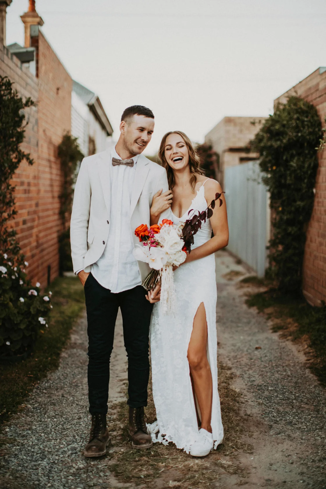CONTRIBUTING VENDORS Photographer James Simmons Photography Cinematographer Clover. Stylist The Event Mill Florist Fox and Rabbit Stationery Canva (DIY) Printer Snap Ceremony & Reception Assembly Yard Catering & Food Truck Soul Provider Catering Cake Friend Hire Items The Event Mill Signage Neon Collective Entertainment Aslan Celebrant Married by Brooke Rings Michael Hill (Kerry) & Etrnl (Rhett) Transport Shane Sutton (friend) THE BRIDE Bridal Gown & Veil Grace Loves Lace Pyjamas Piyama Shoes Alias Mae & Seed Heritage Hair Styled Mane Makeup FACES by Cheri Bridesmaid Dresses Bec + Bridge via Coco & Lola Bridesmaid Gifts Seed Heritage (Earnings) & Piyama (Pyjamas) THE GROOM Jacket ZARA Shirt Industrie via David Jones Pants yd. Bow Tie OTAA Shoes Dr. Martens Watch UNCLE JACK Grooming Styled Mane Groomsmen Shirt Industrie via David Jones Groomsmen Pants yd. Groomsmen Gifts Stance (Socks) & OTAA (Bow Ties)