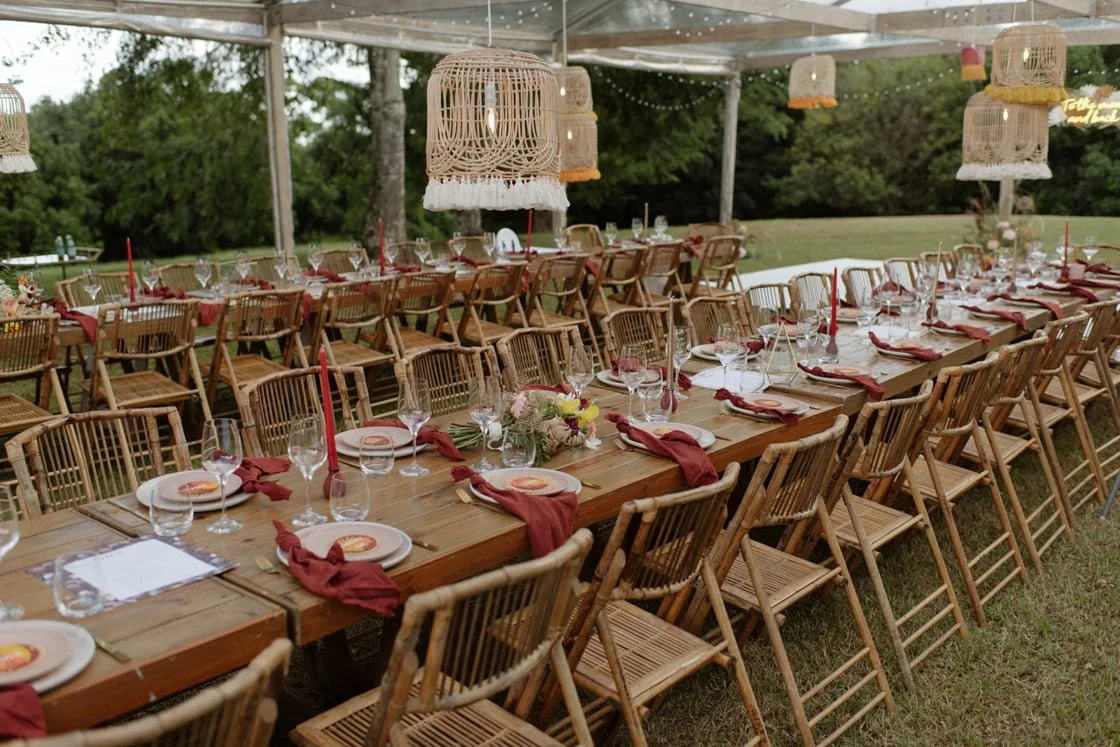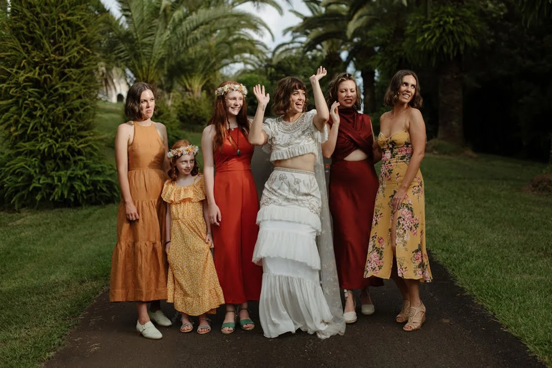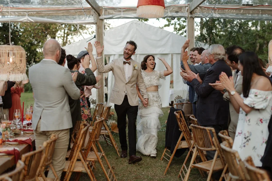 CONTRIBUTING VENDORS Photographer Ben Sowry Photo Event Planner Event Stylist and Co Florist Pikt Flowers Stationery Bliss & Bone Ceremony & Reception Hinterland House Catering Joe Chef Cake The Butterscotch Table (dessert table) Other desserts The Marshmallow Co. (giant marshmallow platters for roasting in the fire pit) Wedding favours StrangeLove (drinks), Byron Bay Cookie Company (cookies), Byron Bay Coffee Company (chocolate-covered macadamias), Bee One Third (local honey) Hire Items Memorable Moments (chairs, tables, cocktail lounges) Marquee Pavilion Marquees Entertainment Adelina Martinez (singer), Paul Henderson (guitarist), Coastal Beats (DJ) Celebrant Just Jess Ceremonies Rings Capucinne (engagement), family heirloom wedding rings Transport Byron Bus Co Child Minding Kidz Klub Australia THE BRIDE Gown Bo & Luca Bridal Boutique Bloom Cape Meadow Sweet Bridal Robes Craftluxe Australia Shoes Loeffler Randall Earrings A. B. Ellie Hair & Makeup Alex Ouston Beauty Bridesmaid dresses Reformation, Shona Joy, DISSH, ASOS Bridesmaid gifts Meadow Sweet Bridal (robes) Flower girls Corsages by Z (flower crowns) THE GROOM Suit InStitchu Shirt Calvin Klein Bow tie Peggy and Finn Shoes Double Oak Mills Watch Vintage Tag Heuer Carrera Barber Rattlin’ Bones Barber Shop Groomsmen suits InStitchu Groomsmen gifts Skwosh (board shorts)