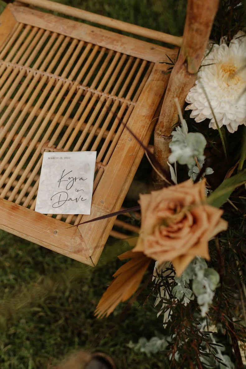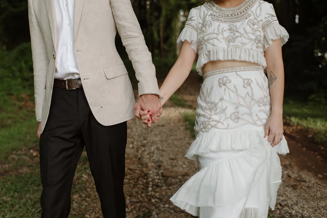 CONTRIBUTING VENDORS Photographer Ben Sowry Photo Event Planner Event Stylist and Co Florist Pikt Flowers Stationery Bliss & Bone Ceremony & Reception Hinterland House Catering Joe Chef Cake The Butterscotch Table (dessert table) Other desserts The Marshmallow Co. (giant marshmallow platters for roasting in the fire pit) Wedding favours StrangeLove (drinks), Byron Bay Cookie Company (cookies), Byron Bay Coffee Company (chocolate-covered macadamias), Bee One Third (local honey) Hire Items Memorable Moments (chairs, tables, cocktail lounges) Marquee Pavilion Marquees Entertainment Adelina Martinez (singer), Paul Henderson (guitarist), Coastal Beats (DJ) Celebrant Just Jess Ceremonies Rings Capucinne (engagement), family heirloom wedding rings Transport Byron Bus Co Child Minding Kidz Klub Australia THE BRIDE Gown Bo & Luca Bridal Boutique Bloom Cape Meadow Sweet Bridal Robes Craftluxe Australia Shoes Loeffler Randall Earrings A. B. Ellie Hair & Makeup Alex Ouston Beauty Bridesmaid dresses Reformation, Shona Joy, DISSH, ASOS Bridesmaid gifts Meadow Sweet Bridal (robes) Flower girls Corsages by Z (flower crowns) THE GROOM Suit InStitchu Shirt Calvin Klein Bow tie Peggy and Finn Shoes Double Oak Mills Watch Vintage Tag Heuer Carrera Barber Rattlin’ Bones Barber Shop Groomsmen suits InStitchu Groomsmen gifts Skwosh (board shorts)
