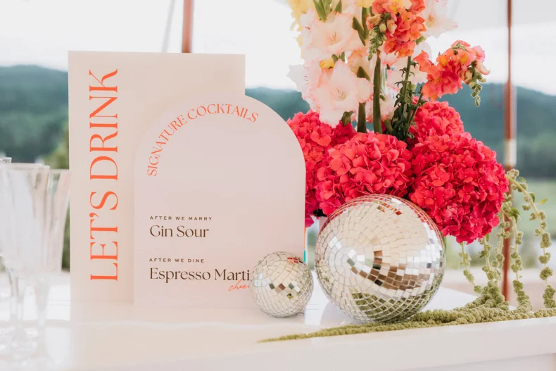 THE INSPO “A lot of colour to show-off our fun, positive and silly sides. Disco balls to reflect our love for a good old party. Film cameras because we love snapping photos to savour our memories. Epic signage because, as a designer, I knew I could make this cool AF. We didn’t overthink, ‘oh do these bits and pieces go together?’, instead it was more ‘does this give Bryn and Leah energy? If yes, we locked it in.”