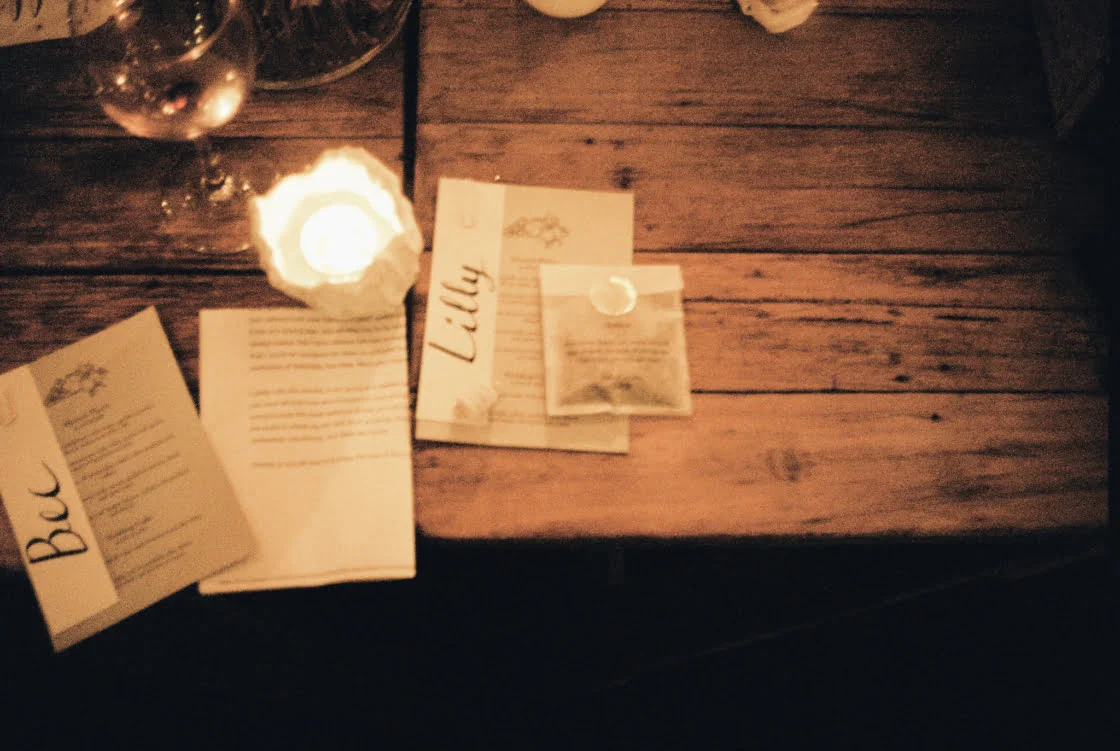 DIY “We worked on what seemed like an endless number of DIY projects. We didn’t have a large budget, nor did we want to go into debt to pay for our wedding – so we got creative and collaborated with friends and family to bring our vision together. We were also conscious of keeping waste to a minimum and for our day to have a low environmental impact. We foraged locally for wild grasses and flowers in the lead up to the day, and spent hours preparing leaf-etti from leaves found at Bec’s parents house, and from our own back garden. My mum sourced native dried flowers and grasses from her friend The Backyard Garden Enthusiast and the evening before our wedding we all came together to set up the bar, tables, chairs and lighting in the marquee. As gifts for our guests, I illustrated and hand sewed 60+ mini envelopes filled with fennel and sugar. Bec also wrote individual conversation questions which we placed with the table settings, and our friend Alex used calligraphy to write personalised place tags for each of our guests.”