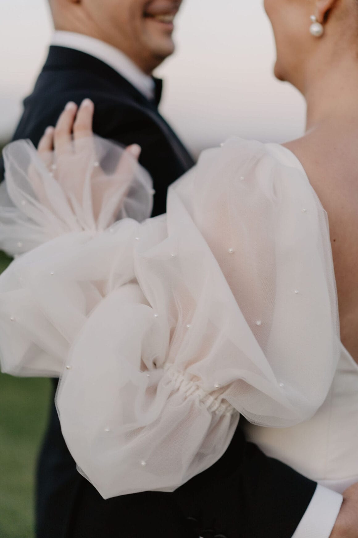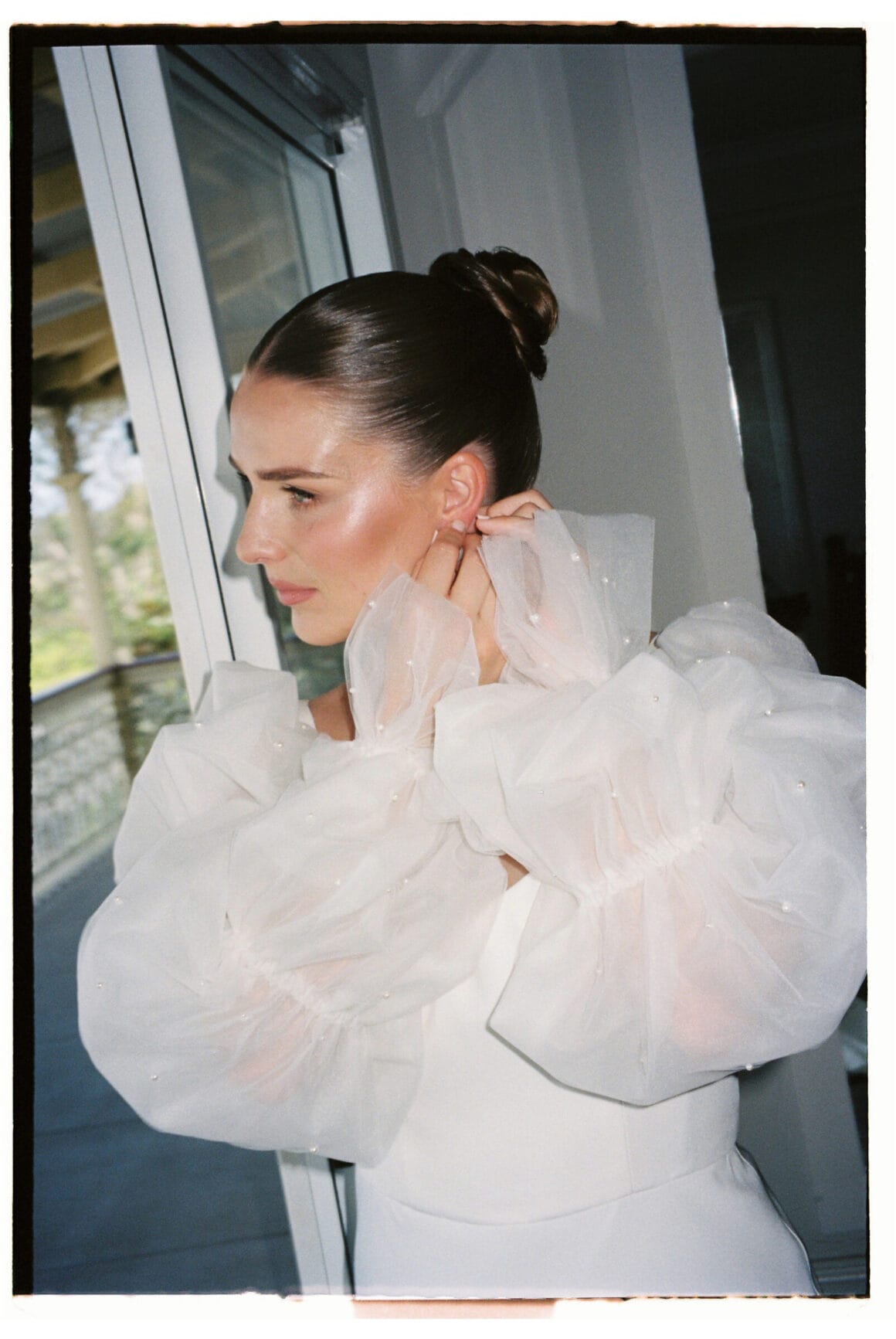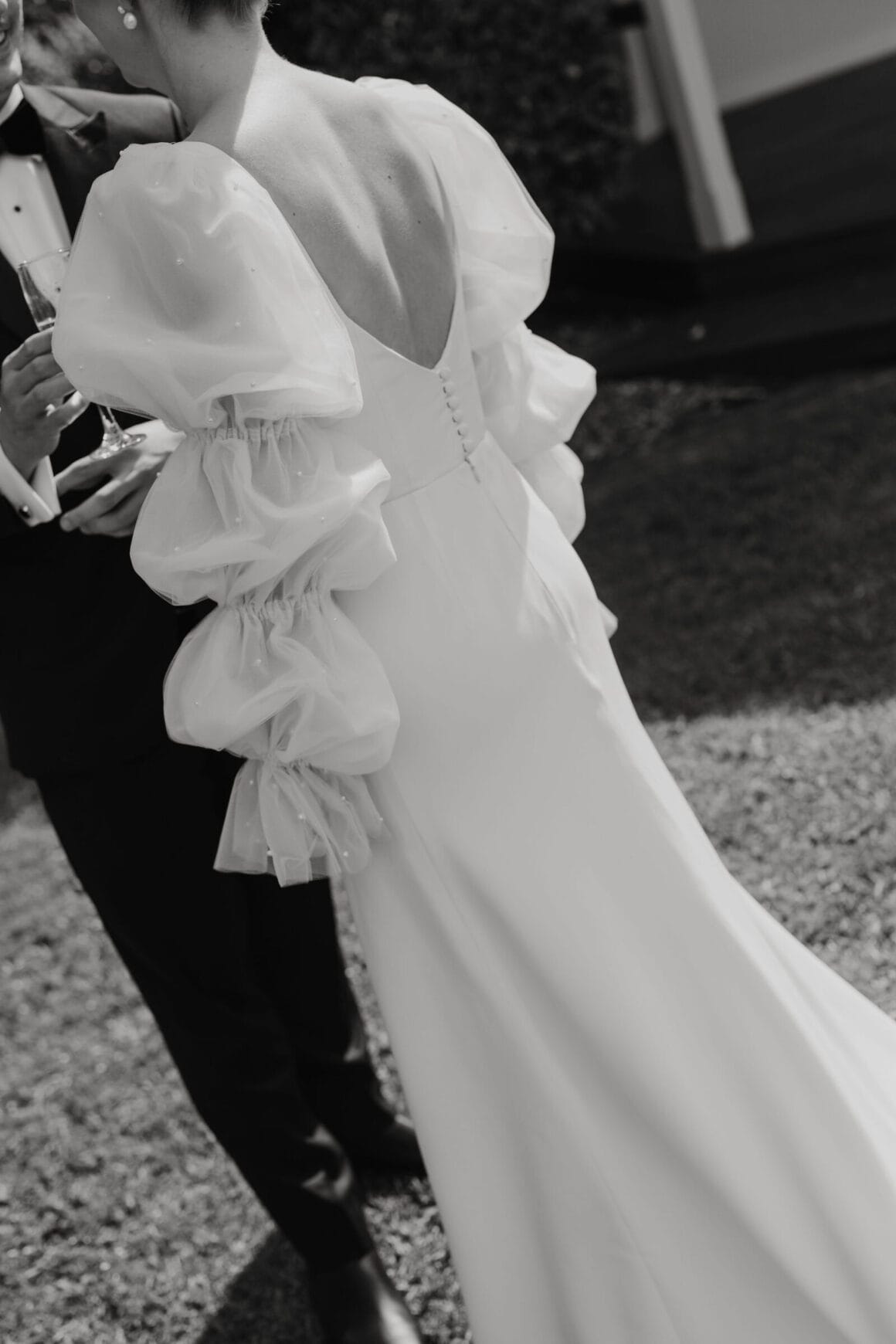 THE DRESS “I came across a photo on Pinterest of these stunning, dramatic sleeves and was instantly hooked. I visited a few stores and tried on different styles, but in the end, I knew those sleeves were exactly what I wanted. [For me], going to a dressmaker and having something custom-made just felt like a risk worth taking. Working with Susan [Ogg] was an absolute delight, and the whole process was so much fun.”