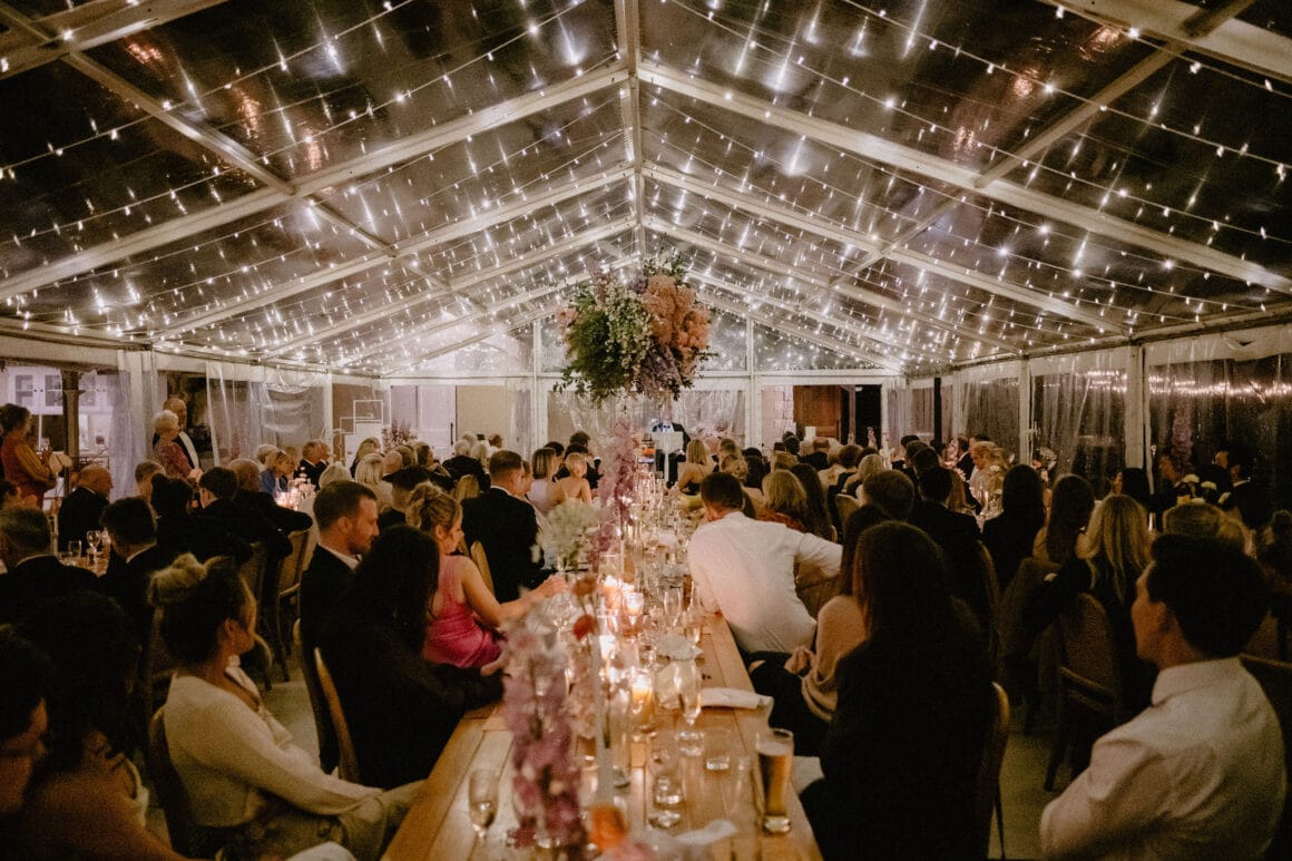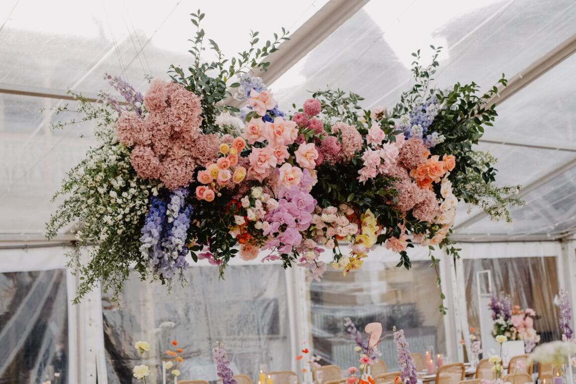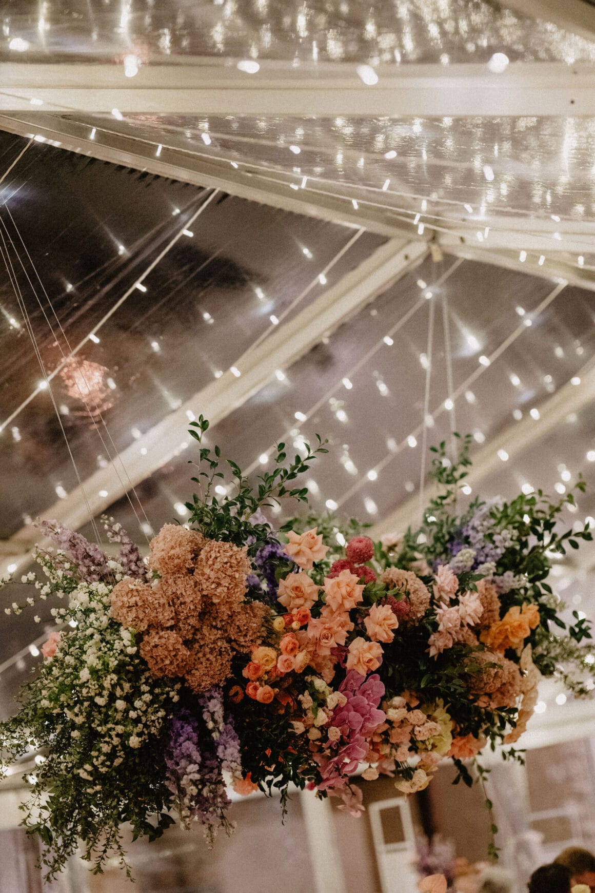 FAVE DETAILS “Prioritising meaningful conversations with friends, we decided to keep the tables uncluttered, opting for a striking hanging feature in the centre of the marquee, complemented by smaller table accents to encourage easy chatting. The florals took our breath away, and we don’t believe that the day would have been the same without the team from Mondo Floral Designs.