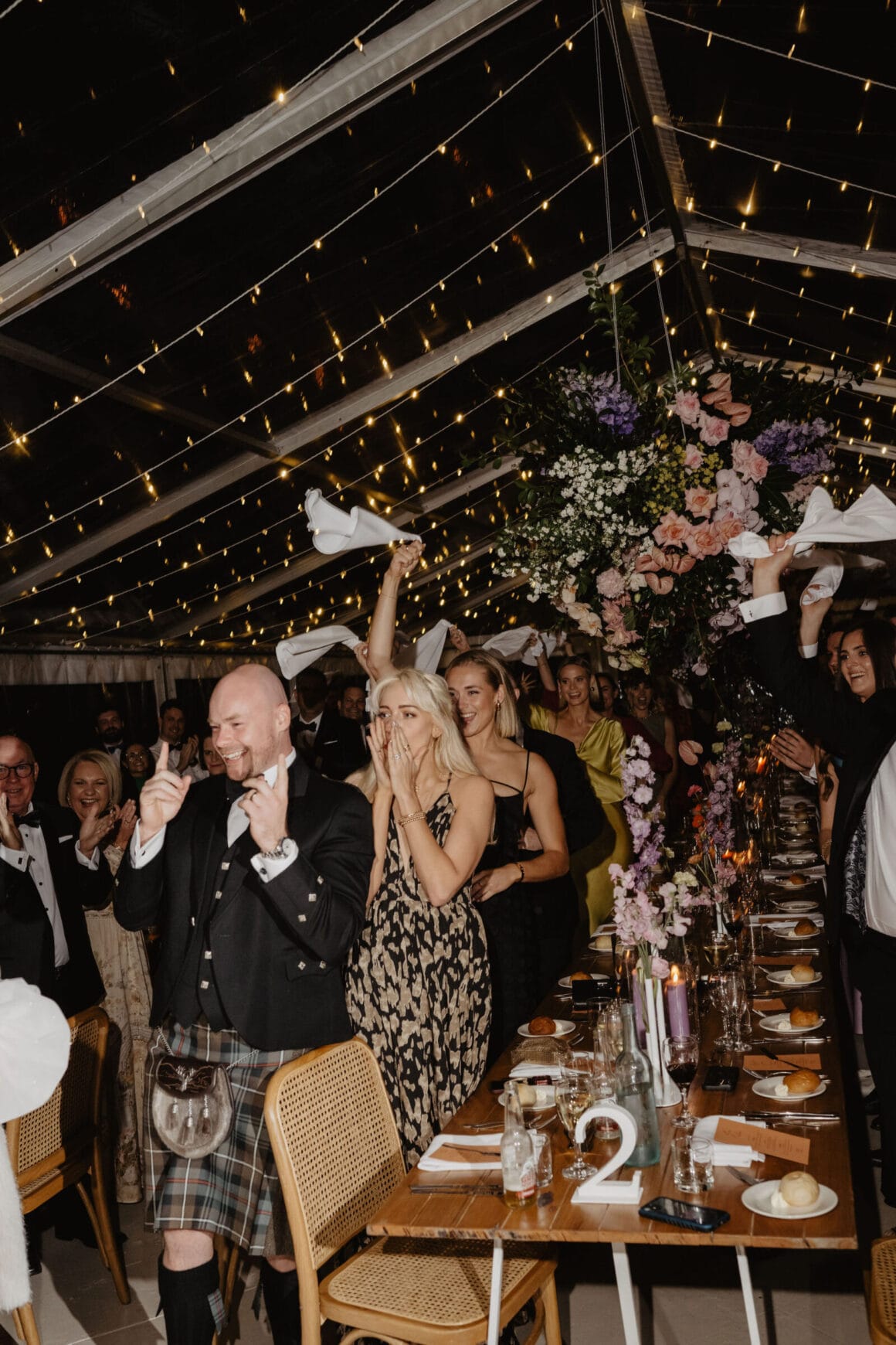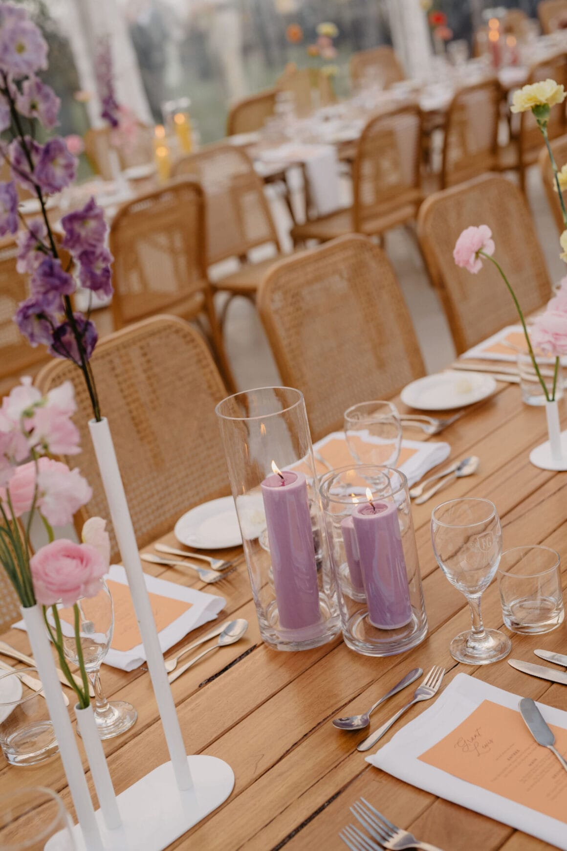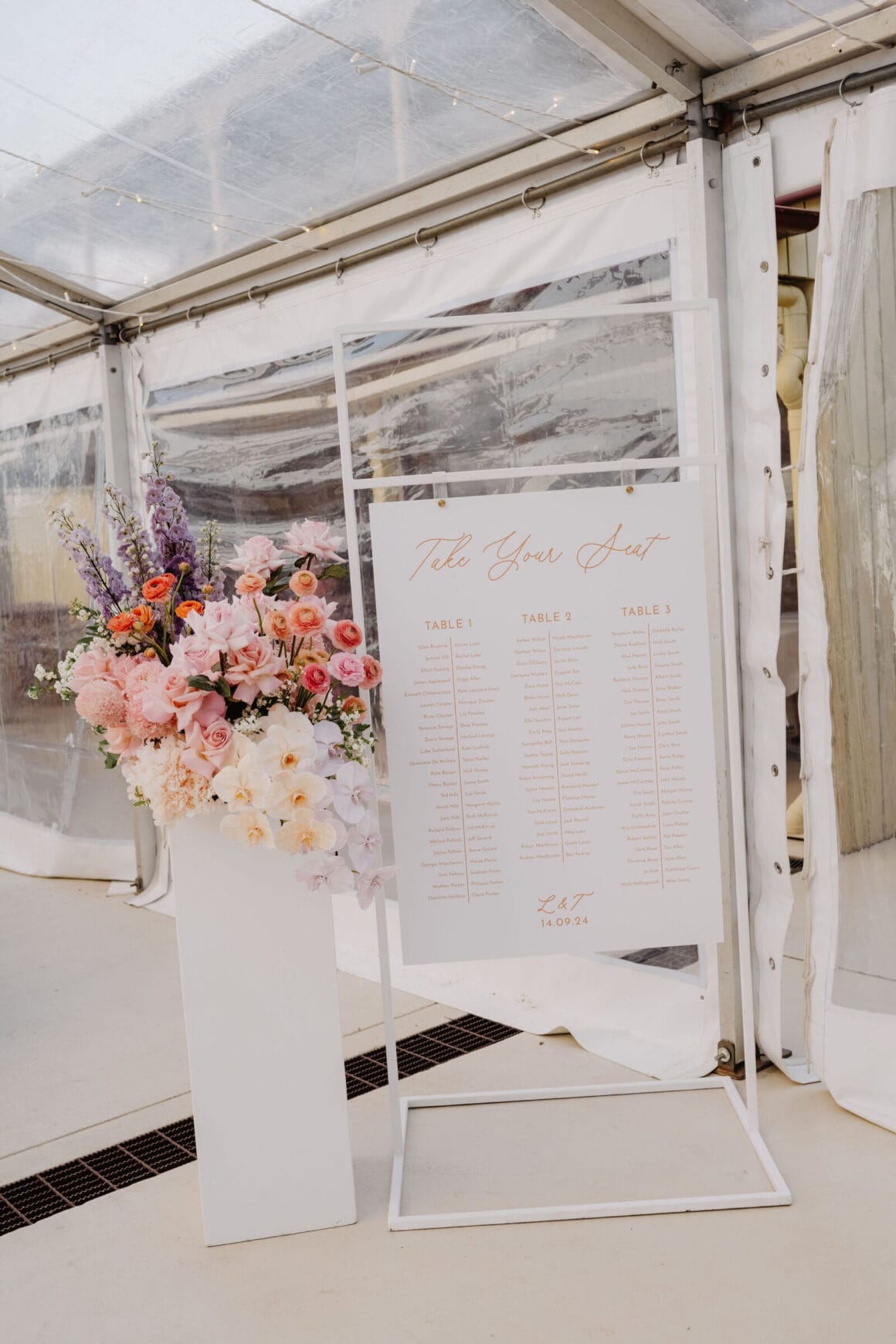 FAVE DETAILS “Prioritising meaningful conversations with friends, we decided to keep the tables uncluttered, opting for a striking hanging feature in the centre of the marquee, complemented by smaller table accents to encourage easy chatting. The florals took our breath away, and we don’t believe that the day would have been the same without the team from Mondo Floral Designs.