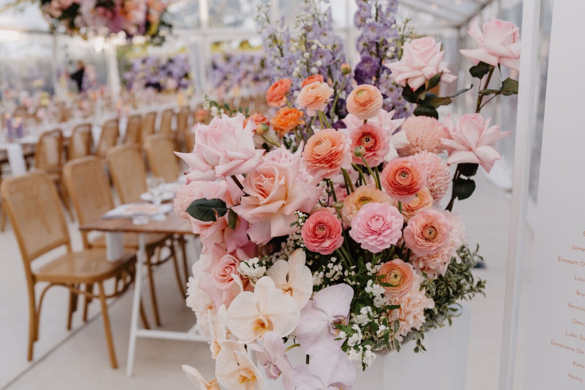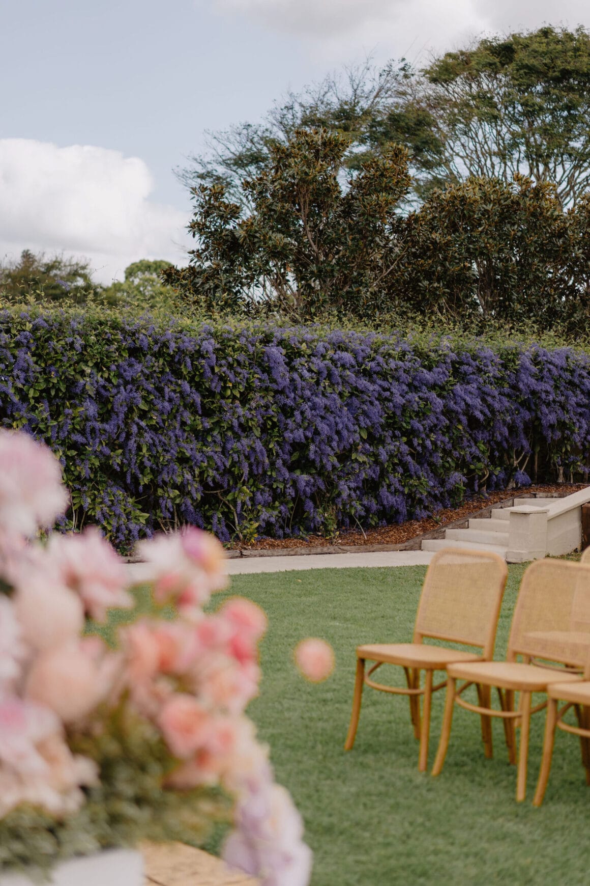 THE VENUE “Growing up on the Sunshine Coast, Lily has always loved the hinterland. With limited venues in the area that can host more than 120 guests, and knowing their numbers would exceed that, we needed a flexible option. Flaxton Gardens offered just that, with its adaptable set-up. The purple floral wall, marquee, and on-site accommodation sealed the deal.”