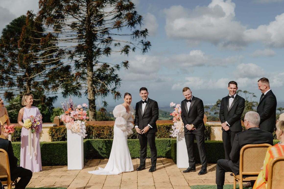 CONTRIBUTING VENDORS Photographer Taylor Kezia Stylist, Stationery & Signage LoveBird Weddings Florist Mondo Floral Designs Venue & Catering Flaxton Gardens Cake Maker Petal + Peach Wedding Favours Limitless Promotions, DIY Entertainment Birdman Randy and the Ivory Street Preachers Celebrant Jay Flood – Noosa Style Ceremonies Rings A.G Designer Jewellers Transport Hinter-Coast Transport THE BRIDE Bridal Gown Designer Susan Ogg Shoes Billini Accessories The Traveller Series Hair Jaala Brinsmead Makeup Taylor Kimler Fragrance Who is Elijah Bridesmaid Dresses Aje, Significant Other THE GROOM Suit, Tie & Groomsmen Suits Black Jacket Suiting Cufflinks Hugo Boss Shoes R.M. Williams Watch TAG Heuer Barber / Grooming Ant – Honcho’s Barbershop Groomsmen Gifts R.M. Williams