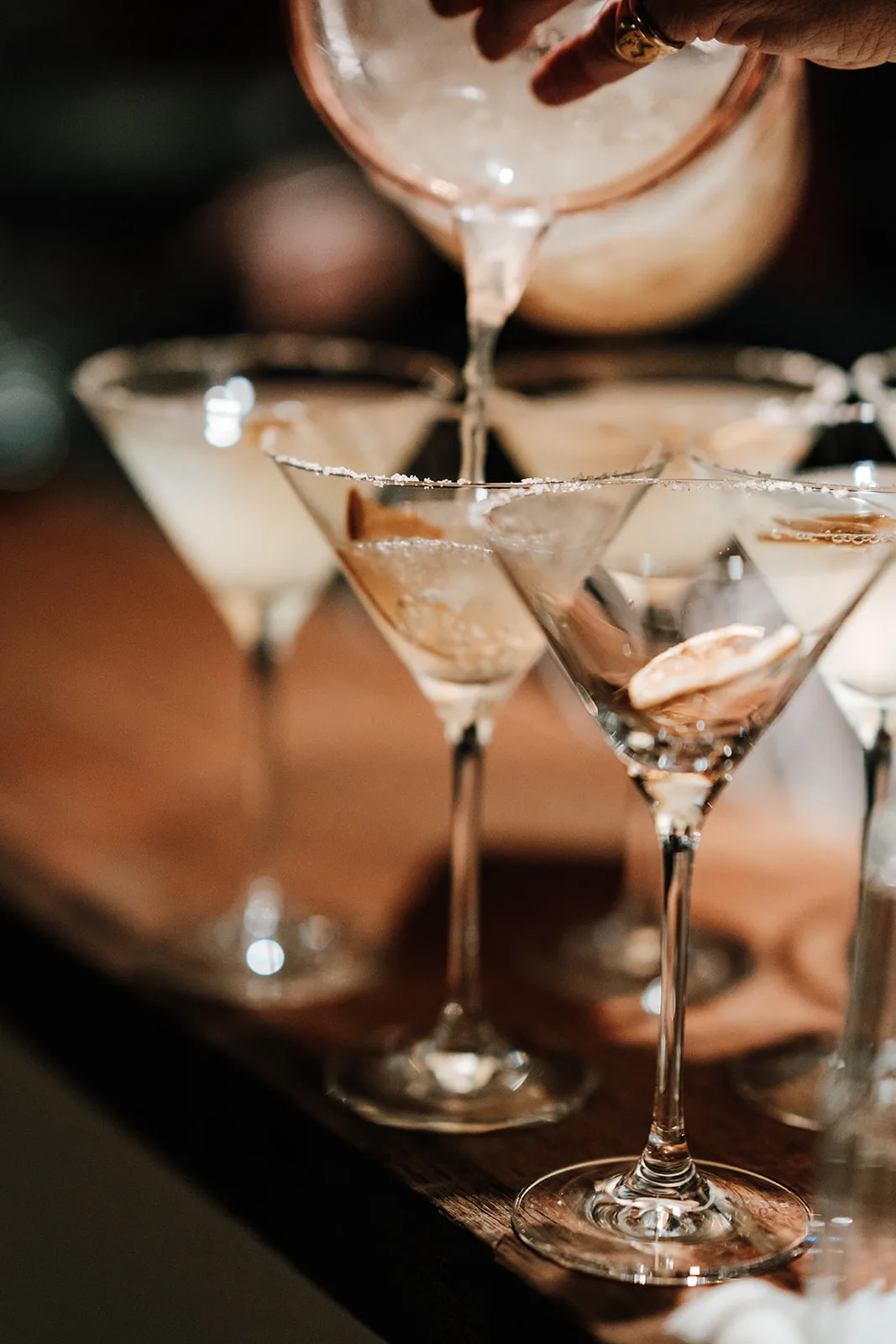 FAVE DETAILS “Rather than purchasing jewellery, I wanted to wear the laser-cut cherry blossom earrings Joel had hand-made for me many years ago. These also fit in with our natural aesthetic of timber and greens. For Joel, I hand-made his button holes after [we designed them together]. We also crafted flower collars for two of our cats using silk flowers. Other details on the day we created were our cake topper, honeymoon signing game and the bar sign. These items reflected our shared loves in life, our cats, travel and good cocktails.