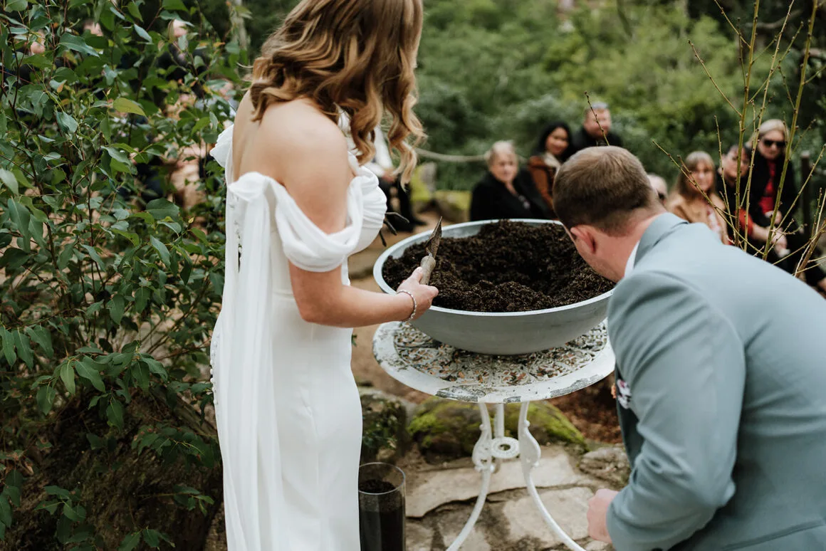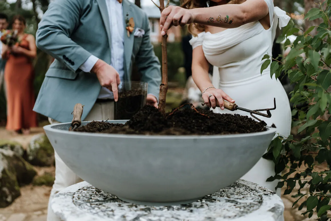 COOL CUSTOM “To incorporate our love of Japan, we planted a Japanese plum blossom during our ceremony. There is a Japanese practice where well wishes are written on strips of paper and tied to a branch. This practice stems from a festival [that] celebrates two star-crossed lovers. During our ceremony, after planting our tree, we both wrote a well wish and tied this to our tree. We then asked our parents and bridal party to write their own well wishes and tie this to the tree. After the ceremony, remaining guests could do the same.”