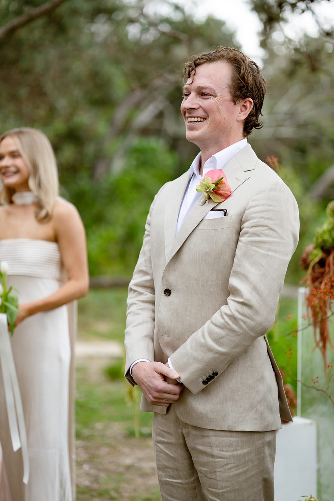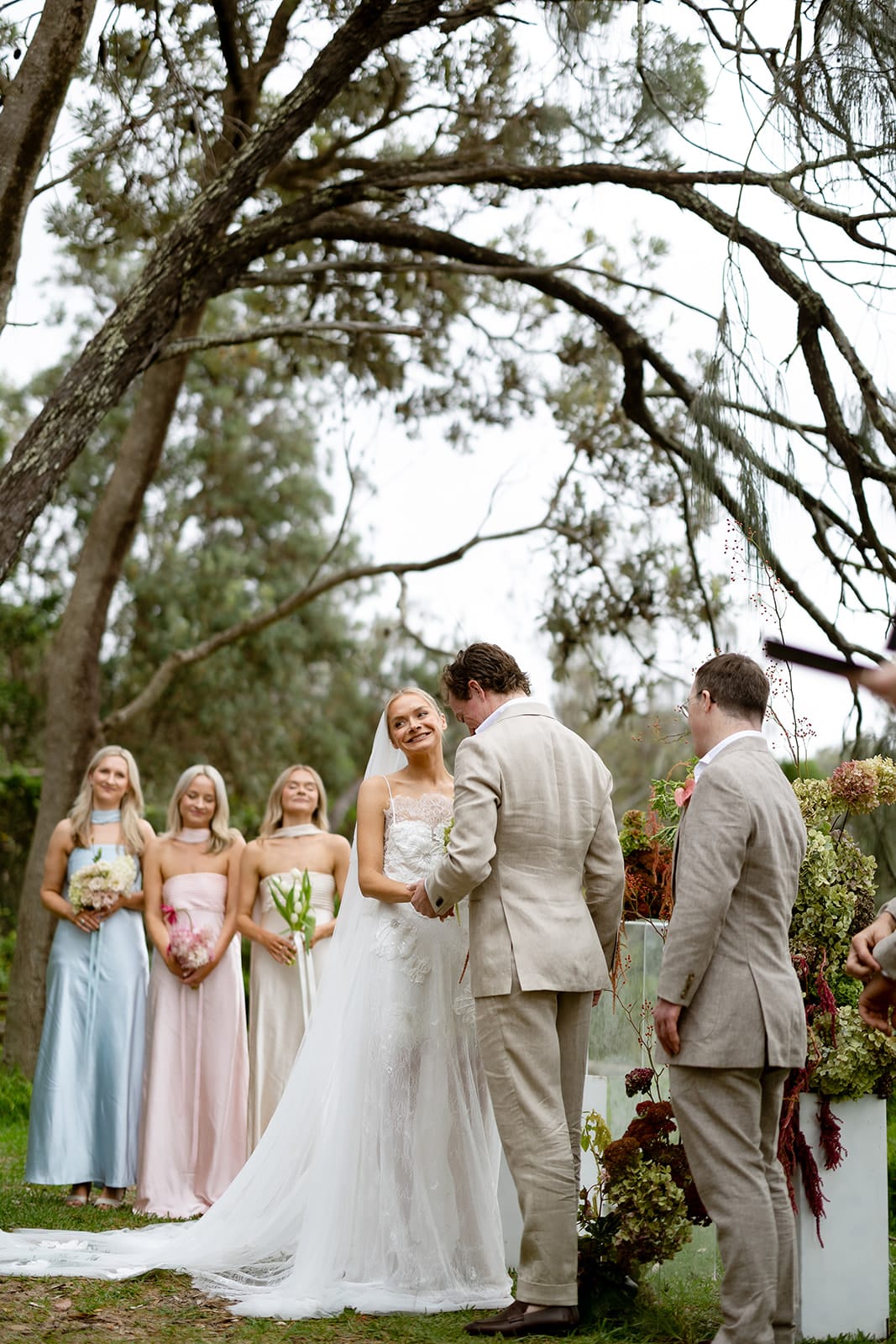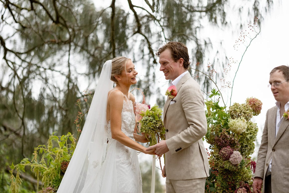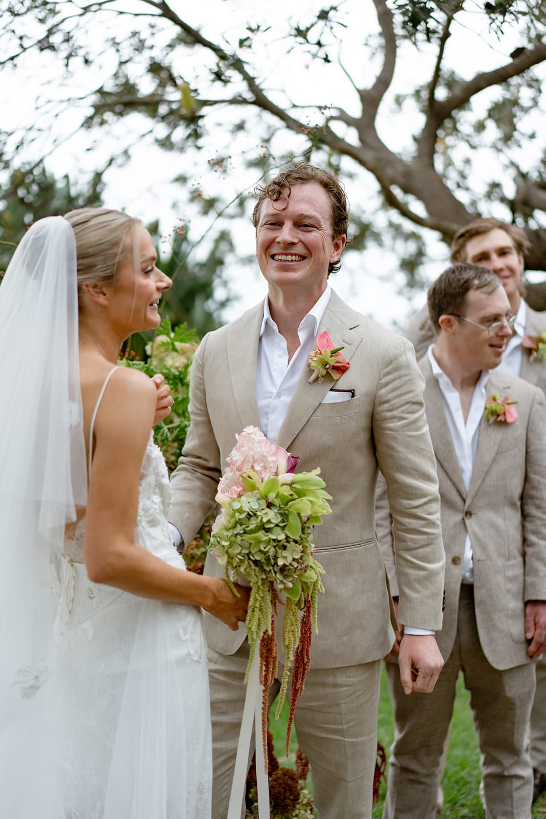 It was a day of easy-going, contemporary coastal elegance, and the lovebirds set the tone – Louis in a textured, light-toned Oscar Hunt suit, and Lucy in a Grace Loves Lace sheer stunner, complete with floral lace details.