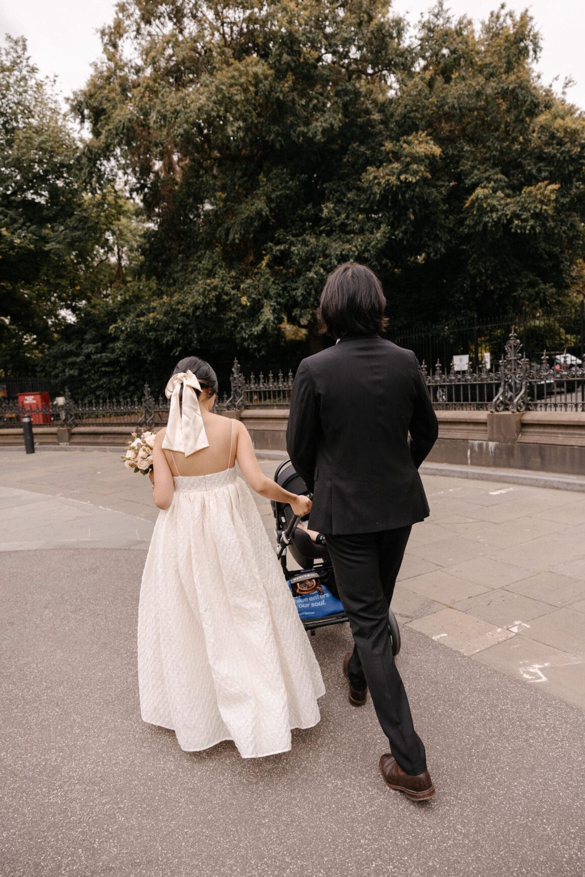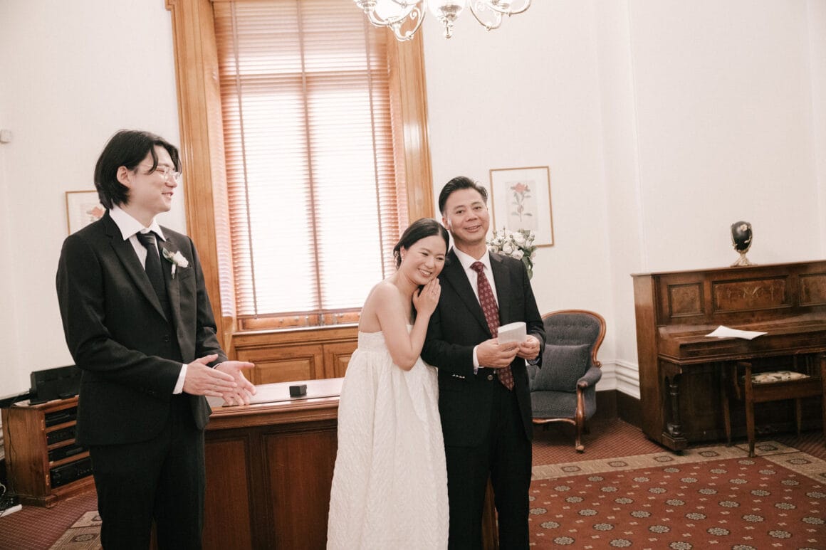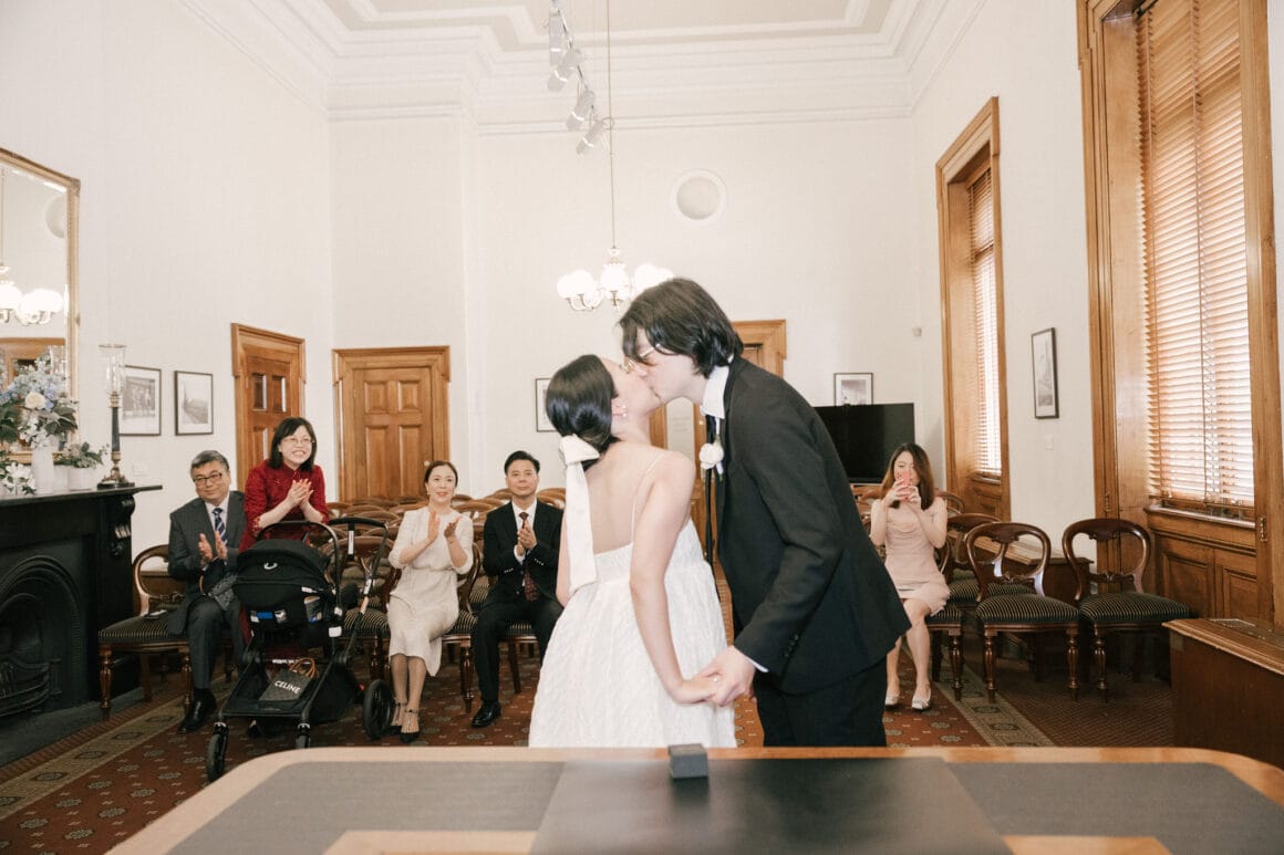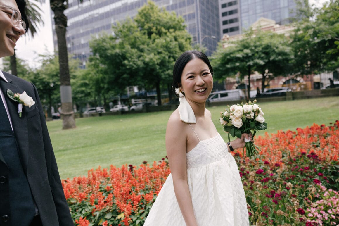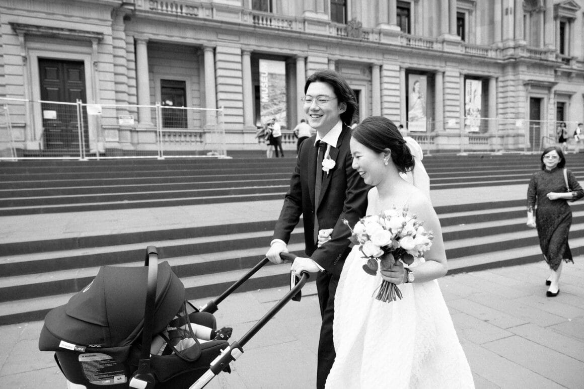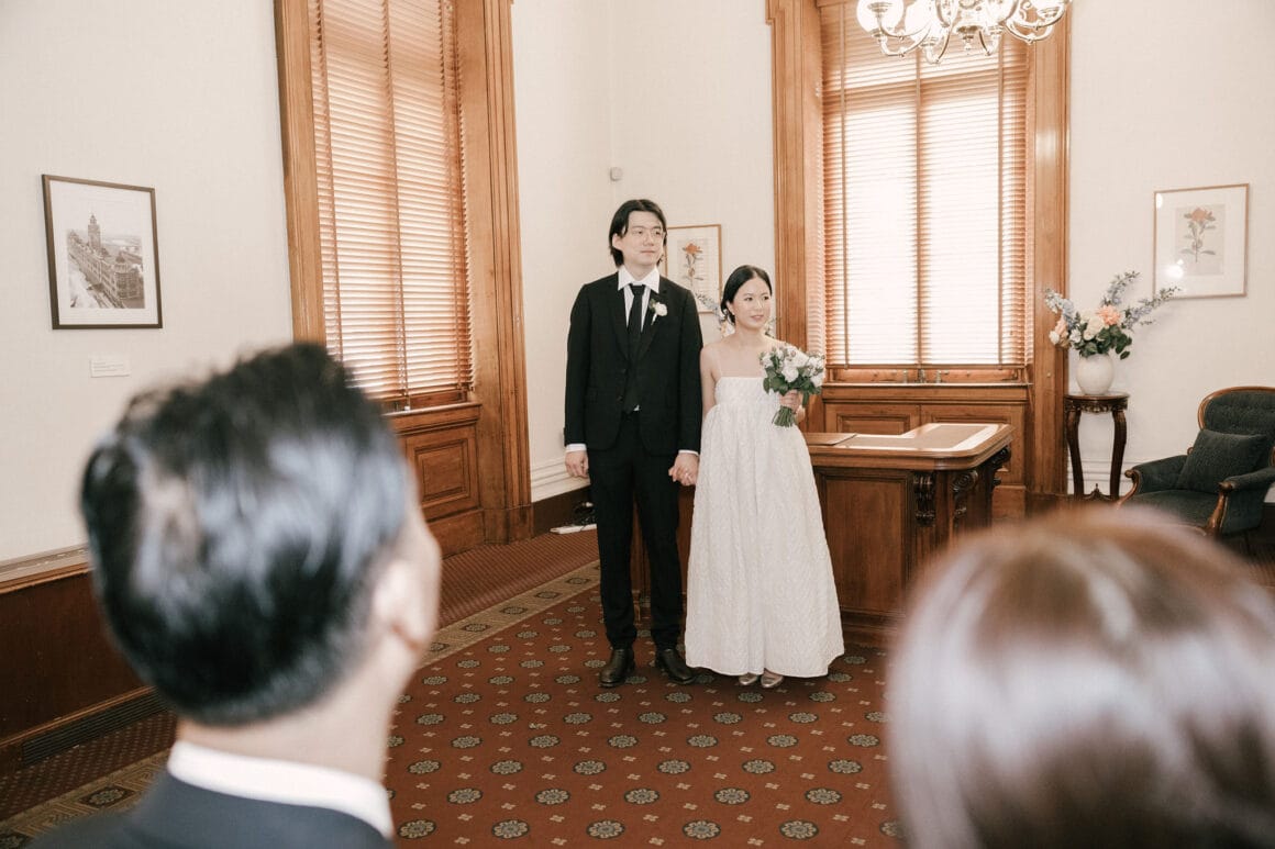 “Oh, we were late to the Treasury Building, worried we might miss our appointment and not be able to get married! We ran to the building, pushing our son in his pram. It was hilarious—and somehow totally symbolic of us as a post-COVID couple. We struggled and felt overwhelmed as new parents, but we loved and supported each other every step of the way. We’d been completely buried in the full-time job of caring for this tiny human, with little time just for us. But that day reminded us where we came from, and even with the added complexity in our relationship, it only made us stronger.”