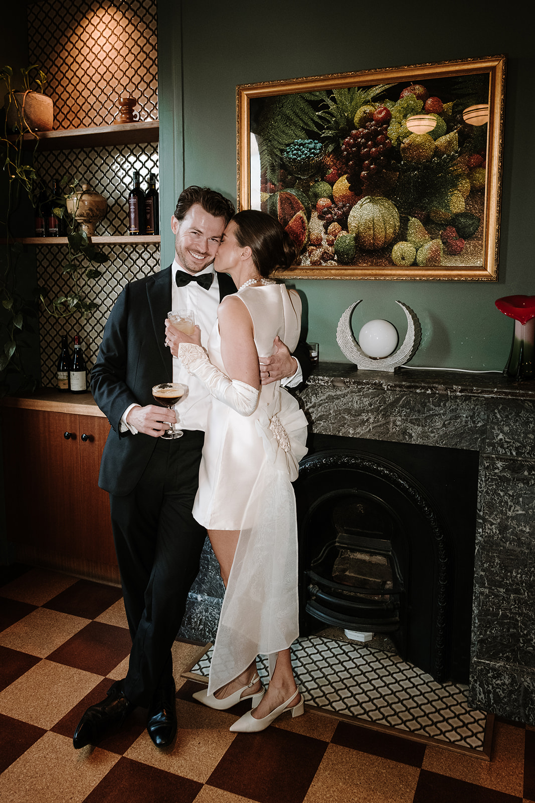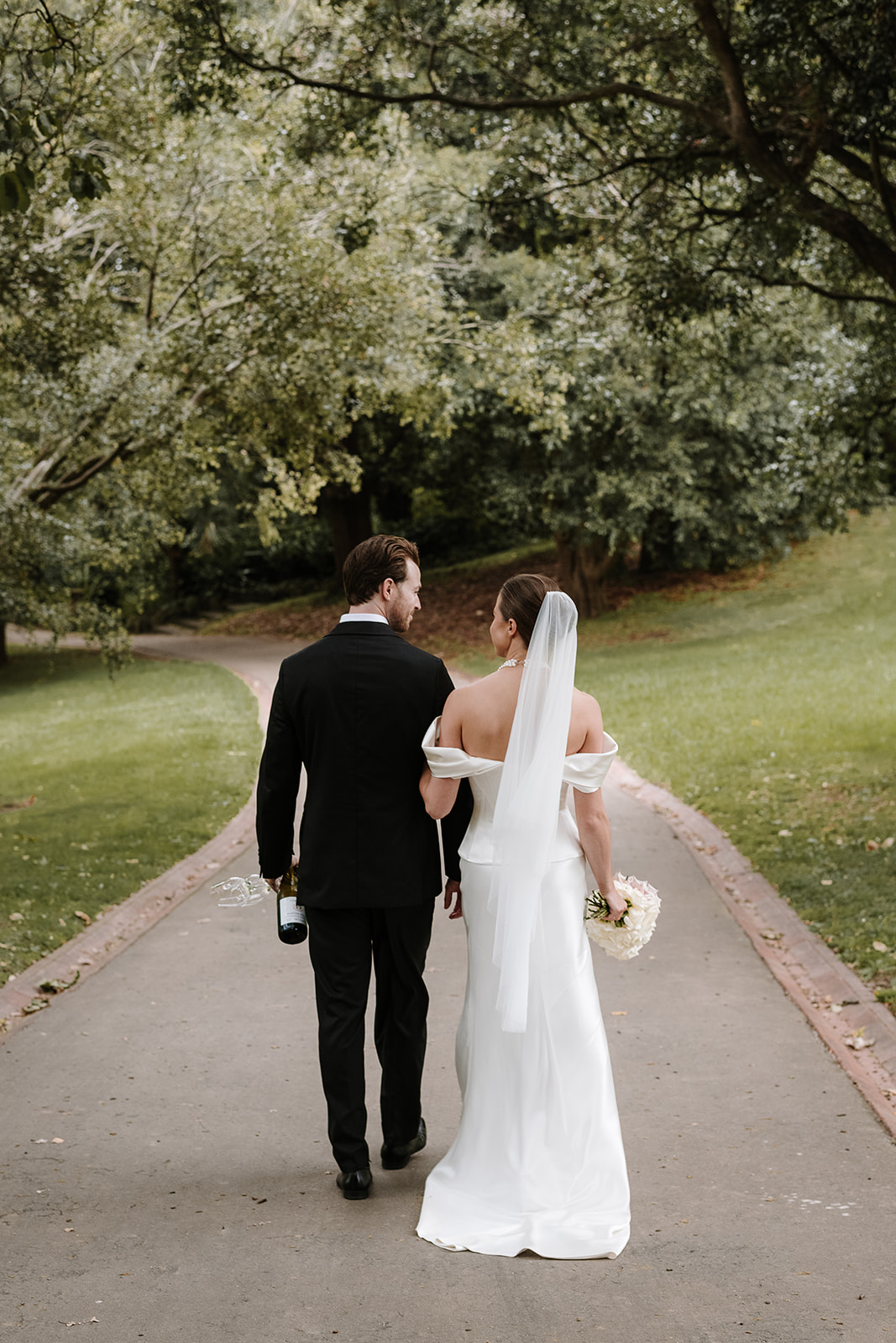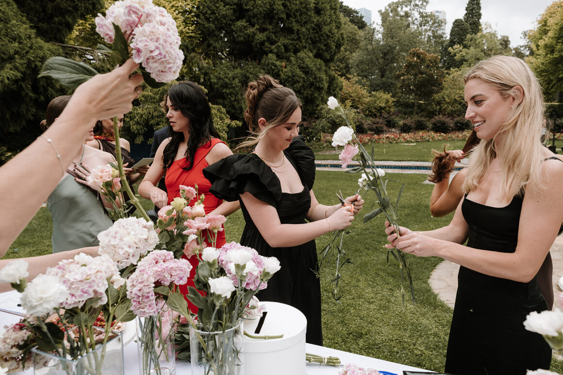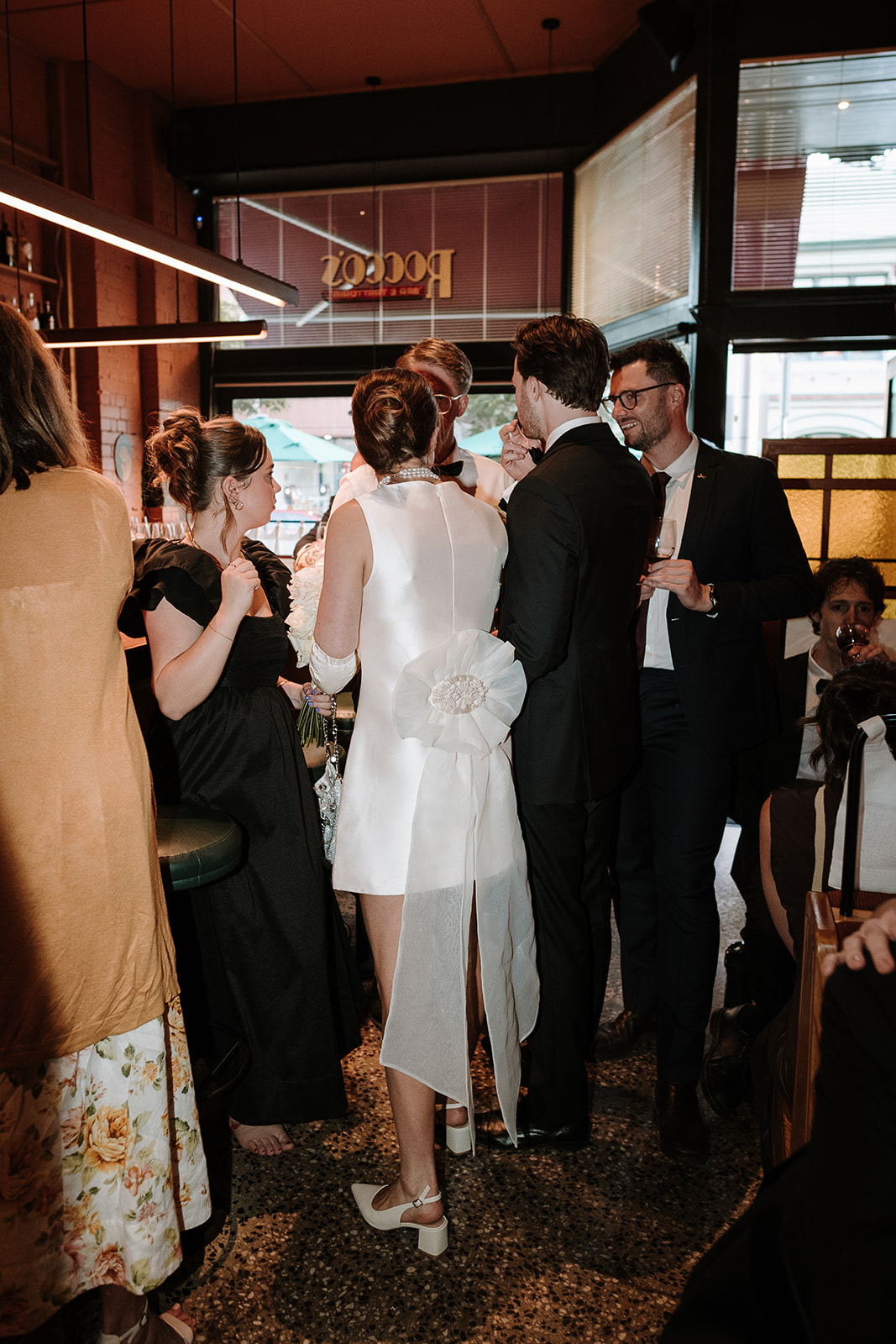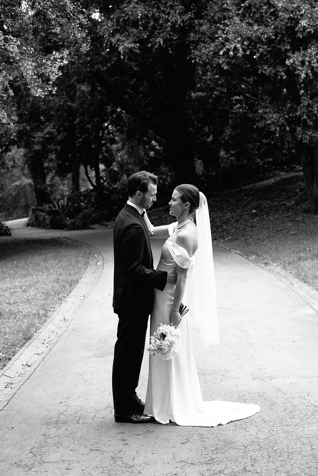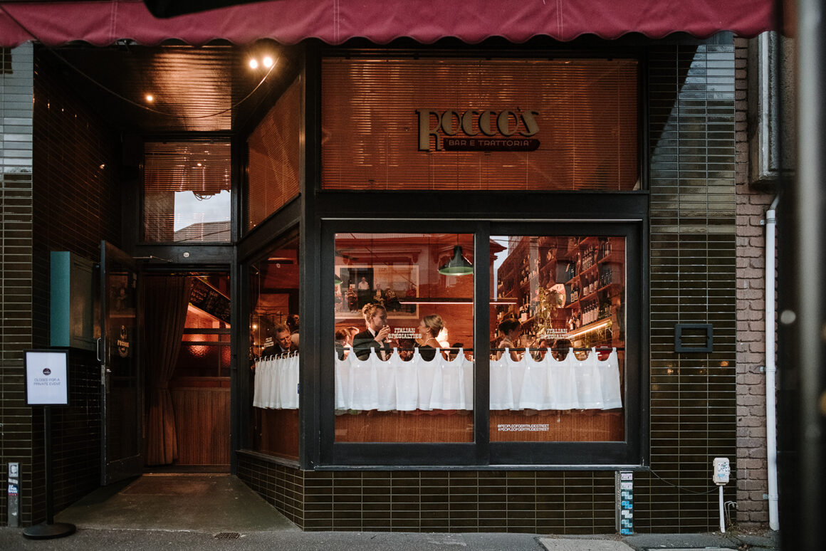 The Pioneer Women’s Garden was an easy decision for the ceremony; it’s a central, intimate garden flanked by flowers and a bubbling fountain. We wanted the reception space to feel like an authentic Melbourne establishment; somewhere warm and brimming with personality, with a superb wine list, excellent food and the kind of interiors you could lean into without obscuring with your own decorations. Crucially, it needed to offer multiple spaces as opposed to one big hall; where you could park up for cocktails at a retro bar, sink meatball subs on the balcony under the stars, or squeeze yourself into a room with a live band and heaving dancefloor. Rocco’s delivered on all fronts (and more).”